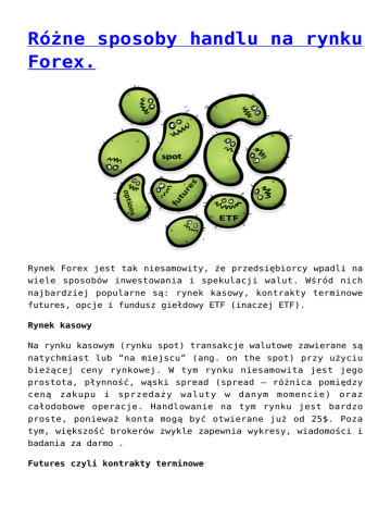 Różne sposoby handlu na rynku Forex. Rynek Forex jest tak niesamowity, że przedsiębiorcy wpadli na wiele sposobów inwestowania i spekulacji walut. Wśród nich najbardziej popularne są: rynek kasowy, kontrakty terminowe futures, opcje i fundusz giełdowy ETF (inaczej ETF). Rynek kasowy Na rynku kasowym (rynku spot) transakcje walutowe zawierane są natychmiast lub “na miejscu” (ang. on the spot) przy użyciu bieżącej ceny rynkowej. W tym rynku niesamowita jest jego prostota, płynność, wąski spread (spread – różnica pomiędzy ceną zakupu i sprzedaży waluty w danym momencie) oraz całodobowe operacje. Handlowanie na tym rynku jest bardzo proste, ponieważ konta mogą być otwierane już od 25$. Poza tym, większość brokerów zwykle zapewnia wykresy, wiadomości i badania za darmo . Futures czyli kontrakty terminowe Futures to kontrakty kupna lub sprzedaży określonego aktywu po określonej cenie w przyszłym terminie (dlatego nazywane są Futures – od angielskiego zwrotu future, czyli przyszłość.). Od kiedy kontrakty futures są znormalizowane i sprzedawane poprzez scentralizowane wymiany, rynek jest bardzo przejrzysty i dobrze uregulowany. Oznacza to, że cena i informacje o transakcjach są łatwo dostępne. Opcje „Opcja” to instrument finansowy , który daje właścicielowi prawo sprzedaży lub kupna aktywów po ustalonej cenie, w ustalonym okresie, zwanym terminem wykonania opcji. Wystawca opcji jest zobowiązany do sprzedania lub zakupu instrumentu bazowego od nabywcy opcji, jeżeli ten uzna wykonanie opcji za opłacalne. Podobnie jak kontrakty futures, opcje są przedmiotem obrotu na giełdach takich jak np. Chicago Board Options Exchange, Międzynarodowej Giełdzie Papierów Wartościowych oraz Filadelfijskiej Giełdzie Papierów Wartościowych. Wadą opcji Forex jest to, że na rynku są ograniczone godziny handlu dla niektórych opcji i ich płynność nie jest tak wielka jak dla kontraktów terminowych futures lub rynku kasowego (spot). Fundusze ETF Fundusze giełdowe ETF są najmłodszymi członkami rynku Forex. Fundusze ETF mogą zawierać zestaw akcji w połączeniu z niektórymi walutami oraz umożliwiają przedsiębiorcy urozmaicenie jego aktywów. Są one tworzone przez instytucje finansowe i mogą być przedmiotem obrotu, tak samo jak akcje poprzez wymianę. Tak jak w przypadku „opcji” wadą funduszy giełdowych jest to, że rynek nie jest otwarty 24godziny na dobę. Prościej mówiąc, jest to otwarty fundusz inwestycyjny notowany na giełdzie, którego zadaniem jest odzwierciedlanie zachowania się danego indeksu giełdowego. Źródło: http://www.babypips.com/school/preschool/what-is-forex /different-ways-to-trade-forex.html