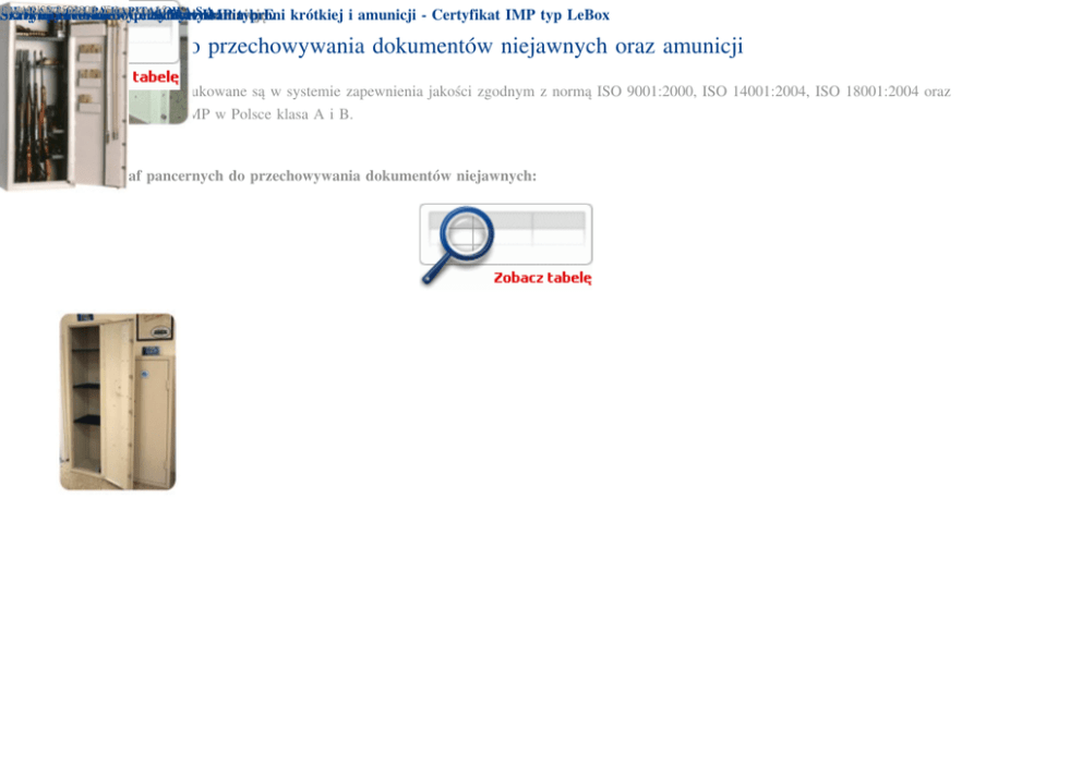 40-611 tel. fax +48Katowice, 32 3593800-05 3593806 ul.zFabryczna 15i B: S.A. GWARANT KAPITAŁOWA -szaf Inne Certyfikat produkty IMP tej klasy kategorii: A Szafki Szafy Skrzynki Rodzaje pancernych myśliwskie pancerne iGRUPA obudowy do -na Certyfikat przechowywania elektryczne broń i IMP amunicję typ broni E krótkiej i amunicji - Certyfikat IMP typ LeBox Szafy pancerne do przechowywania dokumentów niejawnych oraz amunicji Szafy pancerne produkowane są w systemie zapewnienia jakości zgodnym z normą ISO 9001:2000, ISO 14001:2004, ISO 18001:2004 oraz w oparciu o normy IMP w Polsce klasa A i B. Rodzaje szaf pancernych do przechowywania dokumentów niejawnych: