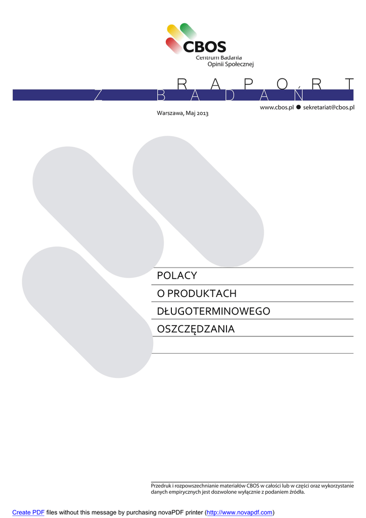 Warszawa, Maj 2013 POLACY O PRODUKTACH DŁUGOTERMINOWEGO OSZCZĘDZANIA Create PDF files without this message by purchasing novaPDF printer (http://www.novapdf.com) Informacja o badaniu Badanie na temat zainteresowania Polaków produktami finansowymi, które służą długoterminowemu oszczędzaniu na przyszłość zostało zrealizowane przez Fundację Centrum Badania Opinii Społecznej (CBOS) na zlecenie Izby Zarządzających Funduszami i Aktywami. Badanie przeprowadzono w dniach 9-15 maja 2013 roku na liczącej 1101 osób reprezentatywnej próbie losowej dorosłych mieszkańców Polski. Było ono częścią majowego omnibusa CBOS. Próba została wylosowana z systemu PESEL. Wywiady zrealizowano metodą face-to-face przy zastosowaniu CAPI (Computer Assisted Personal Interviewing). Strona | 1 Create PDF files without this message by purchasing novaPDF printer (http://www.novapdf.com) Znajomość i korzystanie z produktów finansowych Znajomość produktów finansowych, które mogą służyć długoterminowemu oszczędzaniu np. z myślą o emeryturze nie jest w polskim społeczeństwie duża. Niewielu badanych deklaruje również posiadanie tego typu produktów. Najbardziej popularnym spośród czterech produktów, których dotyczyło badanie, jest obecnie Indywidualne Konto Emerytalne (IKE) – zna go przynajmniej ze słyszenia 63% dorosłych Polaków. Prawie połowa badanych słyszała o Programach Systematycznego Oszczędzania (PSO) i Indywidualnych Kontach Zabezpieczenia Emerytalnego (IKZE). Najmniej znane są Pracownicze Programy Emerytalne, o których słyszała ponad jedna trzecia badanych. Z deklaracji badanych wynika, że Indywidualne Konta Emerytalne, to nie tylko najbardziej znane, ale także najczęściej wykorzystywane produkty – 28% twierdzi, że wie czym jest ten produkt, choć go nie posiada, a 11% deklaruje jego posiadanie. Posiadanie pozostałych produktów jest znacznie mniej rozpowszechnione, mniej Polaków deklaruje też wiedzę na ich temat. RYS. 1. Czy wie Pan(i), czym są następujące produkty: Wiem, czym jest ten produkt i posiadam go Wiem, czym jest ten produkt, ale go nie posiadam Kojarzę tylko nazwę tego produktu, ale nie wiem dokładnie, czym jest Nigdy o tym nie słyszałem/-łam Odmowa odpowiedzi Indywidualne Konto Emerytalne (IKE) 11 28 Programy Systematycznego Oszczędzania (PSO) 3 21 Indywidualne Konto Zabezpieczenia Emerytalnego (IKZE) 3 20 Pracownicze Programy Emerytalne (PPE) 3 16 24 23 23 20 36 (%) 1 52 1 54 1 61 Przeprowadzone analizy wielozmiennowe1 wykazały, iż zarówno wiedzę, jak i korzystanie z wymienionych w pytaniu produktów różnicuje przede wszystkim poziom wykształcenia badanych, ich wiek oraz sytuacja na rynku pracy. 1 Wykorzystano moduł IBM SPSS Decision Trees. Strona | 2 Create PDF files without this message by purchasing novaPDF printer (http://www.novapdf.com) Wiedza o istnieniu wszystkich wymienionych produktów jest najbardziej rozpowszechniona wśród osób z wyższym wykształceniem. Badani z tej grupy także najczęściej deklarują, że wiedzą, czym konkretnie są te produkty, jednak jedynie w przypadku IKE osoby z grupy najlepiej wykształconych znacząco częściej niż pozostali badani deklarują posiadanie tego produktu. Wiek najmniej różnicuje wiedzę o Programach Systematycznego Oszczędzania, choć warto zauważyć, iż najmniej osób deklarujących wiedzę na ich temat jest wśród osób poniżej 25 roku życia. Wiedzę o IKE najczęściej deklarują osoby w wieku 25-54 lata, a IKZE w niemal równym stopniu znane jest badanym w kategoriach wiekowych z przedziału 25-64 lata, natomiast znacznie rzadziej wiedzę, czym jest ten produkt deklarują osoby, które nie ukończyły 25 lat. Wiedzę na temat PPE najczęściej deklarują osoby będące w wieku 45-54 lata, natomiast na czym polegają te programy wiedzą jedynie nieliczne osoby, które nie przekroczyły 24 roku życia. Poziomem deklarowanej wiedzy na temat IKE, IKZE, PPE i PSO pozytywnie wyróżniają się osoby zajmujące stanowiska kierownicze, specjaliści z wyższym wykształceniem oraz pracownicy administracyjno-biurowi. Warto też zwrócić uwagę, iż niskim stopniem poinformowania o IKE, IKZE, PPE i PSO wyróżniają się na tle innych grup zawodowych rolnicy indywidualni, natomiast osoby prowadzące działalność gospodarczą poza rolnictwem zasadniczo nie różnią się pod tym względem od ogółu badanych. Brak wiedzy o tych produktach dominuje także wśród emerytów i rencistów, a więc osób, które nie są już aktywne zawodowo i najprawdopodobniej nie wrócą już na rynek pracy. Strona | 3 Create PDF files without this message by purchasing novaPDF printer (http://www.novapdf.com) Tabela 1 Czy wie Pan(i), czym są następujące produkty: - Indywidualne Konto Emerytalne (IKE)? Wiem, czym jest ten produkt i posiadam go Wiem, czym jest ten produkt, ale go nie posiadam Kojarzę tylko nazwę tego produktu, ale nie wiem dokładnie, czym jest Nigdy o tym nie słyszałem/ -łam Odmowa odpowiedzi 18-24 lata 7% 21% 31% 40% 2% 25-34 15% 34% 24% 25% 2% 35-44 12% 35% 27% 26% 0% 45-54 17% 35% 22% 25% 0% 55-64 8% 30% 23% 36% 3% 65 lat i więcej 4% 10% 19% 66% 1% Wykształcenie Podstawowe 4% 9% 26% 61% 0% Zasadnicze zawodowe 10% 27% 24% 38% 2% Średnie 13% 32% 25% 29% 1% Wyższe 17% 44% 21% 17% 2% Kadra kier., spec. z wyższym wykszt. 12% 52% 23% 12% 1% Średni personel, technicy 32% 32% 14% 21% 0% Pracownicy adm.-biurowi 24% 52% 9% 10% 5% Pracownicy usług 14% 23% 31% 30% 2% Robotnicy wykwalifikowani 15% 32% 30% 22% 1% Robotnicy niewykwalifik. 10% 28% 22% 39% 0% Rolnicy 2% 16% 27% 54% 2% Pracujący na własny rach. 14% 25% 22% 38% 2% Renciści 7% 20% 21% 52% 1% Emeryci 4% 15% 22% 59% 1% Uczniowie i studenci 5% 20% 34% 40% 1% Bezrobotni 14% 31% 22% 33% 0% Gospodynie domowe i inni 5% 30% 27% 36% 3% Wiek Grupa społ.zaw. pracujący Bierni zawodowo Strona | 4 Create PDF files without this message by purchasing novaPDF printer (http://www.novapdf.com) Ta
