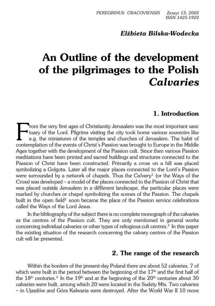 PEREGRINUS CRACOVIENSIS Zeszyt 13, 2002 ISSN 1425−1922 Elżbieta Bilska−Wodecka An Outline of the development of the pilgrimages to the Polish Calvaries 1. Introduction F rom the very first ages of Christianity Jerusalem was the most important sanc tuary of the Lord. Pilgrims visiting the city took home various souvenirs like e.g. the miniatures of the temples and churches of Jerusalem. The habit of contemplation of the events of Christ’s Passion was brought to Europe in the Middle Ages together with the development of the Passion cult. Since then various Passion meditations have been printed and sacred buildings and structures connected to the Passion of Christ have been constructed. Primarily a cross on a hill was placed symbolizing a Golgota. Later all the major places connected to the Lord’s Passion were surrounded by a network of chapels. Thus the Calvary1 (or the Ways of the Cross) was developed – a model of the places connected to the Passion of Christ that was placed outside Jerusalem in a diffferent landscape, the particular places were marked by churches or chapel symbolizing the scenes of the Passion. The chapels built in the open field2 soon became the place of the Passion service celebrations called the Ways of the Lord Jesus. In the bibliography of the subject there is no complete monograph of the calvaries as the centres of the Passion cult. They are only mentioned in general works concerning individual calvaries or other types of reliogious cult centres.3 In this paper the existing situation of the research concerning the calvary centres of the Passion cult will be presented. 2. The range of the research Within the borders of the present−day Poland there are about 52 calvaries, 7 of which were built in the period between the beginning of the 17th and the first half of the 18th centuries.4 In the 19th and at the beginning of the 20th centuries about 30 calvaries were built, among which 20 were located in the Sudety Mts. Two calvaries – in Ujazdów and Góra Kalwaria were destroyed. After the World War II 10 more Elżbieta Bilska−Wodecka 120 were constructed and new calvaries are still being built. During the war the calvary in Ujście n/Notecią was demolished. Due to the border change the calvaries in Krzeszów and Wambierzyce together with the Sudety Mts calvaries are now in Poland and the calvaries built in Lithuania are now outside the borders of the country. 3. The calvary as a centre of the Passion cult Most of the calvaries became well−known centres of a religious cult from the very beginning of their existence. The most frequently visited by pilgrims calvary type Passion Sanctuaries in Europe are: Kalwaria Zebrzydowska, Linz, Graz, St Radegund, Varalo Sesia, Domodossola, Pakość n/Notecią, Wejherowo, Góra Świętej Anny, Kalwaria Pacławska, Glotowo. The tradition of pilgrimages to the Slovakian calvaries in Presov and Banska Szczawnica as well as to the Lithuanian calvary in Werki (now a district of Vilnius) has recently been revived. The calvaries with a combined cult of the Passion and of the Holy Virgin are classified as Marian Sanctuaries. They are most of all Polish calvaries, among others: Góra Świętej Anny, Krzeszów, Wambierzyce, Piekary Śląskie and Sacro Monte in Varallo Sesia (Italy). In the hitherto research concerning the pilgrimage movement to the Sanctuaries of the Lord the category ‘pilgrimages to the calvaries’ has not yet been distinguished. According to Neundorfer5 this kind of pilgrim movement cannot be classified as one sort of pilgrimages because the calvary is a very complex object. Thus the pilgrimages to calvaries can be classified as the Passion pilgrimages. The pilgrimeges to calvaries where relics are deposited can also be included among the pilgrimages to the places with relics. Tab. 1. The typology of the pilgrimages according to B. Neundorfer Source: B. Neundorfer (1963). An Outline of the development of the pilgrimages to the Polish Calvaries 121 Every calvary is a place for meditation upon the Passion of Christ but not all of them are sanctuaries. Among 52 calvaries 26 are in relation to a religious cult centre. Some of them are independent centres of the cult of the Passion of Christ while the others play only an additional role in the pastoral and missionary programme of the centre of the cult of the Holy Virgin or a saint. 3.1. Calvarian sanctuaries in the 17th and 18th centuries. The Baroque era was a second period after the Middle Ages when a special attention was paid to the Christ’s Passion what caused the development of new centres of the Passion cult. The characterisic feature of the religiousness of those times was the so−called post−Trent religiousness. In the case of some religious habits the return to medieval practice could have been observed. Next to the Marian cult some forms of the Passion cult were introduced. A new type of religious cult that emerged in Poland were calvaries. The calvary foundations started a new type of pilgrimages that replaced the expensive pilgrimages to the Holy Land.6 Especially in the 17th century when a great raise of piety and religiousness took place in Poland, calvaries competed with the Marian Sanctuaries.7 Kalwaria Zebrzydowska The Cracow voivode Mikołaj Zebrzydowski founded the first Polish calvary based on a Jerusalem model. The church under the invocation of the Crucifixion was built in the years 1600−1602 and later also the chapel of the Holy Sepulchre was built. Until the death of the founder in 1620 21 churches and chapels were built after a project of the Italian Jesuit J.M. Bernardoni and the Flemish architect P.Baudarth. The work was continued by the descendants of Mikołaj Zebrzydowski – his son Jan and his grandson Michał. Together with the founding of the calvary the Bernardine Fathers were brought in 1602 to provide care and ministration of the faithful. Kalwaria Zebrzydowska (the name can be translated as: the Zebrzydowski Calvar