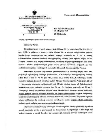 Warszawa, dnia flSczerwca 2016 r. SZTAB G E N E R A L N Y W P ZARZĄD ORGANIZACJI 1 UZUPEŁNIEŃ-P1 atmmsm mai aanui Pan Paweł CEGIEŁKO ul. Chopina 10/7 2016 -06'- 1 o n 20-026 Lublin Dotyczy: informacji o sposobie załatwienia petycji Szanowny Panie, Na podstawie art. 13 ust. 1 ustawy z dnia 11 lipca 2011 r. o petycjach (Dz. U. z 2014 r. poz. 1195) w związku z petycją z dnia 17 maja br. w sprawie zainicjowania procesu legislacyjnego zmierzającego do nadania nowego brzmienia art 3 ust. 1 ustawy o powszechnym obowiązku obrony Rzeczypospolitej Polskiej (data wpływu petycji do tut. Zarządu 7 czerwca br.), pragnę poinformować, że Pańską inicjatywę postrzega się jako próbę wsparcia działań podejmowanych przez resort obrony narodowej mających na celu doskonalenie regulacji określających zadania Sił Zbrojnych Rzeczypospolitej Polskiej. Doceniając wymowę argumentów przedstawionych w złożonej petycji oraz treść propozycji legislacyjnej, wymaga podkreślenia, iż Konstytucja Rzeczypospolitej Polskiej z dnia 1997 r. (Dz. U. Nr 78, poz. 483, zpóźn. zm.), zwana dalej „Konstytucją", określa wyłącznie zadania, do jakich powołane są Siły Zbrojne Rzeczypospolitej Polskiej (art. 26 ust. 1) i wprowadza gwarancje apolityczności tych Sił jako wiodącą zasadę ich funkcjonowania w demokratycznym państwie prawnym (art. 26 ust. 2). Ustalając znaczenie art. 26 ust. 1 Konstytucji, należy przypomnieć pojęcia zadań i kompetencji organów władzy publicznej. Pojecie zadania oznacza kierunek działania, cel organu państwowego. Pojecie kompetencji w prawie konstytucyjnym oznacza natomiast konkretne środki działania przyznane organom władzy publicznej dla realizacji prawnie określonych zadań. Organy władzy publicznej realizują swoie zadania przy pomocy swoich kompetencji. Prawodawca konstytucyjny określając zadania organów władzy publicznej wyznacza sposób czynienia użytku z przyznanych im kompetencji. Kompetencje te nie mogą być wykorzystywane w sposób dowolny, ale wyłącznie dla realizacji prawnie określonych zadań. 2 Konstytucyjne zadania organów władzy publicznej ze swojej istoty nie mają charakteru wyłącznego i powinny być realizowane przez różne organy władzy publicznej i instytucie publiczne, na tyle na ile pozwalają im na to ich kompetencje. Również z dotychczasowego orzecznictwa Trybunału Konstytucyjnego wynika, że Siły Zbrojne RP służą ochronie niepodległości państwa i niepodzielności jego terytorium oraz zapewnieniu bezpieczeństwa i nienaruszalności jego granic. Zachowują one neutralność w sprawach politycznych oraz podlegają cywilnej i demokratycznej kontroli. Przepis Konstytucji regulujący pozycję ustrojową Sił Zbrojnych RP wyróżnia zatem: ich służebność w zakresie zadań realizowanych przez nie w państwie, neutralność w sprawach politycznych oraz podległość cywilnej i demokratycznej kontroli. Przepis ten nakłada na ustawodawcę obowiązek ustanowienia regulacji prawnych niezbędnych dla realizacji wymienionych w nim zadań i zasad funkcjonowania Sił Zbrojnych. Przy czym tych zadań nie można uznać za „kompetencje wyłączne konstytucyjnie określone". Jedną z tych regulacji prawnych określających zadania Sił Zbrojnych RP jest ustawa z 21 listopada 1967 r. o powszechnym obowiązku obrony Rzeczypospolitej Polskiej (Dz. U. z 2015 r. poz. 827, z późn. zm.), która w artykule 3 stanowi, że Siły Zbrojne RP stoją na straży suwerenności i niepodległości Narodu Polskiego oraz jego bezpieczeństwa i pokoju. W związku z powyższym mogą one brać udział w zwalczaniu klęsk żywiołowych i likwidacji ich skutków, działaniach antyterrorystycznych, ochronie mienia, akcjach poszukiwawczych oraz ratowania lub ochrony zdrowia i życia ludzkiego, oczyszczania terenów z materiałów wybuchowych i niebezpiecznych pochodzenia wojskowego oraz ich unieszkodliwianiu, a także w realizacji zadań z zakresu zarządzania kryzysowego. W przepisie tym ustawodawca określił również, że Siły Zbrojne RP mogą być użyte w celu określonym w art. 2 pkt 1 ustawy z dnia 17 grudnia 1998r. o zasadach użycia lub pobytu Sił Zbrojnych Rzeczypospolitej Polskiej poza granicami państwa (Dz. U. z 2014 r. poz. 1510, z późn. zm.). Użycie to dotyczy udziału w konflikcie zbrojnym lub wzmocnieniu sił państwa albo państw sojuszniczych, misji pokojowej oraz akcji zapobieżenia aktom terroryzmu lub ich skutkom. Ponadto, z przepisu art. 3 ust. 3-7 ustawy o powszechnym obowiązku obrony Rzeczypospolitej Polskiej wynika jednoznacznie, że to właśnie ustawodawca ma określić skład Sił Zbrojnych RP w taki sposób. aby mogły one właściwie zrealizować zadania, o których mowa w art. 26 ust. 1 Konstytucji. Biorąc pod uwagę opisany katalog zakresu możliwego wykorzystania Sił Zbrojnych RP, mogą być one w razie konieczności wykorzystane w szeroko pojętych działaniach na 3 rzecz zapewnienia nie tylko bezpieczeństwa zewnętrznego, ale także wewnętrznego obywateli i ochrony ich własności. W orzecznictwie podkreśla się również, że Siły Zbrojne RP służą ochronie suwerenności państwa, niepodzielności jego terytorium oraz zapewnieniu bezpieczeństwa i nienaruszalności jego granic. Neutralność polityczna jest następstwem tego, iż Siły Zbrojne RP - jako jedyna część struktury państwa - mają podstawową niezbywalną funkcję, jaką jest stanie na straży bezpieczeństwa zewnętrznego. Wzajemny stosunek pojęć „suwerenności", „niepodległości" i „nienaruszalności granic" użytych w artykułach [5, 26 ust. 1 i 126 ust. 2 Konstytucji] można przedstawić następująco: dwa ostatnie odnoszą się do zdarzeń faktycznych, pierwsze zaś, suwerenność, pozostaje kategorią prawną. Naruszenie granic godzi w integralność terytorialną, a przez to osłabia niepodległość państwa, lecz nie pozbawia go suwerenności. Ta bowiem pozostaje pod ochroną powszechnego prawa między