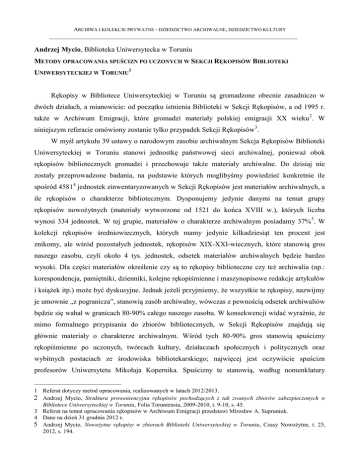 ARCHIWA I KOLEKCJE PRYWATNE - DZIEDZICTWO ARCHIWALNE, DZIEDZICTWO KULTURY Andrzej Mycio, Biblioteka Uniwersytecka w Toruniu METODY OPRACOWANIA SPUŚCIZN PO UCZONYCH W SEKCJI RĘKOPISÓW BIBLIOTEKI UNIWERSYTECKIEJ W TORUNIU1 Rękopisy w Bibliotece Uniwersyteckiej w Toruniu są gromadzone obecnie zasadniczo w dwóch działach, a mianowicie: od początku istnienia Biblioteki w Sekcji Rękopisów, a od 1995 r. także w Archiwum Emigracji, które gromadzi materiały polskiej emigracji XX wieku 2. W niniejszym referacie omówiony zostanie tylko przypadek Sekcji Rękopisów3. W myśl artykułu 39 ustawy o narodowym zasobie archiwalnym Sekcja Rękopisów Biblioteki Uniwersyteckiej w Toruniu stanowi jednostkę państwowej sieci archiwalnej, ponieważ obok rękopisów bibliotecznych gromadzi i przechowuje także materiały archiwalne. Do dzisiaj nie zostały przeprowadzone badania, na podstawie których moglibyśmy powiedzieć konkretnie ile spośród 45814 jednostek zinwentaryzowanych w Sekcji Rękopisów jest materiałów archiwalnych, a ile rękopisów o charakterze bibliotecznym. Dysponujemy jedynie danymi na temat grupy rękopisów nowożytnych (materiały wytworzone od 1521 do końca XVIII w.), których liczba wynosi 334 jednostek. W tej grupie, materiałów o charakterze archiwalnym posiadamy 37% 5. W kolekcji rękopisów średniowiecznych, których mamy jedynie kilkadziesiąt ten procent jest znikomy, ale wśród pozostałych jednostek, rękopisów XIX-XXI-wiecznych, które stanowią gros naszego zasobu, czyli około 4 tys. jednostek, odsetek materiałów archiwalnych będzie bardzo wysoki. Dla części materiałów określenie czy są to rękopisy biblioteczne czy też archiwalia (np.: korespondencja, pamiętniki, dzienniki, kolejne rękopiśmienne i maszynopisowe redakcje artykułów i książek itp.) może być dyskusyjne. Jednak jeżeli przyjmiemy, że wszystkie te rękopisy, nazwijmy je umownie „z pogranicza”, stanowią zasób archiwalny, wówczas z pewnością odsetek archiwaliów będzie się wahał w granicach 80-90% całego naszego zasobu. W konsekwencji widać wyraźnie, że mimo formalnego przypisania do zbiorów bibliotecznych, w Sekcji Rękopisów znajdują się głównie materiały o charakterze archiwalnym. Wśród tych 80-90% gros stanowią spuścizny rękopiśmienne po uczonych, twórcach kultury, działaczach społecznych i politycznych oraz wybitnych postaciach ze środowiska bibliotekarskiego; najwięcej jest oczywiście spuścizn profesorów Uniwersytetu Mikołaja Kopernika. Spuścizny te stanowią, według nomenklatury 1 Referat dotyczy metod opracowania, realizowanych w latach 2012/2013. 2 Andrzej Mycio, Struktura proweniencyjna rękopisów pochodzących z tak zwanych zbiorów zabezpieczonych w Bibliotece Uniwersyteckiej w Toruniu, Folia Toruniensia, 2009-2010, t. 9-10, s. 45. 3 Referat na temat opracowania rękopisów w Archiwum Emigracji przedstawi Mirosław A. Supruniuk. 4 Dane na dzień 31 grudnia 2012 r. 5 Andrzej Mycio, Nowożytne rękopisy w zbiorach Biblioteki Uniwersyteckiej w Toruniu, Czasy Nowożytne, t. 25, 2012, s. 194. |2 ARCHIWA I KOLEKCJE PRYWATNE - DZIEDZICTWO ARCHIWALNE, DZIEDZICTWO KULTURY ______________________________________________________________________________________________________ archiwistycznej, niepaństwowy nieewidencjonowany zasób archiwalny, czyli zasób prywatny. Wraz z przejęciem tych materiałów przez Bibliotekę stają się one własnością państwa i podlegają ewidencji, a więc z tego punktu widzenia zmieniają one swój pierwotny charakter zasobu prywatnego na ewidencjonowany zasób państwowy6. Obecnie posiadamy 60 różnych spuścizn rękopiśmiennych, są to najczęściej tylko większe lub mniejsze fragmenty pełnych zespołów (część spuścizn pracowników naukowych Uniwersytetu Mikołaja Kopernika znajduje się w Archiwum UMK, a także w innych archiwach i bibliotekach polskich, przede wszystkim w Archiwum PAN w Warszawie), ale część z nich stanowi komplet materiałów. Najważniejsze spośród nich to spuścizny pracowników UMK: filozofów: Tadeusza Czeżowskiego i Henryka Elzenberga, historyków: Karola Górskiego, Kazimierza Hartleba i Sławomira Kalembki, historyka sztuki Zygmunta Waźbińskiego, historyka literatury Artura Hutnikiewicza, teatrologa i filologa klasycznego Stefana Srebrnego, fizyka Aleksandra Jabłońskiego, biologa Jana Prüffera oraz neurofizjologa Janiny Hurynowicz. Sporadycznie gromadzimy także spuścizny innych wybitnych postaci, nie pracujących na Uniwersytecie Mikołaja Kopernika, ale związanych z regionem Pomorza, Wileńszczyzną (to w związku z nawiązywaniem do spuścizny Uniwersytetu Stefana Batorego) oraz z osobą patrona Uczelni, Mikołaja Kopernika. Wśród tych najważniejszych należy wymienić ostatnio pozyskaną spuściznę rękopiśmienną znanego kopernikologa, profesora nowojorskiej uczelni Edwarda Rosena. Obecnie na niwie gromadzenia koncentrujemy się przede wszystkim na pozyskiwaniu spuścizn rękopiśmiennych wyróżniających się pracowników naukowych naszej uczelni. Zasadniczo zbiory gromadzimy w dwojaki sposób. Po pierwsze, kiedy sam wytwórca lub jego prawni spadkobiercy zwracają się do nas z prośbą o przyjęcie danej spuścizny. Tak było na przykład w przypadku spuścizny profesora Sławomira Kalembki, który jeszcze za swojego życia przekazał do naszych zbiorów część swojego archiwum lub w przypadku spuścizny profesora Edwarda Rosena, którego materiały podarowała Bibliotece jego córka, Carla Rosen-Vacher. Po drugie, przez aktywne nawiązywanie kontaktów z prawnymi spadkobiercami osób, których spuścizny chcemy pozyskać. Tak odbyło się na przykład pozyskanie spuścizn profesorów: Zygmunta Waźbińskiego i Artura Hutnikiewicza. Ostatnio coraz ostrożniej i bardziej wybiórczo korzystamy z drugiego rozwiązania, bowiem posiadamy obecnie około 200 mb. materiałów niezinwentaryzowanych, które czekają na swoje opracowanie. P
