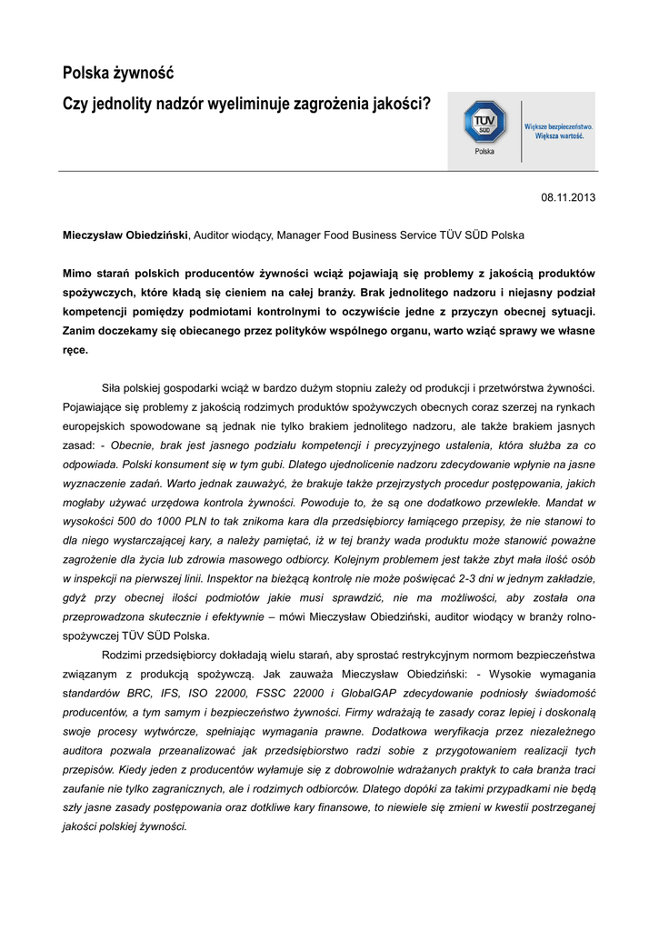 Polska żywność Czy jednolity nadzór wyeliminuje zagrożenia jakości? 08.11.2013 Mieczysław Obiedziński, Auditor wiodący, Manager Food Business Service TÜV SÜD Polska Mimo starań polskich producentów żywności wciąż pojawiają się problemy z jakością produktów spożywczych, które kładą się cieniem na całej branży. Brak jednolitego nadzoru i niejasny podział kompetencji pomiędzy podmiotami kontrolnymi to oczywiście jedne z przyczyn obecnej sytuacji. Zanim doczekamy się obiecanego przez polityków wspólnego organu, warto wziąć sprawy we własne ręce. Siła polskiej gospodarki wciąż w bardzo dużym stopniu zależy od produkcji i przetwórstwa żywności. Pojawiające się problemy z jakością rodzimych produktów spożywczych obecnych coraz szerzej na rynkach europejskich spowodowane są jednak nie tylko brakiem jednolitego nadzoru, ale także brakiem jasnych zasad: - Obecnie, brak jest jasnego podziału kompetencji i precyzyjnego ustalenia, która służba za co odpowiada. Polski konsument się w tym gubi. Dlatego ujednolicenie nadzoru zdecydowanie wpłynie na jasne wyznaczenie zadań. Warto jednak zauważyć, że brakuje także przejrzystych procedur postępowania, jakich mogłaby używać urzędowa kontrola żywności. Powoduje to, że są one dodatkowo przewlekłe. Mandat w wysokości 500 do 1000 PLN to tak znikoma kara dla przedsiębiorcy łamiącego przepisy, że nie stanowi to dla niego wystarczającej kary, a należy pamiętać, iż w tej branży wada produktu może stanowić poważne zagrożenie dla życia lub zdrowia masowego odbiorcy. Kolejnym problemem jest także zbyt mała ilość osób w inspekcji na pierwszej linii. Inspektor na bieżącą kontrolę nie może poświęcać 2-3 dni w jednym zakładzie, gdyż przy obecnej ilości podmiotów jakie musi sprawdzić, nie ma możliwości, aby została ona przeprowadzona skutecznie i efektywnie – mówi Mieczysław Obiedziński, auditor wiodący w branży rolnospożywczej TÜV SÜD Polska. Rodzimi przedsiębiorcy dokładają wielu starań, aby sprostać restrykcyjnym normom bezpieczeństwa związanym z produkcją spożywczą. Jak zauważa Mieczysław Obiedziński: - Wysokie wymagania standardów BRC, IFS, ISO 22000, FSSC 22000 i GlobalGAP zdecydowanie podniosły świadomość producentów, a tym samym i bezpieczeństwo żywności. Firmy wdrażają te zasady coraz lepiej i doskonalą swoje procesy wytwórcze, spełniając wymagania prawne. Dodatkowa weryfikacja przez niezależnego auditora pozwala przeanalizować jak przedsiębiorstwo radzi sobie z przygotowaniem realizacji tych przepisów. Kiedy jeden z producentów wyłamuje się z dobrowolnie wdrażanych praktyk to cała branża traci zaufanie nie tylko zagranicznych, ale i rodzimych odbiorców. Dlatego dopóki za takimi przypadkami nie będą szły jasne zasady postępowania oraz dotkliwe kary finansowe, to niewiele się zmieni w kwestii postrzeganej jakości polskiej żywności. Polska żywność Czy jednolity nadzór wyeliminuje zagrożenia jakości? TÜV SÜD Polska należy do międzynarodowego koncernu TÜV SÜD AG, który od ponad 140 lat chroni ludzi, środowisko i własność przed niekorzystnymi skutkami technologii. Zakres naszych działań obejmują usługi certyfikacji, badań, testów, dopuszczeń technicznych, ekspertyz i szkoleń. Zapewniamy wsparcie naszym Klientom na globalnym rynku poprzez wiedzę i doświadczenie prawie 19,500 specjalistów w ponad 600 lokalizacjach na całym świecie. Naszym celem jest zapewnienie bezpieczeństwa, niezawodności oraz efektywności - to pozwala zwiększać wartość i konkurencyjność naszych Klientów. Kontakt dla mediów: Karol Kłosiewicz – Royal Brand PR – [email protected] – tel.: +48 71 723 75 17