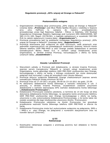 Regulamin promocji „20% więcej od Orange w Pekao24” §I Postanowienia wstępne 1. Organizatorem niniejszej akcji promocyjnej „20% więcej od Orange w Pekao24” (zwanej dalej: „Promocją”) jest Blue Media Spółka Akcyjna z siedzibą w Sopocie przy ulicy Haffnera 6, wpisana do rejestru przedsiębiorców prowadzonego przez Sąd Rejonowy Gdańsk - Północ w Gdańsku, VIII Wydział Gospodarczy Krajowego Rejestru Sądowego pod numerem KRS 0000320590, NIP 585-13-51-185, Regon 191781561, o kapitale zakładowym w wysokości 500 000 PLN (w całości opłaconym) (zwana dalej: „Organizatorem”). 2. Promocja prowadzona jest na podstawie niniejszego Regulaminu promocji „20% więcej od Orange w Pekao24” (zwanego dalej: „Regulaminem”). 3. Promocja skierowana jest wyłącznie do osób fizycznych, osób prawnych oraz jednostek organizacyjnych nie posiadających osobowości prawnej, których Konto Główne telefonu GSM PRE-PAID w sieci Orange zostało doładowane w serwisie transakcyjnym Banku Pekao S.A. w ramach usługi świadczonej przez Organizatora, w okresie trwania Promocji, korzystających z oferty na kartę (zwanych dalej: „Uczestnikiem”). § II Zasady i przedmiot Promocji 1. Warunkiem udziału w Promocji jest doładowanie, w okresie trwania Promocji, poprzez serwis transakcyjny Pekao24 w ramach usługi świadczonej przez Organizatora, konta głównego telefonu GSM PRE-PAID użytkownika sieci Orange, korzystającego z oferty na kartę, z którego użytkownik ten może dokonywać połączeń oraz korzystać z usług do wszystkich sieci (Konto Główne). 2. Promocja dotyczy wyłącznie doładowań Orange zrealizowanych poprzez serwis transakcyjny Pekao24 kwotą minimum 50 PLN. 3. Promocja trwa od 17-10-2011 od godz. 09:00 do 23-10-2011 do godz. 23:59. 4. Po dokonaniu doładowania Konta Głównego o wartości wskazanej w ust. 2 powyżej, w okresie trwania Promocji, Uczestnikowi zostanie przyznane doładowanie o wartości stanowiącej 20% wartości doładowania Konta Głównego („Doładowanie Promocyjne”). 5. Doładowanie Promocyjne zostanie udzielone, w terminie do 14 dni licząc od dnia dokonania doładowania Konta Głównego, na specjalne konto promocyjne telefonu GSM PRE-PAID użytkownika sieci Orange korzystającego z oferty na kartę, utworzone w celu wykorzystania Doładowania Promocyjnego, o ile konto takie nie zostało wcześniej dla tego Użytkownika utworzone (Konto Promocyjne). 6. Doładowanie Promocyjne udzielone na Konto Promocyjne nie powoduje przedłużenia ważności Konta Głównego telefonu GSM PRE-PAID w ofercie na kartę. 7. Doładowanie Promocyjne może być wykorzystane wyłącznie na połączenia, SMS-y i MMS-y w sieci Orange, na połączenia z numerami stacjonarnymi oraz na transfer danych (Internet). § III Reklamacje 1. Ewentualne reklamacje związane z promocją powinny być składane w formie elektronicznej. 2. Reklamacje mogą być składane do 30 dni włącznie od dnia zdarzenia będącego podstawą reklamacji (decyduje data otrzymania reklamacji przez Organizatora) na adres poczty elektronicznej: [email protected] Reklamacje zgłoszone po upływie wskazanego w zd. 1 terminu nie będą rozpatrywane. 3. Reklamacja powinna zawierać imię, nazwisko, dokładny adres osoby oraz numer telefonu, dla którego dokonano doładowania, numer transakcji, jak również dokładny opis i powód reklamacji. 4. O sposobie rozpatrzenia reklamacji Uczestnik zostanie poinformowany za pośrednictwem poczty elektronicznej (na adres podany w reklamacji) bądź telefonicznie w ciągu 30 dni od daty otrzymania reklamacji. § IV Postanowienia końcowe 1. Dokonując zlecenia realizacji Usługi (wykonania doładowania) Uczestnik wyraża zgodę na postanowienia niniejszego Regulaminu. 2. Organizator nie ponosi odpowiedzialności za niewykonanie lub nienależyte wykonanie zobowiązań wynikających z niniejszego Regulaminu, o ile niewykonanie lub nienależyte wykonanie zobowiązań jest spowodowane okolicznościami, na które Organizator nie miał wpływu mimo zachowania należytej staranności (siła wyższa). 3. Organizator nie ponosi odpowiedzialności za powstałe pomyłki przy definiowaniu numerów kont przedpłaconych, nieprawidłowości w podaniu lub przetworzeniu adresu poczty elektronicznej oraz za nieprawidłowe funkcjonowanie przeglądarki internetowej lub łącz telekomunikacyjnych. 4. Niniejszy Regulamin jest dostępny w siedzibie Organizatora oraz na stronie internetowej www.pekao.com.pl i www.bluemedia.pl . Organizator promocji zastrzega sobie prawo do dokonania zmian postanowień Regulaminu, przy czym w takim przypadku odpowiednia informacja zostanie podana na wyżej wymienionej stronie internetowej i wchodzi w życie po upływie 24 godzin od dnia zamieszczenia Regulaminu ze zmianami. 5. Niniejszy Regulamin nie stanowi przyrzeczenia publicznego w rozumieniu art. 919 Kodeksu Cywilnego.