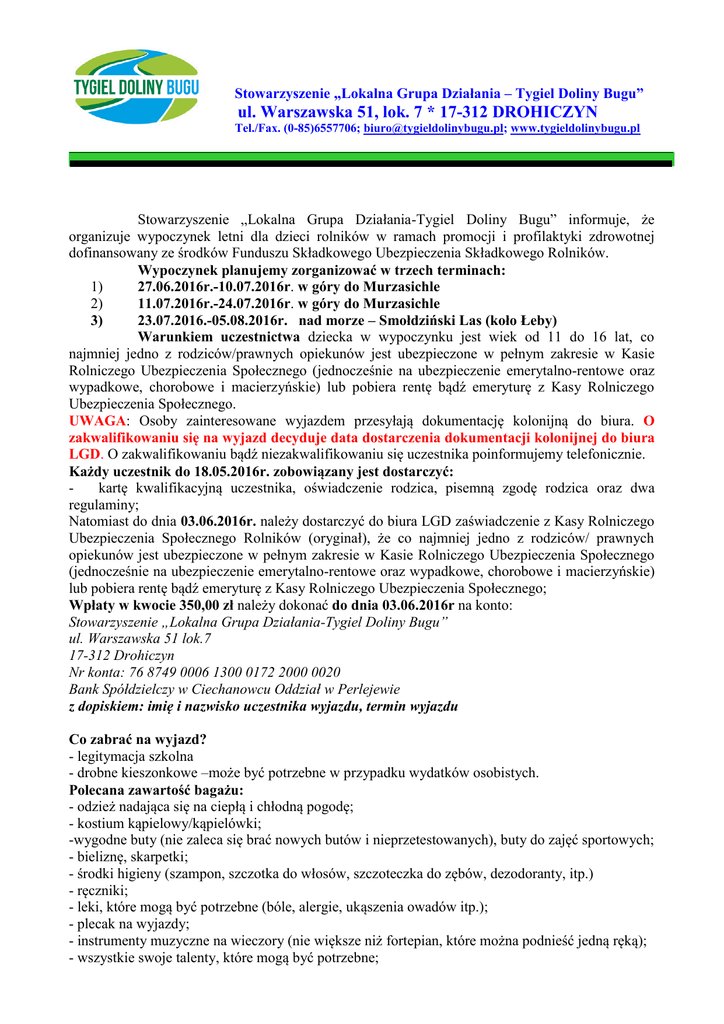 Stowarzyszenie „Lokalna Grupa Działania – Tygiel Doliny Bugu” ul. Warszawska 51, lok. 7 * 17-312 DROHICZYN Tel./Fax. (0-85)6557706; [email protected]; www.tygieldolinybugu.pl Stowarzyszenie „Lokalna Grupa Działania-Tygiel Doliny Bugu” informuje, że organizuje wypoczynek letni dla dzieci rolników w ramach promocji i profilaktyki zdrowotnej dofinansowany ze środków Funduszu Składkowego Ubezpieczenia Składkowego Rolników. Wypoczynek planujemy zorganizować w trzech terminach: 1) 27.06.2016r.-10.07.2016r. w góry do Murzasichle 2) 11.07.2016r.-24.07.2016r. w góry do Murzasichle 3) 23.07.2016.-05.08.2016r. nad morze – Smołdziński Las (koło Łeby) Warunkiem uczestnictwa dziecka w wypoczynku jest wiek od 11 do 16 lat, co najmniej jedno z rodziców/prawnych opiekunów jest ubezpieczone w pełnym zakresie w Kasie Rolniczego Ubezpieczenia Społecznego (jednocześnie na ubezpieczenie emerytalno-rentowe oraz wypadkowe, chorobowe i macierzyńskie) lub pobiera rentę bądź emeryturę z Kasy Rolniczego Ubezpieczenia Społecznego. UWAGA: Osoby zainteresowane wyjazdem przesyłają dokumentację kolonijną do biura. O zakwalifikowaniu się na wyjazd decyduje data dostarczenia dokumentacji kolonijnej do biura LGD. O zakwalifikowaniu bądź niezakwalifikowaniu się uczestnika poinformujemy telefonicznie. Każdy uczestnik do 18.05.2016r. zobowiązany jest dostarczyć: kartę kwalifikacyjną uczestnika, oświadczenie rodzica, pisemną zgodę rodzica oraz dwa regulaminy; Natomiast do dnia 03.06.2016r. należy dostarczyć do biura LGD zaświadczenie z Kasy Rolniczego Ubezpieczenia Społecznego Rolników (oryginał), że co najmniej jedno z rodziców/ prawnych opiekunów jest ubezpieczone w pełnym zakresie w Kasie Rolniczego Ubezpieczenia Społecznego (jednocześnie na ubezpieczenie emerytalno-rentowe oraz wypadkowe, chorobowe i macierzyńskie) lub pobiera rentę bądź emeryturę z Kasy Rolniczego Ubezpieczenia Społecznego; Wpłaty w kwocie 350,00 zł należy dokonać do dnia 03.06.2016r na konto: Stowarzyszenie „Lokalna Grupa Działania-Tygiel Doliny Bugu” ul. Warszawska 51 lok.7 17-312 Drohiczyn Nr konta: 76 8749 0006 1300 0172 2000 0020 Bank Spółdzielczy w Ciechanowcu Oddział w Perlejewie z dopiskiem: imię i nazwisko uczestnika wyjazdu, termin wyjazdu Co zabrać na wyjazd? - legitymacja szkolna - drobne kieszonkowe –może być potrzebne w przypadku wydatków osobistych. Polecana zawartość bagażu: - odzież nadająca się na ciepłą i chłodną pogodę; - kostium kąpielowy/kąpielówki; -wygodne buty (nie zaleca się brać nowych butów i nieprzetestowanych), buty do zajęć sportowych; - bieliznę, skarpetki; - środki higieny (szampon, szczotka do włosów, szczoteczka do zębów, dezodoranty, itp.) - ręczniki; - leki, które mogą być potrzebne (bóle, alergie, ukąszenia owadów itp.); - plecak na wyjazdy; - instrumenty muzyczne na wieczory (nie większe niż fortepian, które można podnieść jedną ręką); - wszystkie swoje talenty, które mogą być potrzebne; - portfel, w którym będzie trochę gotówki na wydatki osobiste; - odtwarzacz MP3, aparat fotograficzny itp.; - telefon komórkowy. Proszę poinformować nas, możliwie jak najszybciej, czy dziecko stosuje specjalistyczną dietę, czy jest na coś uczulone, czy potrzebuje specjalnych leków!!! W załączniku (e-mailem) przesyłamy kartę kwalifikacyjną uczestnika wypoczynku oraz pozostałe dokumenty. Karta kwalifikacyjna wypełniana jest przez rodziców. Prosimy o uważne wypełnianie karty kwalifikacyjnej, w przypadku braków podpisów w karcie będziemy zmuszeni wezwać Państwa do ich uzupełnienia. Kontakt, gdzie należy zgłaszać uczestników i można uzyskać informację: Stowarzyszenie „Lokalna Grupa Działania-Tygiel Doliny Bugu” ul. Warszawska 51 lok.7, 17-312 Drohiczyn Tel/fax. (85) 655 77 06 E-mail: [email protected] Cała dokumentacja dotycząca wypoczynku letniego znajduje się do pobrania na stronie internetowej www.tygieldolinybugu.pl w zakładce aktualności. Z poważaniem Agnieszka Wojtkowska Prezes