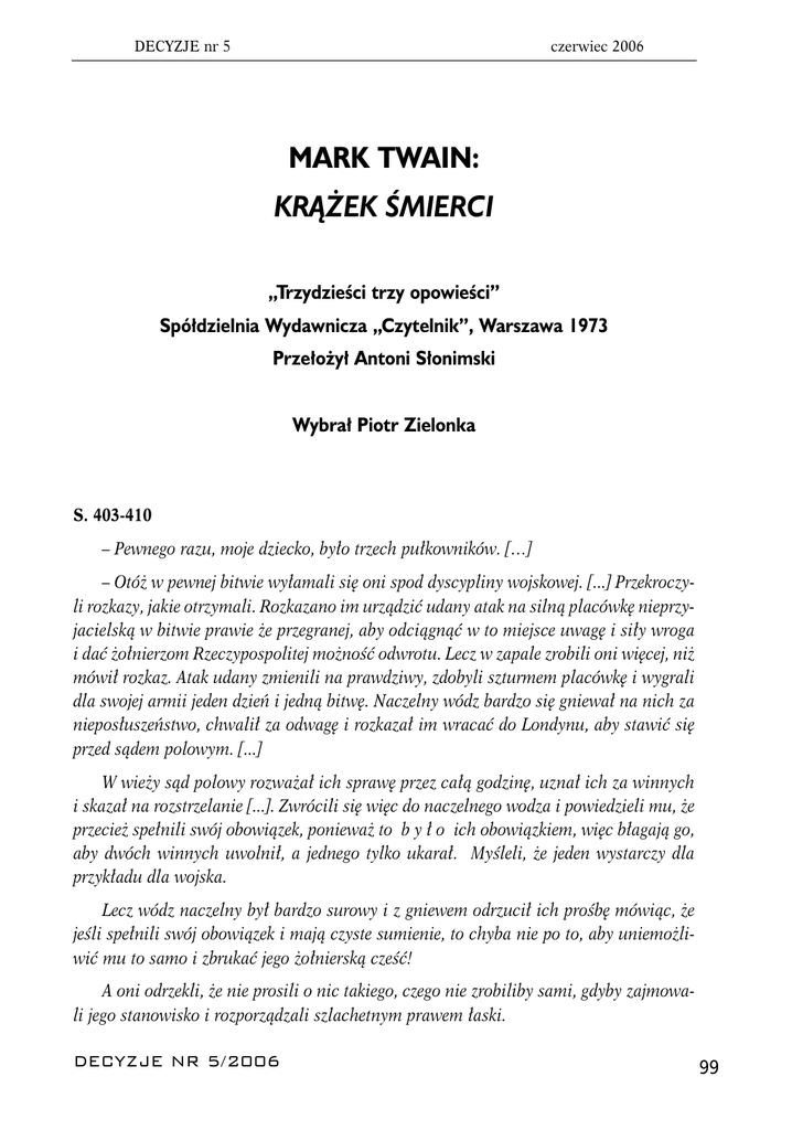 DECYZJE nr 5 czerwiec 2006 MARK TWAIN: KR¥¯EK ŒMIERCI „Trzydzieœci trzy opowieœci” Spó³dzielnia Wydawnicza „Czytelnik”, Warszawa 1973 Prze³o¿y³ Antoni S³onimski Wybra³ Piotr Zielonka S. 403-410 – Pewnego razu, moje dziecko, było trzech pułkowników. […] – Otóż w pewnej bitwie wyłamali się oni spod dyscypliny wojskowej. [...] Przekroczyli rozkazy, jakie otrzymali. Rozkazano im urządzić udany atak na silną placówkę nieprzyjacielską w bitwie prawie że przegranej, aby odciągnąć w to miejsce uwagę i siły wroga i dać żołnierzom Rzeczypospolitej możność odwrotu. Lecz w zapale zrobili oni więcej, niż mówił rozkaz. Atak udany zmienili na prawdziwy, zdobyli szturmem placówkę i wygrali dla swojej armii jeden dzień i jedną bitwę. Naczelny wódz bardzo się gniewał na nich za nieposłuszeństwo, chwalił za odwagę i rozkazał im wracać do Londynu, aby stawić się przed sądem polowym. [...] W wieży sąd polowy rozważał ich sprawę przez całą godzinę, uznał ich za winnych i skazał na rozstrzelanie [...]. Zwrócili się więc do naczelnego wodza i powiedzieli mu, że przecież spełnili swój obowiązek, ponieważ to b y ł o ich obowiązkiem, więc błagają go, aby dwóch winnych uwolnił, a jednego tylko ukarał. Myśleli, że jeden wystarczy dla przykładu dla wojska. Lecz wódz naczelny był bardzo surowy i z gniewem odrzucił ich prośbę mówiąc, że jeśli spełnili swój obowiązek i mają czyste sumienie, to chyba nie po to, aby uniemożliwić mu to samo i zbrukać jego żołnierską cześć! A oni odrzekli, że nie prosili o nic takiego, czego nie zrobiliby sami, gdyby zajmowali jego stanowisko i rozporządzali szlachetnym prawem łaski. DECYZJE NR 5/2006 99 TEKST LITERACKI Zastanowiło go to. Zamyślił się, a surowość powoli ustąpiła z jego twarzy. Kazał im poczekać, a sam udał się do swojej komnaty, aby w modlitwie szukać rady u Boga. Gdy wrócił, powiedział: niech rzucą kości. Los zadecyduje o tym, którzy zostaną przy życiu. * – Odmówili. – Dlaczego? – Bo powiedzieli, że ten, który wyrzuci najmniej, sam, z własnej nieprzymuszonej woli, skaże się na śmierć. Bez względu, jak się to nazwie, będzie to samobójstwem, a Pismo święte zabrania ludziom życie sobie odbierać. Odesłali więc słowo łaski i kazali powiedzieć, że są gotowi i czekają, aby wyrok sądu wcielono w czyn. * W godzinę później naczelny wódz kazał wezwać do siebie sąd polowy. [...] Jeden z sędziów złożył raport: – Raz jeszcze skłanialiśmy ich do zastanowienia. Lecz trwają przy swojej decyzji. Nie chcą rzucać kości. Są gotowi umrzeć, lecz nie postąpią wbrew nakazom wiary. Twarz wodza pociemniała. – Nie wolno im wszystkim umrzeć. Kości rzuci ktoś za nich. Przyprowadzić ich. Ustawić w tamtym pokoju w rząd, twarzami do ściany, dłonie skrzyżowane na plecach. [...] i dał rozkaz adiutantowi: – Idź i sprowadź pierwsze dziecko, jakie przejdzie przed bramą. Zaledwie wyszedł, a już powrócił, prowadząc za rączkę Abby [...]. Naczelnik narodu wręczył Abby trzy krążki, zrobione z laku: dwa białe i jeden mocno czerwony. Zadaniem jego było oznajmić śmierć pułkownikowi, który go dostanie. – [...] zobaczysz trzech ludzi stojących rzędem i zwróconych do siebie plecami. Każdy z nich ma jedną dłoń otwartą, o tak, jak miseczkę. W każdą otwartą dłoń wrzuć jeden krążek, a potem wracaj do mnie. Mała czarodziejka znikła za zasłoną i stanęła cichutko, patrząc wzrokiem podnieconym przez ciekawość na urządzenie pokoju zgrozy i na sztywne postacie żołnierzy oraz skazańców. Potem twarzyczka jej rozjaśniła się wesoło. Powiedziała sobie: – Jednym z nich na pewno jest tatuś. Poznaję jego plecy. Dam mu najładniejszy krążek! 100 DECYZJE NR 5/2006 TEKST LITERACKI Wesoło pobiegła naprzód i wrzuciła krążki w otwarte dłonie skazańców, po czym wsunęła łebek pod ramię ojca, spojrzała mu w oczy i zaśmiała się: – Papciu, papciu, zobacz coś dostał. To ja ci dałam! A on spojrzał na fatalny podarunek, potem przyklęknął na ziemię, wziął w objęcia swego małego, niewinnego oprawcę i przycisnął go do piersi w agonii miłości i żalu. Żołnierze, oficerowie i dwaj zwolnieni więźniowie, wszyscy stali przez chwilę, jak rażeni piorunem wobec bezmiaru tragedii. KOMENTARZ: Losowe metody podejmowania decyzji społecznych a etyka Grzegorz Lissowski Uniwersytet Warszawski Losowe metody podejmowania społecznych decyzji Pierwszą reakcją racjonalnych osób na podejmowanie decyzji, także indywidualnych, ale przede wszystkim społecznych, za pomocą metod losowych, jest sprzeciw. Losowe sposoby podejmowania decyzji są znane od czasów biblijnych. Współcześnie jednak stosuje się je jedynie w szczególnych sytuacjach i z niechęcią. Według P.C. Fishburna (1978), źródła współczesnych postaw wobec stosowania losowych sposobów podejmowania społecznych decyzji tkwią w myśli oświeceniowej, w doktrynie wolności i moralnej odpowiedzialności człowieka za kierowanie swoim losem połączonej z postulatami egalitaryzmu w dziedzinie społecznej, politycznej i ekonomicznej. Można jednak wskazać na racjonalne argumenty na rzecz takiego postępowania i określić sytuacje, w których metody losowe posiadają bardziej pożądane własności etyczne od metod deterministycznych. Przed przystąpieniem do analizy konkretnych sytuacji, warto wyjaśnić i ustalić pewne podstawowe pojęcia. Metody podejmowania społecznych decyzji mają charakter społeczny w dwojakim sensie. Po pierwsze, są to metody zbiorowego podejmowania decyzji. Obejmują one metody głosowania w zgromadzeniach bezpośrednio podejmujących społeczne decyzje oraz systemy wyborcze, w których decyzje społeczne podejmowane są pośrednio poprzez wybór przedstawicieli do zgromadzeń wykonawczych, ustawodawczych itp. Po drugie, są to metody dokonywania społeczn