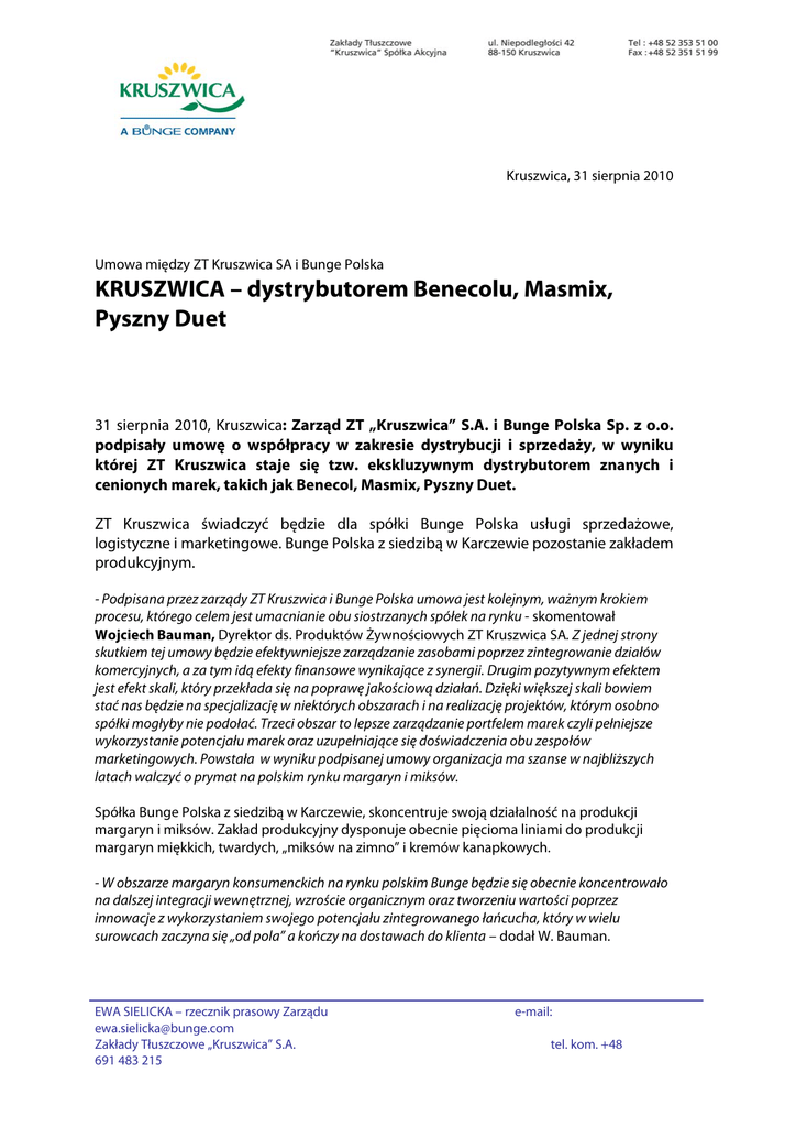 Kruszwica, 31 sierpnia 2010 Umowa między ZT Kruszwica SA i Bunge Polska KRUSZWICA – dystrybutorem Benecolu, Masmix, Pyszny Duet 31 sierpnia 2010, Kruszwica: Zarząd ZT „Kruszwica” S.A. i Bunge Polska Sp. z o.o. podpisały umowę o współpracy w zakresie dystrybucji i sprzedaży, w wyniku której ZT Kruszwica staje się tzw. ekskluzywnym dystrybutorem znanych i cenionych marek, takich jak Benecol, Masmix, Pyszny Duet. ZT Kruszwica świadczyć będzie dla spółki Bunge Polska usługi sprzedażowe, logistyczne i marketingowe. Bunge Polska z siedzibą w Karczewie pozostanie zakładem produkcyjnym. - Podpisana przez zarządy ZT Kruszwica i Bunge Polska umowa jest kolejnym, ważnym krokiem procesu, którego celem jest umacnianie obu siostrzanych spółek na rynku - skomentował Wojciech Bauman, Dyrektor ds. Produktów Żywnościowych ZT Kruszwica SA. Z jednej strony skutkiem tej umowy będzie efektywniejsze zarządzanie zasobami poprzez zintegrowanie działów komercyjnych, a za tym idą efekty finansowe wynikające z synergii. Drugim pozytywnym efektem jest efekt skali, który przekłada się na poprawę jakościową działań. Dzięki większej skali bowiem stać nas będzie na specjalizację w niektórych obszarach i na realizację projektów, którym osobno spółki mogłyby nie podołać. Trzeci obszar to lepsze zarządzanie portfelem marek czyli pełniejsze wykorzystanie potencjału marek oraz uzupełniające się doświadczenia obu zespołów marketingowych. Powstała w wyniku podpisanej umowy organizacja ma szanse w najbliższych latach walczyć o prymat na polskim rynku margaryn i miksów. Spółka Bunge Polska z siedzibą w Karczewie, skoncentruje swoją działalność na produkcji margaryn i miksów. Zakład produkcyjny dysponuje obecnie pięcioma liniami do produkcji margaryn miękkich, twardych, „miksów na zimno” i kremów kanapkowych. - W obszarze margaryn konsumenckich na rynku polskim Bunge będzie się obecnie koncentrowało na dalszej integracji wewnętrznej, wzroście organicznym oraz tworzeniu wartości poprzez innowacje z wykorzystaniem swojego potencjału zintegrowanego łańcucha, który w wielu surowcach zaczyna się „od pola” a kończy na dostawach do klienta – dodał W. Bauman. EWA SIELICKA – rzecznik prasowy Zarządu [email protected] Zakłady Tłuszczowe „Kruszwica” S.A. 691 483 215 e-mail: tel. kom. +48 ZT ‘KRUSZWICA’ S.A. - największy w Polsce i jeden z największych w Europie Środkowej, przetwórca nasion oleistych i producent tłuszczów roślinnych. Spółka specjalizuje się w produkcji olejów konfekcjonowanych, margaryn oraz tłuszczów dla potrzeb przemysłowych. Znaczącym obszarem naszej działalności jest handel roślinami oleistymi oraz surowymi i rafinowanymi olejami roślinnymi o zastosowaniu przemysłowym, głównie dla sektora produkcji biopaliw i biokomponentów. Segment ten obejmuje także dostawy i dystrybucję śruty rzepakowej w kraju i za granicą. Jesteśmy liderem w rynku olejów konfekcjonowanych i produktów profesjonalnych, a także silnym graczem na rynku margaryn konsumenckich. Główne nasze marki to: Olej Kujawski z Pierwszego Tłoczenia, Kujawski 3 Ziarna, Oliwier, Floriol Omega 3, Bartek a także margaryny konsumenckie: Smakowita, Masło Roślinne, Manuel, seria „Z Kruszwicy”. W grupie produktów profesjonalnych, główne marki to Amada, Maestra oraz Jedyna, Olfryt, Tytan. Jesteśmy częścią Grupy Bunge - światowego lidera w przetwórstwie nasion oleistych i największego na świecie producenta olejów roślinnych (www.bunge.com). www.ztkruszwica.pl Bunge Polska Sp. z o.o. - jest liczącym na polskim rynku tłuszczowym producentem margaryn konsumenckich, masła i miksów. Silną pozycję i uznanie konsumentów wypracowują dla Spółki główne marki – Masmix, Benecol i Pyszny Duet. Spółka z powodzeniem sprzedaje produkty w krajach Europy, a także w USA i Izraelu. Bunge Polska prowadzi działalność produkcyjną w Zakładzie w Karczewie. Spółka jest częścią Grupy Bunge - światowego lidera w przetwórstwie nasion oleistych i największego na świecie producenta olejów roślinnych. www.bunge.pl EWA SIELICKA – rzecznik prasowy Zarządu Zakłady Tłuszczowego „Kruszwica” S.A. e-mail: [email protected] tel. kom. 691 483 215