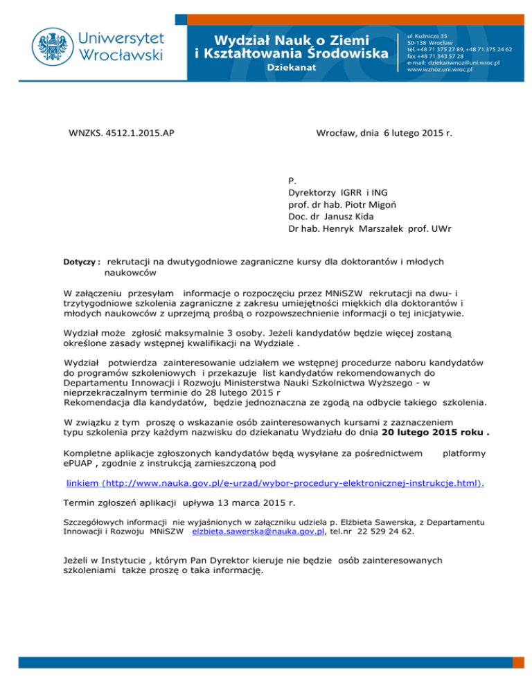 WNZKS. 4512.1.2015.AP Wrocław, dnia 6 lutego 2015 r. P. Dyrektorzy IGRR i ING prof. dr hab. Piotr Migoń Doc. dr Janusz Kida Dr hab. Henryk Marszałek prof. UWr Dotyczy : rekrutacji na dwutygodniowe zagraniczne kursy dla doktorantów i młodych naukowców W załączeniu przesyłam informacje o rozpoczęciu przez MNiSZW rekrutacji na dwu- i trzytygodniowe szkolenia zagraniczne z zakresu umiejętności miękkich dla doktorantów i młodych naukowców z uprzejmą prośbą o rozpowszechnienie informacji o tej inicjatywie. Wydział może zgłosić maksymalnie 3 osoby. Jeżeli kandydatów będzie więcej zostaną określone zasady wstępnej kwalifikacji na Wydziale . Wydział potwierdza zainteresowanie udziałem we wstępnej procedurze naboru kandydatów do programów szkoleniowych i przekazuje list kandydatów rekomendowanych do Departamentu Innowacji i Rozwoju Ministerstwa Nauki Szkolnictwa Wyższego - w nieprzekraczalnym terminie do 28 lutego 2015 r Rekomendacja dla kandydatów, będzie jednoznaczna ze zgodą na odbycie takiego szkolenia. W związku z tym proszę o wskazanie osób zainteresowanych kursami z zaznaczeniem typu szkolenia przy każdym nazwisku do dziekanatu Wydziału do dnia 20 lutego 2015 roku . Kompletne aplikacje zgłoszonych kandydatów będą wysyłane za pośrednictwem ePUAP , zgodnie z instrukcją zamieszczoną pod platformy linkiem (http://www.nauka.gov.pl/e-urzad/wybor-procedury-elektronicznej-instrukcje.html). Termin zgłoszeń aplikacji upływa 13 marca 2015 r. Szczegółowych informacji nie wyjaśnionych w załączniku udziela p. Elżbieta Sawerska, z Departamentu Innowacji i Rozwoju MNiSZW [email protected], tel.nr 22 529 24 62. Jeżeli w Instytucie , którym Pan Dyrektor kieruje nie będzie osób zainteresowanych szkoleniami także proszę o taka informację. MNiSZW 26 stycznia 2015 r. Rekrutacja na dwutygodniowe zagraniczne kursy dla doktorantów i młodych naukowców z zakresu umiejętności miękkich niezbędnych do współpracy z gospodarką, finansowanych w ramach projektu systemowego „Wsparcie systemu zarządzania badaniami naukowymi i ich wynikami” Minister Nauki i Szkolnictwa Wyższego zaprasza uczelnie / podstawowe jednostki organizacyjne uczelni, kształcące doktorantów o wspierające młodych naukowców do naboru kandydatów na dwutygodniowe zagraniczne szkolenia z umiejętności miękkich w czołowych ośrodkach akademickich na świecie. W ramach programu sfinansowane zostaną kursy szkoleniowe oraz pokryte koszty przejazdu i pobytu w zagranicznych ośrodkach akademickich. Szkolenia będą odbywały się w krajach Europy Zachodniej i Północnej oraz USA lub Kanady. Nie przewiduje się możliwości wyboru ośrodka akademickiego. Nabór stanowi I etap rekrutacji do udziału w przedmiotowych kursach realizowanych w ramach projektu systemowego Ministra Nauki Szkolnictwa Wyższego pt. „Wsparcie systemu zarządzania badaniami naukowymi i ich wynikami”. Projekt jest dofinansowany z Europejskiego Funduszu Rozwoju Regionalnego w ramach podziałania 1.1.3 Programu Operacyjnego Innowacyjna Gospodarka (POIG). Projekt zakłada bezpłatny udział 500 doktorantów/ młodych naukowców w szkoleniu w najlepszych ośrodkach akademickich na świecie w grupach 25 osobowych w terminie II - III kwartał 2015 r. Wydział zgłasza 3 kandydatów łącznie, mogą nimi być doktoranci i/lub młodzi naukowcy. Konieczne jest prowadzenie sformalizowanej działalności naukowej, tzn. poprzez zatrudnienie na stanowisku naukowym/ naukowo-dydaktycznym/ naukowo-technicznym na uczelni lub posiadanie otwartego przewodu doktorskiego lub bycie uczestnikiem studiów doktoranckich. Przyjmowane będą zgłoszenia od kandydatów, którzy w dniu ukazania się ogłoszenia nie mieli ukończonych 35 lat. Termin będzie podany z odpowiednim wyprzedzeniem I – typ szkolenia - dwutygodniowe, mające na celu wzmocnienie kompetencji z zakresu przedsiębiorczości, a także umiejętności miękkich niezbędnych do współpracy z gospodarką, skierowane będzie do grupy 400 uczestników; II – typ szkolenia - trzytygodniowe, w zakresie kompetencji miękkich oraz trenerskich umożliwiających przekazanie nabytych umiejętności dalej w polskim środowisku akademickim i poza nim, dedykowane do grupy 100 edukatorów. Przeprowadzana rekrutacja dotyczyć będzie obu typów szkoleń. Uczelnia / podstawowa jednostka organizacyjna uczelni przeprowadzi wg własnych zasad, wstępną kwalifikację kandydatów przypisując ich do I lub II – typu szkolenia. Aplikacje kandydatów rekomendowanych przez uczelnie będą zgłaszane przez osoby je rekomendujące (dziekanów, dyrektorów instytutów) poprzez rejestrację w elektronicznym systemie rekrutacyjnym ePUAP, zgodnie z instrukcją zamieszczoną w serwisie MNiSW, w dniach 28 stycznia - 13 marca 2015 r. Do zgłoszenia kandydaci załączają: CV ze zdjęciem, dokumenty potwierdzające znajomość języka angielskiego na poziomie nie niższym niż C1, wykaz zagadnień, które uczestnik chciałby opanować wraz ze wskazaniem celu uczestnictwa w szkoleniu, podpisaną opinię opiekuna naukowego kierującą na dany typ szkolenia, dokument potwierdzający otwarty przewód doktorski/ oświadczenie o spełnieniu warunku bycia młodym naukowcem zgodnie z art. 2 pkt 19 ustawy z dnia 30 kwietnia 2010 r. o zasadach finansowania nauki (Dz. U. 2014 r. poz. 1620), wykaz kursów, szkoleń dotychczas przeprowadzonych przez kandydata jako trenera grupy, oświadczenie o upoważnieniu do przetwarzania danych osobowych, oświadczenie o nieuczestniczeniu w dotychczasowych edycjach Top 500 innovators. W opinii powinny być ujęte predyspozycje kandydata, które jednoznacznie wskazują, że umiejętności zdobyte podczas szkolenia zagranicznego kandydat wykorzysta w pełni w pracy naukowo-dydaktycznej/ badawczo-rozwojowej. W przypadku braku dokumentu potwierdzającego znajomość języka angielskiego na poziomie C 1 kandydat składa oświadczenie , zawierające informację o ty