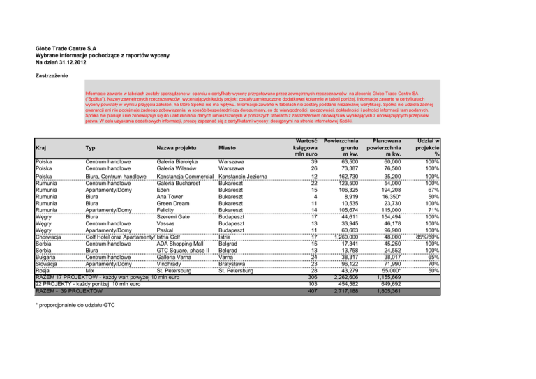 Informacje zawarte w tabelach zostały sporządzone w oparciu o certyfikaty wyceny przygotowane przez zewnętrznych rzeczoznawców na zlecenie Globe Trade Centre SA