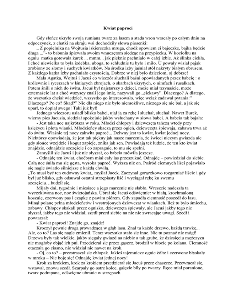 Kwiat paproci Gdy słońce ukryło swoją rumianą twarz za lasem a stada wron wracały po całym dniu na odpoczynek, z chatki na skraju wsi dochodziły słowa piosenki: „ Z popielnika na Wojtusia iskiereczka mruga, chodź opowiem ci bajeczkę, bajka będzie długa ...”- to babunia śpiewała swoim wnuczętom siedząc na przypiecku. W kociołku na ogniu matka gotowała żurek ... mmm... jak pięknie pachniało w całej izbie. Aż ślinka ciekła. I choć niewielka to była izdebka, uboga, to schludnie tu było i miło. U powały wisiał pająk zrobiony ze słomy i suchych kwiatków. Na środku izby jaśniał stół nakryty białym obrusem. Z każdego kątka izby pachniało czystością. Dobrze w niej było dzieciom, oj dobrze! Mała Agatka, Wojtuś i Jacuś co wieczór słuchali baśni opowiadanych przez babcię : o królewnie i rycerzach w lśniących zbrojach, o skarbach ukrytych, o nimfach i rusałkach. Potem śnili o nich do świtu. Jacuś był najstarszy z dzieci, może miał trzynaście, może czternaście lat a choć wszyscy znali jego imię, nazywali go „ciekawy”. Dlaczego? A dlatego, że wszystko chciał wiedzieć, wszystko go interesowało, więc wciąż zadawał pytania:” Dlaczego? Po co? Skąd?” Nic dla niego nie było niemożliwe, niczego się nie bał, a jak się uparł, to dopiął swego! Taki już był! Jednego wieczoru usiadł blisko babci, ujął ją za rękę i słuchał, słuchał. Nawet Burek, wierny pies Jacusia, siedział spokojnie jakby wsłuchany w słowa babci. A babcia tak bajała: - Jest taka noc najkrótsza w roku. Młodzi chłopcy i dziewczęta tańczą wtedy przy księżycu i plotą wianki. Młodzieńcy skaczą przez ogień, dziewczęta śpiewają, zabawa trwa aż do świtu. Właśnie tej nocy zakwita paproć... Dziwny jest to kwiat, kwiat jednej nocy. Niektórzy opowiadają, że jest tak piękny jak nasze marzenia, że świeci niczym gwiazda ale gdy słońce wzejdzie i kogut zapieje, znika jak sen. Powiadają też ludzie, że ten kto kwiat znajdzie, odnajdzie szczęście i co zapragnie, to mu się spełni. Zamyślił się Jacuś i już nie słyszał, co babcia mówiła jeszcze. - Odnajdę ten kwiat, choćbym miał cały las przeszukać. Odnajdę – powiedział do siebie. Całą noc śniła mu się gęsta, wysoka paproć. Wyższa niż on. Pośród ciemnych liści pojawiało się nagle światło silniejsze z każdą chwilą. „To musi być ten cudowny kwiat„ myślał Jacek. Zaczynał gorączkowo rozgarniać liście i gdy był już blisko, gdy odsuwał ostatni strzępiasty liść i wyciągał rękę ku swemu szczęściu…budził się. Mijały dni, tygodnie i miesiące a jego marzenie nie słabło. Wreszcie nadeszła ta wyczekiwana noc, noc świętojańska. Ubrał się Jacuś odświętnie: w białą, krochmaloną koszulę, czerwony pas i czapkę z pawim piórem. Gdy zapadła ciemność poszedł do lasu. Minął polanę pełną młodzieńców i wystrojonych dziewcząt w wiankach. Ileż tu było śmiechu, zabawy. Chłopcy skakali przez ognisko, dziewczęta śpiewały, ale Jacuś jakby tego nie słyszał, jakby tego nie widział, szedł przed siebie na nic nie zwracając uwagi. Szedł i powtarzał: - Kwiat paproci! Znajdę go, znajdę! Kroczył pewnie drogą prowadzącą w głąb lasu. Znał tu każde drzewo, każdą trawkę... Ale, co to? Las się nagle zmienił. Teraz wszystko stało się inne. Nic tu poznać nie mógł! Drzewa były tak wielkie, jakby sięgały gwiazd na niebie a tak grube, że dziesięciu mężczyzn nie mogłoby objąć ich pni. Przedzierał się przez gąszcz, brodził w błocie po kolana. Ciemność otaczała go ciasno, nie widział nic nawet na krok. - Oj, co to? – przestraszył się chłopak. Jakieś tajemnicze ognie żółte i czerwone błyskały w mroku – Nie boję się! Odnajdę kwiat jednej nocy! Krok za krokiem, krok za krokiem przedzierał się Jacuś przez chaszcze. Przewracał się, wstawał, znowu szedł. Szarpały go ostre kolce, gałęzie biły po twarzy. Ręce miał poranione, twarz podrapaną, odświętne ubranie w strzępach. - To nic, to nic, byle bym go tylko odnalazł... - powtarzał z uporem. Nagle las się znów odmienił. Zabłysły gwiazdy i księżyc rozjaśnił ciemności. Spojrzał Jacuś na swoje ręce - ani śladu zadrapań. Koszulę miał znowu bieluśką, wykrochmaloną... „Czary jakieś, czy co!?” przemknęło mu przez myśl i w tej samej chwili wyrosła przed nim, jak spod ziemi, rozłożysta paproć. Coś błysnęło wśród liści. To kwiat! Kwiat paproci! Jaki piękny, jakby zrobiony ze złota albo słonecznych promieni. Bił od niego jasny blask jak od ognia. Chłopak pochylił się, wyciągnął rękę a liście same rozsunęły się przed nim. To nie był sen! Odnalazł kwiat! Magiczny! Czarodziejski! Zacisnął mocno dłoń na łodydze i zerwał kwiat paproci. - Żebym tylko nie zgubił mojego skarbu – pomyślał Jacuś i schował go pod koszulą, na piersi. Wtedy poczuł coś dziwnego: najpierw gorąco, potem nieprzyjemny chłód, poczuł, że kwiat przylgnął do jego ciała, jakby do niego przyrósł. Serce zatłukło mu się w piersi jak oszalałe, lecz po chwili uspokoiło się. - Odtąd możesz mieć wszystko – usłyszał - ale pamiętaj, nie wolno ci się z nikim dzielić swoim majątkiem, bo wszystko stracisz. Skąd dochodził ten głos? Czyżby to kwiat przemówił? - A co mi tam! – pomyślał – będę bogaty. To najważniejsze! Teraz już każde moje życzenie się spełni i co zechcę, to się stanie. Droga powrotna sama prowadziła Jacusia przez las. Świeciła jak srebrna. Kwiaty i krzaki kłaniały mu się nisko, do samej ziemi a gałęzie drzew splotły baldachim nad jego głową. - Co za radość! Jakie szczęście! – powtarzał chłopiec - zdobyłem go. Nagle pomyślał: „chcę być bogaty, mieć pałac pełen skarbów, mnóstwo służby, karetę ze złota i szóstkę siwych koni ze złotymi podkówkami”. W tej samej chwili wszystko się spełnił