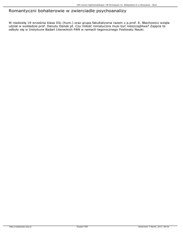 VIII Liceum Ogólnokształcące i 58 Gimnazjum im. Władysława IV w Warszawie - Start Romantyczni bohaterowie w zwierciadle psychoanalizy W niedzielę 19 września klasa IIIc (hum.) oraz grupa fakultatywna razem z p.prof. E. Błachowicz wzięła udział w wykładzie prof. Danuty Danek pt. Czy miłość romatyczna musi być nieszczęśliwa? Zajęcia te odbyły się w Instytucie Badań Literackich PAN w ramach tegorocznego Festiwalu Nauki. http://wladyslaw.edu.pl Kreator PDF Utworzono 7 March, 2017, 09:54