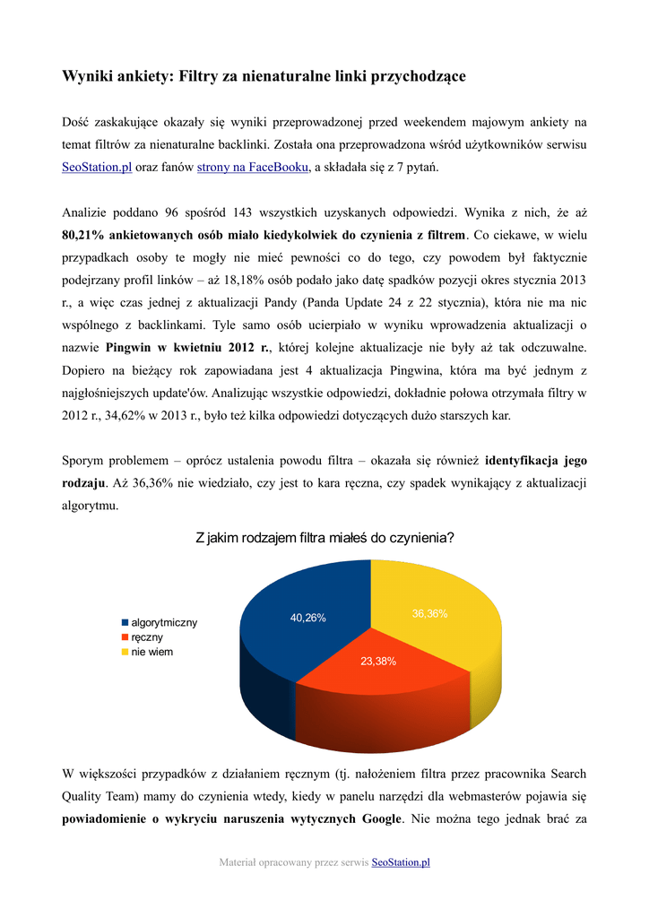 Wyniki ankiety: Filtry za nienaturalne linki przychodzące Dość zaskakujące okazały się wyniki przeprowadzonej przed weekendem majowym ankiety na temat filtrów za nienaturalne backlinki. Została ona przeprowadzona wśród użytkowników serwisu SeoStation.pl oraz fanów strony na FaceBooku, a składała się z 7 pytań. Analizie poddano 96 spośród 143 wszystkich uzyskanych odpowiedzi. Wynika z nich, że aż 80,21% ankietowanych osób miało kiedykolwiek do czynienia z filtrem. Co ciekawe, w wielu przypadkach osoby te mogły nie mieć pewności co do tego, czy powodem był faktycznie podejrzany profil linków – aż 18,18% osób podało jako datę spadków pozycji okres stycznia 2013 r., a więc czas jednej z aktualizacji Pandy (Panda Update 24 z 22 stycznia), która nie ma nic wspólnego z backlinkami. Tyle samo osób ucierpiało w wyniku wprowadzenia aktualizacji o nazwie Pingwin w kwietniu 2012 r., której kolejne aktualizacje nie były aż tak odczuwalne. Dopiero na bieżący rok zapowiadana jest 4 aktualizacja Pingwina, która ma być jednym z najgłośniejszych update'ów. Analizując wszystkie odpowiedzi, dokładnie połowa otrzymała filtry w 2012 r., 34,62% w 2013 r., było też kilka odpowiedzi dotyczących dużo starszych kar. Sporym problemem – oprócz ustalenia powodu filtra – okazała się również identyfikacja jego rodzaju. Aż 36,36% nie wiedziało, czy jest to kara ręczna, czy spadek wynikający z aktualizacji algorytmu. Z jakim rodzajem filtra miałeś do czynienia? algorytmiczny ręczny nie wiem 36,36% 40,26% 23,38% W większości przypadków z działaniem ręcznym (tj. nałożeniem filtra przez pracownika Search Quality Team) mamy do czynienia wtedy, kiedy w panelu narzędzi dla webmasterów pojawia się powiadomienie o wykryciu naruszenia wytycznych Google. Nie można tego jednak brać za Materiał opracowany przez serwis SeoStation.pl pewnik, ponieważ zdarzają się wyjątki od tej reguły. Natomiast przy karach algorytmicznych, powiadomienia musiałyby być wysyłane masowo i raczej przy większych aktualizacjach w Google nie należy się spodziewać jakichkolwiek informacji tego typu – a przynajmniej tak tłumaczył to John Mueller podczas jednego ze spotkań na żywo (tzw. hangoutów). Aby upewnić się, jaki rodzaj kary został zastosowany na naszych stronach, najlepiej jest skorzystać z formularza zgłoszenia ponownego rozpatrzenia. Jeśli na stronę nie została nałożona ręczna kara, informację o tym powinniśmy otrzymać dosłownie w ciągu kilku dni, w przeciwnym przypadku możemy czekać na odpowiedź nawet do 3 tygodni – taki okres najczęściej padał w odpowiedziach do ankiety. Przejdźmy teraz do najważniejszej kwestii, jaką są działania podejmowane przez pozycjonerów po nałożeniu kary na ich strony. W tym pytaniu można było wybrać dowolną liczbę odpowiedzi, a prezentują się one następująco: Na uwagę zasługuje fakt, że tylko 37,66% ankietowanych podjęło najważniejszy krok w likwidacji filtra, jakim jest zgłoszenie linków przez narzędzie disavow links tool, które powinno zostać poprzedzone usunięciem jak największej liczby linków podejrzanych o nałożenie kary (50,65%). Bez względu na rodzaj filtra (algorytmiczny lub ręczny) należy z tego narzędzia skorzystać, aby dać wyszukiwarce znać, które z linków powinny być ignorowane. W przypadku filtra algorytmicznego, wystarczy poczekać na przeindeksowanie zgłoszonych podstron z linkami, jednak do zdjęcia filtra ręcznego niezbędne jest dodatkowe wysłanie zgłoszenia ponownego rozpatrzenia, ponieważ to pracownik SQT decyduje o ewentualnym cofnięciu kary. Jak się zatem okazuje, głównym powodem decydującym o borykaniu się z filtrem przez długi okres, jest niewłaściwe postępowanie i pomijanie najważniejszych działań. Wniosek ten potwierdzają dodatkowe konsultacje przeprowadzone przez nas z ankietowanymi, którzy pozostawili swoje dane kontaktowe. Na zakończenie dodamy, że ponad 25% ankietowanych nie podjęła żadnych działań, decydując się na czekanie na wygaśnięcie filtra – pewnie dlatego czas oczekiwania na jego zdjęcie u niektórych przekracza nawet rok, a filtr nadal się utrzymuje. Dlatego tym bardziej zachęcamy do zapoznania się z poradnikiem „Filtry Google od A do Z” oraz z artykułem „Narzędzie disavow links tool krok po kroku”, które pozwolą Wam poznać szczegóły na ten temat jak najlepiej i skutecznie pozbyć się filtrów. Materiał opracowany przez serwis SeoStation.pl