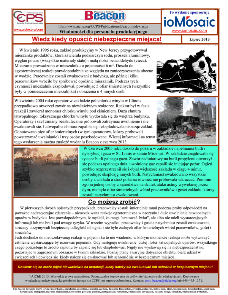 To wydanie sponsoruje www.aiche.org/ccps http://www.aiche.org/CCPS/Publications/Beacon/index.aspx Wiadomości dla personelu produkcyjnego Wiedz kiedy opuścić niebezpieczne miejsca! www.iomosaic.com Lipiec 2015 W kwietniu 1995 roku, zakład produkcyjny w New Jersey przygotowywał mieszankę produktów, która zawierała podsiarczyn sodu, proszek aluminiowy, węglan potasu (wszystkie materiały stałe) i małą ilości benzaldehydu (ciecz). Mieszanie prowadzono w mieszalniku o pojemności 6 m3. Doszło do egzotermicznej reakcji prawdopodobnie ze względu na zanieczyszczenia obecne w wodzie. Pracownicy zostali ewakuowani z budynku, ale później kilku pracowników wróciło by spróbować opróżnić mieszalnik. Podczas tych czynności mieszalnik eksplodował, powodując 5 ofiar śmiertelnych (wszystkie były w pomieszczeniu mieszalnika) i obrażenia u 4 innych osób. W kwietniu 2004 roku operator w zakładzie polichlorku winylu w Illinois przypadkowo otworzył zawór na niewłaściwym reaktorze. Reaktor był w fazie reakcji i zawierał monomer chlorku winylu pod ciśnieniem. Duża chmura łatwopalnego, toksycznego chlorku winylu wydostała się do wnętrza budynku. Operatorzy i szef zmiany bezskutecznie próbowali zatrzymać uwolnienie i nie ewakuowali się. Łatwopalna chmura zapaliła się i eksplodowała niszcząc zakład. Odnotowano pięć ofiar śmiertelnych (w tym operatorów, którzy próbowali powstrzymać uwalnianie) i trzy osoby poszkodowane. Więcej informacji na temat tego wydarzenia można znaleźć wydaniu Beacon z czerwca 2013. W czerwcu 2005 roku doszło do pożaru w zakładzie napełniania butli i dystrybucji gazu w St. Louis w stanie Missouri. W zakładzie znajdowało się tysiące butli palnego gazu. Zawór nadmiarowy na butli propylenu otworzył się podczas upalnego dnia, uwolniony gaz zapalił się inicjując pożar. Ogień szybko rozprzestrzenił się i objął większość zakładu w ciągu 4 minut, powodując eksplozję innych butli. Natychmiast ewakuowano wszystkie osoby z zakładu a straż pożarna również nie próbowała wkraczać. Pomimo zgonu jednej osoby z sąsiedztwa na skutek ataku astmy wywołanej przez dym, nie było ofiar śmiertelnych wśród pracowników i gości zakładu, którzy zostali natychmiast ewakuowani. Co możesz zrobić? W pierwszych dwóch opisanych przypadkach, pracownicy zostali śmiertelnie ranni podczas próby odpowiedzi na poważne nadzwyczajne zdarzenie – nieoczekiwana reakcje egzotermiczna w naczyniu i duże uwolnienie łatwopalnych oparów w budynku. Jest prawdopodobnym, iż myśleli, że mogą "uratować świat", ale albo nie mieli wystarczających informacji lub nie brali pod uwagę ryzyka. W trzecim wypadku, pracownicy i goście natychmiast zostali ewakuowani, strażacy utrzymywali bezpieczną odległość od ognia i nie było żadnych ofiar śmiertelnych wśród pracowników, gości i strażaków. Jeśli dochodzi do nieoczekiwanej reakcji w pojemniku to nie wiadomo, w którym momencie reakcja może wytworzyć ciśnienie wystarczające by rozerwać pojemnik. Gdy następuje uwolnienie dużej ilości łatwopalnych oparów, wszystkiego czego potrzebuje to źródło zapłonu by zapalić się lub eksplodować. Nigdy nie wystawiaj się na niebezpieczeństwo, pozostając w zagrożonym obszarze w twoim zakładzie. Poznaj plany awaryjne dotyczące obiektu, bierz udział w ćwiczeniach i dowiedz się kiedy należy się ewakuować lub schronić się w bezpiecznym miejscu. Dowiedz się co może pójść niewłaściwie na instalacji, kiedy należy się ewakuować lub schronić w bezpiecznym miejscu! ©AIChE 2015. Wszystkie prawa zastrzeżone. Dopuszczalne kopiowanie do celów nie-biznesowych i edukacyjnych. Kopiowanie w celach sprzedaży przez kogokolwiek innego niż CCPS jest surowo zabronione. Kontakt: [email protected] lub 646-495-1371. The Beacon dostępny jest w językach: afrikaans, angielskim, arabskim, chińskim, czeskim, duńskim, francuskim, greckim, gudżarati, hebrajskim, hindi, hiszpańskim, holenderskim, japońskim, koreańskim, malajskim, marathi, niemieckim, norweskim, perskim, polskim, portugalskim, rosyjskim, rumuńskim, szwedzkim, tajskim, telugu, tureckim, wietnamskim i włoskim.