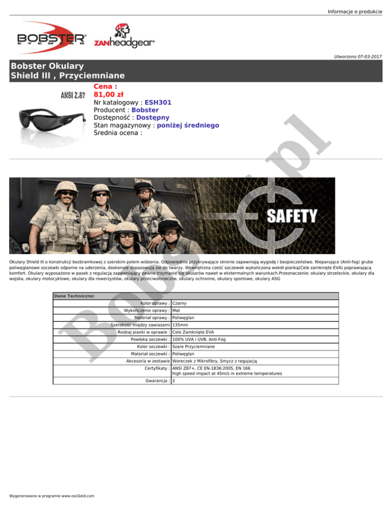 Informacje o produkcie Utworzono 07-03-2017 Bobster Okulary Shield III , Przyciemniane Cena : 81,00 zł st er .p l Nr katalogowy : ESH301 Producent : Bobster Dostępność : Dostępny Stan magazynowy : poniżej średniego Średnia ocena : ob Okulary Shield III o konstrukcji bezbramkowej z szerokim polem widzenia. Odpowiednio przykrywające skronie zapewniają wygodę i bezpieczeństwo. Nieparujące (Anti-fog) grube poliwęglanowe soczewki odporne na uderzenia, doskonale dopasowują sie do twarzy. Wewnętrzna cześć soczewek wykończona wokół pianką(Cele zamknięte EVA) poprawiającą komfort. Okulary wyposażono w pasek z regulacją zapewniający pewne trzymanie się okularów nawet w ekstermalnych warunkach.Przeznaczenie: okulary strzeleckie, okulary dla wojska, okulary motocyklowe, okulary dla rowerzystów, okulary przeciwsłoneczne, okulary ochronne, okulary sportowe, okulary ASG Dane Techniczne: Kolor oprawy : Czarny Wykończenie oprawy : Mat Materiał oprawy : Poliwęglan B Szerokość między zawiasami 135mm Rodzaj pianki w oprawie : Cele Zamknięte EVA Powłoka soczewki : 100% UVA i UVB, Anti-Fog Kolor soczewki : Szare Przyciemniane Materiał soczewki : Poliwęglan Akcesoria w zestawie Woreczek z Mikrofibry, Smycz z regujacją Certyfikaty : ANSI Z87+, CE EN-1836:2005, EN 166 high speed impact at 45m/s in extreme temperatures Gwarancja : 2 Wygenerowano w programie www.oscGold.com