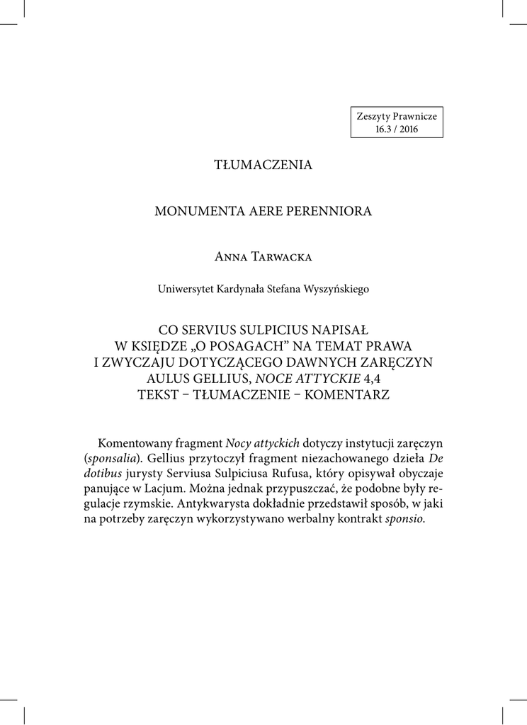 Zeszyty Prawnicze 16.3 / 2016 TŁUMACZENIA MONUMENTA AERE PERENNIORA Anna Tarwacka Uniwersytet Kardynała Stefana Wyszyńskiego CO SERVIUS SULPICIUS NAPISAŁ W KSIĘDZE „O POSAGACH” NA TEMAT PRAWA I ZWYCZAJU DOTYCZĄCEGO DAWNYCH ZARĘCZYN AULUS GELLIUS, NOCE ATTYCKIE 4,4 TEKST – TŁUMACZENIE – KOMENTARZ Komentowany fragment Nocy attyckich dotyczy instytucji zaręczyn (sponsalia). Gellius przytoczył fragment niezachowanego dzieła De dotibus jurysty Serviusa Sulpiciusa Rufusa, który opisywał obyczaje panujące w Lacjum. Można jednak przypuszczać, że podobne były regulacje rzymskie. Antykwarysta dokładnie przedstawił sposób, w jaki na potrzeby zaręczyn wykorzystywano werbalny kontrakt sponsio. 242 Anna Tarwacka [2] AULI GELLII ‘NOCTES ATTICAE’ 4,4 QUID SERVIUS SULPICIUS IN LIBRO, QUI EST DE DOTIBUS, SCRIPSERIT DE IURE ATQUE MORE VETERUM SPONSALIORUM 1. Sponsalia in ea parte Italiae, quae Latium appellatur, hoc more atque iure solita fieri scripsit Servius Sulpicius in libro, quem scripsit de dotibus: 2. „Qui uxorem” inquit „ducturus erat, ab eo, unde ducenda erat, stipulabatur eam in matrimonium datum. . . iri; qui ducturus erat, itidem spondebat. Is contractus stipulationum sponsionumque dicebatur „sponsalia”. Tunc, quae promissa erat, „sponsa” appellabatur, qui spoponderat ducturum, „sponsus”. Sed si post eas stipulationis uxor non dabatur aut non ducebatur, qui stipulabatur, ex sponsu agebat. Iudices cognoscebant. Iudex quamobrem data acceptave non esset uxor quaerebat. Si nihil iustae causae videbatur, litem pecunia aestimabat, quantique interfuerat eam uxorem accipi aut dari, eum, qui spoponderat, ei qui stipulatus erat, condemnabat.” 3. Hoc ius sponsaliorum observatum dicit Servius ad id tempus, quo civitas universo Latio lege Iulia data est. 4. Haec eadem Neratius scripsit in libro quem de nuptiis composuit. [3] Aulus Gellius, Noce attyckie243 AULUS GELLIUS, ‘NOCE ATTYCKIE’ 4,4 CO SERVIUS SULPICIUS NAPISAŁ W KSIĘDZE „O POSAGACH” NA TEMAT PRAWA I ZWYCZAJU DOTYCZĄCEGO DAWNYCH ZARĘCZYN 1. Servius Sulpicius napisał w księdze „O posagach”, że zaręczyny w tej części Italii, którą zwie się Lacjum, zwykły się odbywać przy zachowaniu takiego zwyczaju i prawa: 2. „Ten,” rzekł „kto miał wziąć żonę, od tego, od którego miała ona być wzięta, odbierał przysięgę, że zostanie ona dana w małżeństwo, a ten, kto ją miał wziąć, przyrzekał wzajemnie. Ten kontrakt pytań i przyrzeczeń był nazywany sponsalia. Stąd ta, która była przyrzeczona, była nazywana sponsa (narzeczona), a ten, kto przyrzekł ją wziąć – sponsus (narzeczony). Ale jeśli po tych stypulacjach żona nie była dawana lub brana, ten, kto zawarł stypulację, wnosił skargę na podstawie przysięgi. Sędziowie rozpoznawali [te sprawy]. Sędzia badał, z jakiego powodu żona nie została dana lub przyjęta. Jeśli wydawało się, że ma żadnej słusznej przyczyny, wyceniał spór w pieniądzach, i na tyle, ile było warte przyjąć ją lub dać za żonę, zasądzał tego, kto przyrzekł na rzecz tego, kto przyjął przyrzeczenie”. 3. Servius mówi, że to prawo zaręczyn było przestrzegane do czasu, kiedy obywatelstwo zostało nadane całemu Lacjum na mocy lex Iulia. 4. To samo napisał Neratius w księdze o małżeństwach, którą stworzył. 244 Anna Tarwacka [4] Komentarz Zaręczyny były ważną instytucją rzymskiego prawa małżeńskiego, interesującą dla jurystów. Dzięki Gelliusowi wiadomo dziś sporo na temat wczesnego etapu jej rozwoju. Zagadnienia te były przedmiotem szczegółowych badań Henryka Kupiszewskiego oraz – jeśli chodzi o komentowany fragment Nocy attyckich – Jana Zabłockiego. Definicja zaręczyn zachowała się Digestach. Florus napisał, że sponsalia to zapowiedź i przyrzeczenie późniejszego małżeństwa (mentio et repromissio nuptiarum futurarum – D. 23,1,1). Z zacytowanego przez Gelliusa dzieła De dotibus jurysty Serviusa Sulpiciusa Rufusa dowiedzieć się można, w jaki sposób celebrowano zaręczyny na terenach Lacjum. Polegało to na zawarciu kontraktu werbalnego sponsio między ojcem przyszłej panny młodej a narzeczonym, przy czym jednostronne zerwanie umowy uprawniało drugą stronę do wniesienia skargi (actio ex stipulatu). Powołany w procesie sędzia oceniał zasadność roszczenia i – jeśli uznał zerwanie zaręczyn za bezzasadne – zasądzał na kwotę, na którą wycenił wartość sporu. Ograniczanie zastosowania tej regulacji tylko do Lacjum wydaje się bezpodstawne. Zarówno z dzieła Warrona (De ling. Lat. 6,69-72), jak i z Digestów (Ulp. D. 23,1,2) wynika, że w Rzymie zaręczyny wyglądały tak samo. Warron podał dodatkowo (De ling. Lat. 6,71), że – oprócz odpowiedzialności ad legem – zrywający zaręczyny mógł też odpowiadać ad aequum, czyli na podstawie zasad słuszności, w ramach iudicium censorium, czyli w postępowaniu przed cenzorem. Poza zasądzeniem w procesie, możliwa była zatem również sankcja w postaci noty cenzorskiej. Przebieg zaręczyn dobrze dokumentują zachowane komedie Plauta (Aul. 204-205; Curc. 670-671; Poen. 1156-1157; Trin. 1156-1168) i Terencjusza (Andr. 100-102; Phorm. 924-925), co zresztą odnotował już Warron (De ling. Lat. 6,71-72). Na pytanie: Spondesne tuam gnatam uxorem mihi? – „Czy przyrzekasz dać mi swoją córkę za żonę?”, ojciec dziewczyny odpowiadał: Spondeo – „Przyrzekam”. Możliwe było także zawarcie kontraktu między dwoma ojcami. Wówczas ojciec przyszłego pana młodego zadawał pytanie dotyczące oddania dziewczyny za żonę jego synowi. [5] Aulus Gellius, Noce attyckie245 Warto dodać, że symbolem zaręczyn był pierścień. Zakładano go na serdeczny palec lewej ręki, skąd, jak sądzono, biegł nerw do samego serca (Gell. 10,10). Etymologicznie od terminu sponsalia wywodzą się słowa sponsa i sponsus, oznaczające odpowiednio narzeczoną i narzeczonego (por. Varr., De ling. L