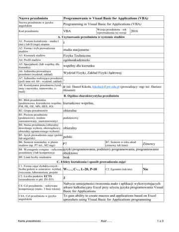 Nazwa przedmiotu Programowanie w Visual Basic for Applications (VBA) Nazwa przedmiotu w języku angielskim Programming in Visual Basic for Applications (VBA) Kod przedmiotu VBA Wersja przedmiotu - rok wprowadzenia tej wersji 2016 A. Usytuowanie przedmiotu w systemie studiów A1. Poziom kształcenia - studia I (inż.) lub II (mgr) stopnia A2. Forma i tryb prowadzenia studiów A3. Kierunek studiów I studia stacjonarne Fizyka Techniczna ogólnoakademicki A4. Profil studiów A5. Specjalność (lub wspólny dla wspólny dla kierunku kierunku) A6. Jednostka prowadząca Wydział Fizyki, Zakład Fizyki Jądrowej przedmiot (wydział, zakład) A7. Jednostka realizująca przedmiot (jeśli inna niż A6 - wydział, zakład) A8. Koordynator przedmiotu (tytuł, dr inż. Daniel Kikoła, [email protected] (prowadzący: mgr inż. Dariusz imię i nazwisko, stanowisko, eAksamit) mail) B. Ogólna charakterystyka przedmiotu B1. Blok przedmiotów (podstawowe, kierunkowe wspólne, FM, FK, OE, MN, HES, JO) kierunkowe wspólne, B2. Grupa przedmiotów obieralne B3. Poziom przedmiotu (podstawowy, średnio podstawowy zaawansowany, zaawansowany) B4. Status przedmiotu (obieralny dowolnego wyboru, obowiązkowy, obieralny obieralny ograniczonego wyboru) B5. Język prowadzenia zajęć (polski polski lub angielski) B6. Semestr nominalny w planie P7 studiów (np. P7 inż., M2 mgr) B8. Wymagania wstępne - zaliczone języki programowania, przedmioty i/lub kompetencje obiektowe B9. Limit liczby studentów B7. Semestr w roku akad. (zimowy lub letni) Zimowy podstawy programowania, programowanie brak C. Efekty kształcenia i sposób prowadzenia zajęć C1. Forma zajęć dydaktycznych liczba godzin w semestrze: wykład, ćwiczenia, laboratorium, projekt C3. Liczba punktów ECTS (uzasadnienie w pkt. D1-D3) C4. Cel przedmiotu – nabywane kompetencje (maks. 3 linie tekstu) C4A. Cel przedmiotu w języku angielskim W-…, C-.., L-20, P-10 C2. Egzamin (tak/nie) Nie 2 Nabycie umiejętności tworzenia makr i aplikacji wykorzystujących arkusz kalkulacyjny Excel przy użyciu języka programowania Visual Basic for Applications To gain ability to create macros and applications based on Excel spreeshets using Visual Basic for Applications programming Karta przedmiotu ................................................................... Kod ...... 1z3 L: 1. Przypomnienie podstaw Excela (najważniejsze formuły, adresowanie, odwołania, typy zmiennych, tabele przestawne, wykresy etc.) 2. Przykłady wykorzystania dodatku Analysis ToolPack (analiza Fouriera, tworzenie histogramów, generator licz pseudolosowych, korelacje) 3. Praca z rejestratorem makr w Excelu i zapoznanie się z Edytorem Visual Basic 4. Język VBA – obiekty i zbiory, odwoływanie się do obiektów, obiekty typu Windows, Workbooks, Worksheets, Charts, Names, Range, Cells, Offset… 5. Programowanie w VBA – manipulowanie obiektami i zbiorami C5. Treści kształcenia (podać dla (konstrukcje With… End With, For Each… Next), sterowanie procedurami każdej z form zajęć dydaktycznych) (konstrukcje If… Then, Select Case), pętle; 6. Tworzenie procedury Sub i sposoby jej wywoływania 7. Operacje wykonywane na plikach 8. Uruchamianie innych aplikacji z poziomu VBA. Zarządzanie Excelem z Worda i Wordem z Excela 9. Zasady projektowanie różnych typów aplikacji arkusza kalkulacyjnego 10. Tworzenie okien dialogowych i interfejsów (InputBox, MsgBox, Formularz UserForm), menu i pasków narzędzi P: Stworzenie użytkowej aplikacji związanej z automatyzacją analizy danych lub innym usprawnieniem pracy w laboratorium (projekty własne lub z listy) L: 1. Excel – reminder (most used formulas, adressing, references, tables, types of variables, charts etc.) 2. Use of Analysis ToolPack (Fourir analysis, creating histograms, random number generators, corelations) 3. Work with build-in registrator. Work with Visual Basic Editor. 4. VBA – objects and collections, reference to them, important collections: Windows, Workbooks, Worksheets, Charts, Names, Range, Cells, Offset 5. Programming in VBA – manipulation on collections (With… End With, C5A: Treści kształcenia w języku For Each… Next constructions), procedures (If… Then, Select Case) angielskim 6. Creating Sub routine and methods for calling 7. File operations 8. Running other applications by VBA. Management of Word from Excel and Excel from Word 9. Principles of designin different types of applications 10. Creating dialog windows and interfaces (InputBox, MsgBox, UserForm), menu, toolbox P: Design and program application devoted to automatize data analysis or other improvement in laboratory word (project prom list or own) L: Na każdych zajęciach do wykonania jest lista kilku prostych programów, za wykonanie każdego zdobywa się punkty, na koniec zajęć są one C6. Metody oceny – krótki sumowane. Waga – jeden. regulamin zaliczenia przedmiotu P: Na podstawie zdobytej wiedzy studenci stworzą aplikację optymalizującą pracę w laboratorium. Waga – jeden. C7. Literatura (spis podręczników i Excel 2003 PL. Programowanie w VBA. Vademecum profesjonalisty, John lektur uzupełniających) Walkenbach, wydawnictwo Helion C8. Witryna www przedmiotu http://www.knf.pw.edu.pl/~aksamit/VBA/ (w przygotowaniu) Karta przedmiotu ................................................................... Kod ...... 2z3 D. Nakład pracy studenta D1. Liczba godzin pracy studenta związanych z osiągnięciem efektów Uczestniczenie w laboratoriach 20 h, kształcenia (nakład pracy dla Przygotowanie do laboratoriów 20 h różnych form zajęć, praca własna, przygotowanie do sprawdzianów, Przygotowanie projektu 10 h egzamin). Razem liczba godzin w Razem w semestrze 50 h, co odpowiada 2 przybliżeniu równa liczba ECTSx25 D2 Liczba punktów ECTS na Prowadzenie laboratoriów 20h zajęciach wymagających Konsultacje projektu 20 h bezpośredniego udziału nauczycieli Razem 20h, co odpowiada 1,5 pkt ECTS akademickich: D3. Liczba punktó