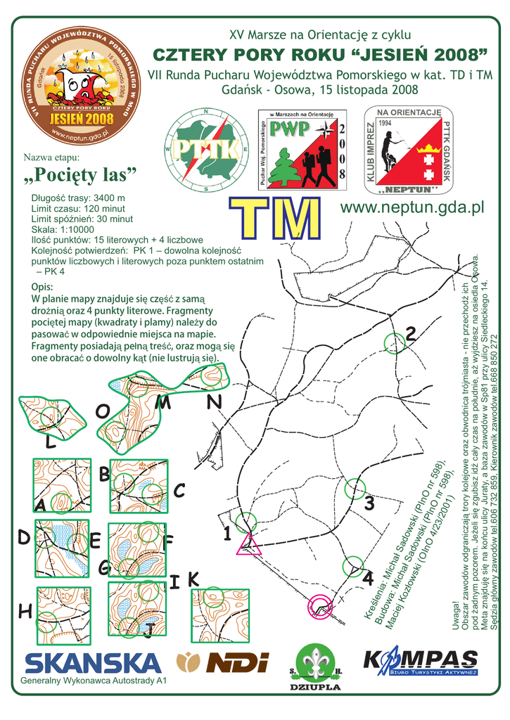 XV Marsze na Orientacjê z cyklu CZTERY PORY ROKU “JESIEÑ 2008” VII Runda Pucharu Województwa Pomorskiego w kat. TD i TM Gdañsk - Osowa, 15 listopada 2008 Nazwa etapu: „Pociêty las” TM Kre Bu œlenia d Ma owa: : Mich ci e j Ko Micha a³ Sad ³ o z³o ws Sado wski ki ( ws OIn ki ( (PInO O 4 PIn n /23 O n r 598 r /20 ) 0 1 ) 5 9 8 ), , Opis: W planie mapy znajduje siê czêœæ z sam¹ dro¿ni¹ oraz 4 punkty literowe. Fragmenty pociêtej mapy (kwadraty i plamy) nale¿y do pasowaæ w odpowiednie miejsca na mapie. Fragmenty posiadaj¹ pe³n¹ treœæ, oraz mog¹ siê one obracaæ o dowolny k¹t (nie lustruj¹ siê). www.neptun.gda.pl Uwaga! Obszar zawodów odgraniczaj¹ trory kolejowe oraz obwodnica trójmiasta - nie przechodŸ ich pod ¿adnym pozorem. Je¿eli siê zgubisz idŸ ca³y czas na po³udnie, a¿ wyjdziesz na osiedla Osowa. Meta znajdujê siê na koñcu ulicy Juraty, a baza zawodów w Sp81 przy ulicy Siedleckiego 14. Sêdzia g³ówny zawodów tel.606 732 859, Kierownik zawodów tel.668 850 272 D³ugoœæ trasy: 3400 m Limit czasu: 120 minut Limit spóŸnieñ: 30 minut Skala: 1:10000 Iloœæ punktów: 15 literowych + 4 liczbowe Kolejnoœæ potwierdzeñ: PK 1 – dowolna kolejnoœæ punktów liczbowych i literowych poza punktem ostatnim – PK 4 Generalny Wykonawca Autostrady A1