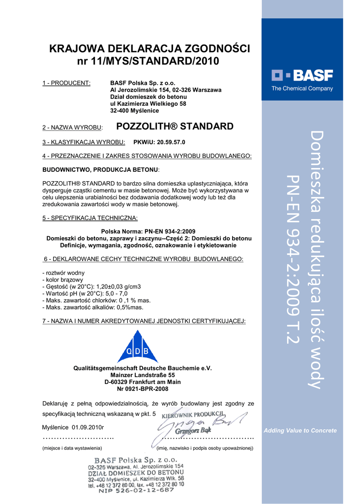 KRAJOWA DEKLARACJA ZGODNOŚCI nr 11/MYS/STANDARD/2010 1 - PRODUCENT: BASF Polska Sp. z o.o. Al Jerozolimskie 154, 02-326 Warszawa Dział domieszek do betonu ul Kazimierza Wielkiego 58 32-400 Myślenice POZZOLITH® STANDARD 3 - KLASYFIKACJA WYROBU: PKWiU: 20.59.57.0 4 - PRZEZNACZENIE I ZAKRES STOSOWANIA WYROBU BUDOWLANEGO: BUDOWNICTWO, PRODUKCJA BETONU: POZZOLITH® STANDARD to bardzo silna domieszka uplastyczniająca, która dysperguje cząstki cementu w masie betonowej. Może być wykorzystywana w celu ulepszenia urabialności bez dodawania dodatkowej wody lub też dla zredukowania zawartości wody w masie betonowej. 5 - SPECYFIKACJA TECHNICZNA: Polska Norma: PN-EN 934-2:2009 Domieszki do betonu, zaprawy i zaczynu--Część 2: Domieszki do betonu Definicje, wymagania, zgodność, oznakowanie i etykietowanie 6 - DEKLAROWANE CECHY TECHNICZNE WYROBU BUDOWLANEGO: - roztwór wodny - kolor brązowy - Gęstość (w 20°C): 1,20±0,03 g/cm3 - Wartość pH (w 20°C): 5,0 - 7,0 - Maks. zawartość chlorków: 0 ,1 % mas. - Maks. zawartość alkaliów: 0,5%mas. 7 - NAZWA I NUMER AKREDYTOWANEJ JEDNOSTKI CERTYFIKUJĄCEJ: Qualitätsgemeinschaft Deutsche Bauchemie e.V. Mainzer Landstraße 55 D-60329 Frankfurt am Main Nr 0921-BPR-2008 Domieszka redukująca ilość wody PN-EN 934-2:2009 T.2 2 - NAZWA WYROBU: Deklaruję z pełną odpowiedzialnością, że wyrób budowlany jest zgodny ze specyfikacją techniczną wskazaną w pkt. 5 Myślenice 01.09.2010r …………………….. (miejsce i data wystawienia) ……..…………………….. (imię, nazwisko i podpis osoby upoważnionej) Adding Value to Concrete