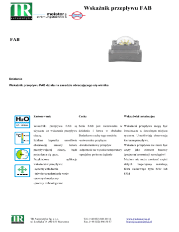 Wskaźnik przepływu FAB FAB Działanie Wskaźnik przepływu FAB działa na zasadzie obracającego się wirnika Zastosowanie Wskaźniki Cechy przepływu FAB Wskazówki instalacyjne są Seria FAB jest niezawodna w Wskaźniki przepływu mogą być używane do wskazania przepływu działaniu i łatwa w obsłudze. instalowane w dowolnym miejscu cieczy. Szklana Dodatkowe cechy tego modelu: kapsułka obserwację przepływającej umożliwia -uniwersalne przyłącze zmiany koloru -dwukierunkowy przepływ cieczy, kierunku przepływu. Wskaźnik przepływu nie może być bądź -odporność na wysokie temperatury użyty pojawienia się gazu. Przykładowe systemu. Umożliwiają obserwację -specjalny gwint na żądanie aplikacje jako element bazowy (podpora) konstrukcji rurociągów! Medium nie może zawierać części wskaźników przepływu: stałych! Sugerujemy -systemy chłodzenia filtru siatkowego typu SFD lub -inżynieria uzdatnianie wody SFM -przemysł medyczny -procesy technologiczne TR Automatyka Sp. z o.o. ul. Lechicka 14 ; 02-156 Warszawa Tel. (+48 022) 886 10 16 Fax. (+48 022) 846 50 37 www.trautomatyka.pl [email protected] instalację Wskaźnik przepływu FAB Dostępne modele FAB: Typ Przepływ Spadek DN H2O ciśnienia [m min. max (at V = 2 m/s) m] [l/min] [bar] G A [mm] B [mm] C [mm] Weaga [kg] FAB-8 0,7 - 30 0,14 8 1/4" 76 63 65 0,68 FAB-10 0,8 - 40 0,16 10 3/8" 76 63 65 0,65 FAB-15 1,0 - 55 0,22 15 1/2" 76 63 65 0,62 FAB-20 1,2 - 90 0,19 20 3/4" 89 63 83 1,25 FAB-25 1,5 - 140 0,5 25 1" 89 63 83 1,2 Warunki pracy: FAB Maksymalne ciśnienie pracy: PN 16 bar Maksymalna temperatura pracy 200°C Spadek ciśnienia patrz tabela powyżej Materiał Brąz - wersja Stal kwasoodporna - wersja Korpus Brąz (LG2) Stal kwasoodporna - 1,4408 Przyłącze Brąz Stal kwasoodporna Sprężyna Tworzywo PPS żółte Szkło Borokrzemian O-ring Viton Uszczelnienie Klingersil (C-4400) Nakrętka Stal kwasoodporna TR Automatyka Sp. z o.o. ul. Lechicka 14 ; 02-156 Warszawa Tel. (+48 022) 886 10 16 Fax. (+48 022) 846 50 37 www.trautomatyka.pl [email protected]