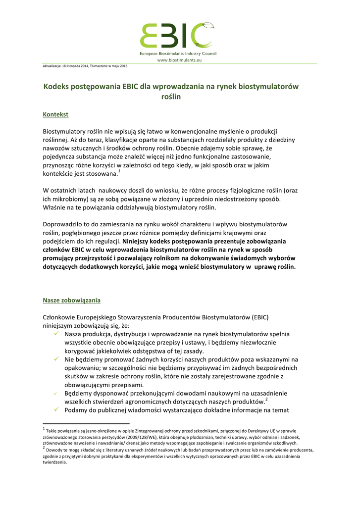 www.biostimulants.eu Aktualizacja:18listopada2014,Tłumaczonewmaju2016 KodekspostępowaniaEBICdlawprowadzanianarynekbiostymulatorów roślin Kontekst Biostymulatoryroślinniewpisująsięłatwowkonwencjonalnemyślenieoprodukcji roślinnej.Ażdoteraz,klasyfikacjeopartenasubstancjachrozdzielałyproduktyzdziedziny nawozówsztucznychiśrodkówochronyroślin.Obecniezdajemysobiesprawę,że pojedynczasubstancjamożeznaleźćwięcejniżjednofunkcjonalnezastosowanie, przynoszącróżnekorzyściwzależnościodtegokiedy,wjakisposóborazwjakim kontekściejeststosowana.1 Wostatnichlatachnaukowcydoszlidowniosku,żeróżneprocesyfizjologiczneroślin(oraz ichmikrobiomy)sązesobąpowiązanewzłożonyiuprzednioniedostrzeżonysposób. Właśnienatepowiązaniaoddziaływująbiostymulatoryroślin. Doprowadziłotodozamieszanianarynkuwokółcharakteruiwpływubiostymulatorów roślin,pogłębionegojeszczeprzezróżnicepomiędzydefinicjamikrajowymioraz podejściemdoichregulacji.Niniejszykodekspostępowaniaprezentujezobowiązania członkówEBICwceluwprowadzeniabiostymulatorówroślinnarynekwsposób promującyprzejrzystośćipozwalającyrolnikomnadokonywanieświadomychwyborów dotyczącychdodatkowychkorzyści,jakiemogąwnieśćbiostymulatorywuprawęroślin. Naszezobowiązania CzłonkowieEuropejskiegoStowarzyszeniaProducentówBiostymulatorów(EBIC) niniejszymzobowiązująsię,że: ü Naszaprodukcja,dystrybucjaiwprowadzanienarynekbiostymulatorówspełnia wszystkieobecnieobowiązująceprzepisyiustawy,ibędziemyniezwłocznie korygowaćjakiekolwiekodstępstwaoftejzasady. ü Niebędziemypromowaćżadnychkorzyścinaszychproduktówpozawskazanymina opakowaniu;wszczególnościniebędziemyprzypisywaćimżadnychbezpośrednich skutkówwzakresieochronyroślin,któreniezostałyzarejestrowanezgodniez obowiązującymiprzepisami. ü Będziemydysponowaćprzekonującymidowodaminaukowyminauzasadnienie wszelkichstwierdzeńagronomicznychdotyczącychnaszychproduktów.2 ü Podamydopublicznejwiadomościwystarczającodokładneinformacjenatemat 1 TakiepowiązaniasąjasnookreślonewopisieZintegrowanejochronyprzedszkodnikami,załączonejdoDyrektywyUEwsprawie zrównoważonegostosowaniapestycydów(2009/128/WE),któraobejmujepłodozmian,technikiuprawy,wybórodmianisadzonek, zrównoważonenawożenieinawadnianie/drenażjakometodywspomagającezapobieganieizwalczanieorganizmówszkodliwych. 2 Dowodytemogąskładaćsięzliteraturyuznanychźródełnaukowychlubbadańprzeprowadzonychprzezlubnazamówienieproducenta, zgodniezprzyjętymidobrymipraktykamidlaeksperymentówiwszelkichwytycznychopracowanychprzezEBICwceluuzasadnienia twierdzenia. Kodekspostępowania|Zatwierdzony|11czerwca2013|Strona2 dostępnychdowodównaukowychwceluumożliwieniadokonaniaświadomych decyzjidotyczącychzakupuistosowaniaoraz,wraziepotrzebyudzielimywładzom dostępudopełnychdanychznaszychbadań,zzastrzeżeniemochronydanychi przepisówopoufności. ü Zobowiązanianiniejszegokodeksupostępowaniabędąwdalszymciąguumacniane poprzeznastępującedziałania: o Kodeksbędziesystematycznieprzeglądanyiuaktualnianywraziepotrzeby,w celuuwzględnieniaodpowiednichregulacji,rozwojumiędzyinnymi naukowegoitechnicznego; o Wytycznedotyczącepostępowaniabędąopartenaróżnychspecyfikacjach technicznychiprodukcyjnych,abywspomócfirmywskutecznymrealizowaniu ichzobowiązań,wtymwskazówkach,wjakisposóbwspieraćinformacjeo właściwościachkonkretnegoproduktuorazwjakisposóbjeprzekazywać; o Wstosownymczasiezostanieopracowanyznakzapewnieniajakości,który posłużyuprawnionymproducentombiostymulatorów(członkomEBIC)do przekazaniainteresariuszominformacjioposzanowaniuprzeznichniniejszych zobowiązań. Wjakisposóbrealizujemynaszezobowiązania ü WciągutrzechmiesięcyodpodpisaniaKodeksuPostępowania(jedenzwarunków przystąpieniadoEBIC),każdyczłonekEBICopracujeplanzapewniającyjego przestrzeganieiprzedłożygowsekretariacieEBIC.Użytkownicy,którzynie przedstawiliplanówzapewnieniazgodności,niebędąmogliodnowićswojego członkostwanakolejnyrok.(FirmyprzystępującedoEBICmniejniżtrzymiesiące przedkońcemrokuczłonkostwamogąodnowićzanimplanzostanie przedstawiony,aleniebędąmogłyodnowićwkolejnychlatach,jeśliwaruneknie zostaniespełniony.) ü KażdyczłonekEBICopracujeplanzapewnieniazgodnościwewnętrznej.Plankażdej spółkizostaniezłożonywsekretariacieEBIC.Planyzgodnościmogąobejmować międzyinnyminastępującedziałaniauznanezaniezbędneprzezczłonka: o (Ponowne)szkolenieodpowiednichpracownikówipartnerówwcelu zwiększeniazrozumieniaizobowiązaniadoprzestrzeganiazasadzawartychw niniejszymKodeksiepostępowania; o Przeglądetykiet,prospektówmarketingowychipozostałejdokumentacjiw celuzapewnieniaprzestrzeganiapostanowieńniniejszegoKodeksu postępowania; ü SekretariatEBICbędzieprowadzićdedykowanąwitrynęinternetowądotyczącą Kodeksupostępowania,naktórejznajdąsiędalszeszczegółynatematwdrożenia Kodeksuinajnowszewiadomościztymzwiązane: ü www.biostimulants.eu/ebic-code-of-conduct. ü Wprzypadkuopracowaniaznakujakości,członkowieEBICwstosownych przypadkachmogązamieszczaćgonaswoichetykietachimateriałach marketingowych3,wceluzakomunikowaniaswojegozobowiązaniado przestrzeganianiniejszegoKodeksupostępowania. 3 Naprzykład,zzastrzeżeniemlokalnychregulacjidotyczącychwykorzystaniaznakówjakościnaopakowaniachietykietach. Kodekspostępowania|Zatwierdzony|11czerwca2013|Strona2 Cosięstanie,jeślifirmynieprzestrzegająswoichzobowiązańwynikającychzniniejszego Kodeksupostępowania? ü RaportniezgodnościzniniejszymKodeksempostępowaniazostanieprzekazanydo rozpatrzeniadosekretariatuEBIC.Jeślizarzutzostanieuznanyzazasadny,sprawa zostanieprzedstawionaniezależnejkomisji(złożonejzodpowiednichpodmiotów spozaczłonkówEBIC,powołanychprzezZarządEBIC)4dozaopiniowania. ü Woparciuoopinięniezależnejkomisji,ZarządEBICpodejmierozmowyzdaną spółkąwceluznalezieniawodpowiednimczasiepolubownegorozwiązaniasprawy. ü OstatecznąsankcjązadalszenieposzanowaniepostanowieńKodeksujest 