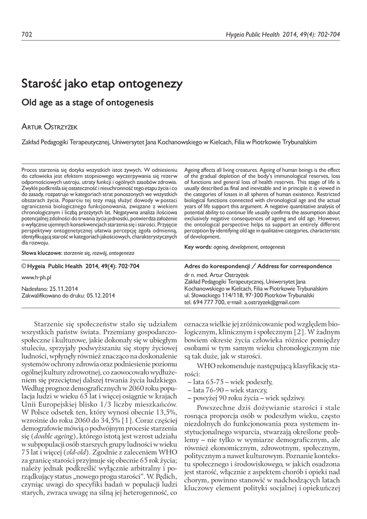702 Hygeia Public Health 2014, 49(4): 702-704 Starość jako etap ontogenezy Old age as a stage of ontogenesis Artur Ostrzyżek Zakład Pedagogiki Terapeutycznej, Uniwersytet Jana Kochanowskiego w Kielcach, Filia w Piotrkowie Trybunalskim Proces starzenia się dotyka wszystkich istot żywych. W odniesieniu do człowieka jest efektem stopniowego wyczerpywania się rezerw odpornościowych ustroju, utraty funkcji i ogólnych zasobów zdrowia. Zwykle podkreśla się ostateczność i nieuchronność tego etapu życia i co do zasady, rozpatruje w kategoriach strat ponoszonych we wszystkich obszarach życia. Poparciu tej tezy mają służyć dowody w postaci ograniczenia biologicznego funkcjonowania, związane z wiekiem chronologicznym i liczbą przeżytych lat. Negatywna analiza ilościowa potencjalnej zdolności do trwania życia jednostki, potwierdza założenie o wyłącznie ujemnych konsekwencjach starzenia się i starości. Przyjęcie perspektywy ontogenetycznej ułatwia percepcję zgoła odmienną, identyfikującą starość w kategoriach jakościowych, charakterystycznych dla rozwoju. Słowa kluczowe: starzenie się, rozwój, ontogeneza Ageing affects all living creatures. Ageing of human beings is the effect of the gradual depletion of the body’s immunological reserves, loss of functions and general loss of health reserves. This stage of life is usually described as final and inevitable and in principle it is viewed in the categories of losses in all spheres of human existence. Restricted biological functions connected with chronological age and the actual years of life support this argument. A negative quantitative analysis of potential ability to continue life usually confirms the assumption about exclusively negative consequences of ageing and old age. However, the ontological perspective helps to support an entirely different perception by identifying old age in qualitative categories, characteristic of development. Key words: ageing, development, ontogenesis © Hygeia Public Health 2014, 49(4): 702-704 Adres do korespondencji / Address for correspondence www.h-ph.pl dr n. med. Artur Ostrzyżek Zakład Pedagogiki Terapeutycznej, Uniwersytet Jana Kochanowskiego w Kielcach, Filia w Piotrkowie Trybunalskim ul. Słowackiego 114/118, 97-300 Piotrków Trybunalski tel. 694 777 700, e-mail: [email protected] Nadesłano: 25.11.2014 Zakwalifikowano do druku: 05.12.2014 Starzenie się społeczeństw stało się udziałem wszystkich państw świata. Przemiany gospodarczospołeczne i kulturowe, jakie dokonały się w ubiegłym stuleciu, sprzyjały podwyższaniu się stopy życiowej ludności, wpłynęły również znacząco na doskonalenie systemów ochrony zdrowia oraz podniesienie poziomu ogólnej kultury zdrowotnej, co zaowocowało wydłużeniem się przeciętnej dalszej trwania życia ludzkiego. Według prognoz demograficznych w 2060 roku populacja ludzi w wieku 65 lat i więcej osiągnie w krajach Unii Europejskiej blisko 1/3 liczby mieszkańców. W Polsce odsetek ten, który wynosi obecnie 13,5%, wzrośnie do roku 2060 do 34,5% [1]. Coraz częściej demografowie mówią o podwójnym procesie starzenia się (double ageing), którego istotą jest wzrost udziału w subpopulacji osób starszych grupy ludności w wieku 75 lat i więcej (old-old). Zgodnie z zaleceniem WHO za granicę starości przyjmuje się obecnie 65 rok życia; należy jednak podkreślić wyłącznie arbitralny i porządkujący status „nowego progu starości”. W. Pędich, czyniąc uwagi do specyfiki badań w populacji ludzi starych, zwraca uwagę na silną jej heterogenność, co oznacza wielkie jej zróżnicowanie pod względem biologicznym, klinicznym i społecznym [2]. W żadnym bowiem okresie życia człowieka różnice pomiędzy osobami w tym samym wieku chronologicznym nie są tak duże, jak w starości. WHO rekomenduje następującą klasyfikację starości: –lata 65-75 – wiek podeszły, –lata 76-90 – wiek starczy, –powyżej 90 roku życia – wiek sędziwy. Powszechne dziś dożywianie starości i stale rosnąca proporcja osób w podeszłym wieku, często niezdolnych do funkcjonowania poza systemem instytucjonalnego wsparcia, stwarzają określone problemy – nie tylko w wymiarze demograficznym, ale również ekonomicznym, zdrowotnym, społecznym, politycznym a nawet kulturowym. Poznanie kontekstu społecznego i środowiskowego, w jakich osadzona jest starość, włącznie z aspektem chorób i opieki nad chorym, powinno stanowić w nadchodzących latach kluczowy element polityki socjalnej i opiekuńczej Ostrzyżek A. Starość jako etap ontogenezy każdego państwa. Z uwagi na ograniczone środki finansowe, działania w tym obszarze powinny być ukierunkowane na wspomaganie jak najdłuższej obecności osób starszych w swoich środowiskach oraz na wzmacnianie funkcji opiekuńczych rodziny. Poza koniecznością bezpośredniego zwrócenia uwagi na problemy starzejącej się generacji i diagnozowania ich sytuacji życiowej, istnieje również potrzeba odpowiednio wczesnego edukowania młodych pokoleń w aspekcie przygotowania i wychowania do starości. Aby sprostać temu zadaniu niezbędne jest zwiększenie rozmiaru podejmowanych badań naukowych z zakresu gerontologii i profilaktyki gerontologicznej. Dyscypliną gerontologiczno-pedagogiczną, która szczególnie w ostatnich latach wyraźnie zmierza w kierunku człowieka starego, jest geragogika, często określana również mianem edukacji gerontologicznej lub też pedagogiki starzenia się i starości. Konsekwencją przyjęcia takiej podstawy teoretycznej, a także punktem wyjścia wszelkich koncepcji praktycznych w gerontologii, powinna być odpowiedź na pytanie o miejsce człowieka starego w społeczeństwie i jego rolę we współtworzeniu teraźniejszości. Jak wynika z przeglądu literatury przedmiotu, odpowiedź taka wymaga szczególnej refleksji nad biegiem życia. Przez setki lat w historii świata miejsce, rola i przydatność osób w podes