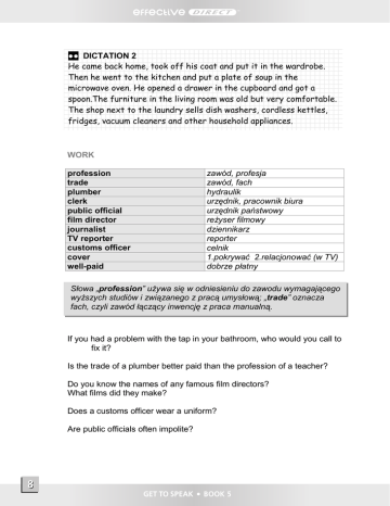 TM DICTATION 2 2 ●● DICTATION WORK profession trade plumber clerk public official film director journalist TV reporter customs officer cover well-paid zawód, profesja zawód, fach hydraulik urzędnik,pracownikbiura urzędnikpaństwowy reŜyserfilmowy dziennikarz reporter celnik 1.pokrywać2.relacjonować(wTV) dobrzepłatny Słowa„profession”uŜywasięwodniesieniudozawoduwymagającego wyŜszychstudiówizwiązanegozpracąumysłową;„trade” oznacza fach,czylizawódłączącyinwencjęzpracamanualną. If you had a problem with the tap in your bathroom, who would you call to fix it? Is the trade of a plumber better paid than the profession of a teacher? Do you know the names of any famous film directors? What films did they make? Does a customs officer wear a uniform? Are public officials often impolite? 8 TM ●Awritesarticlesforthepress. ●Acovers(=reportson)politicalandsportevents. ●Acheckswhatpeoplebringintothecountry. ●Aworksinanoffice. What kind of job does a journalist (/film director /customs officer) do? LESSON 4 employed - unemployed full-time (job) part-time (job) self-employed permanent (job) retired . zatrudniony - bezrobotny napełnyetat napółetatu pracującynawłasnyrachunek stała(praca) emerytowany Do you have to give your employment details when you want to borrow money from a bank? Which of these people have fair chances to borrow money from a bank: people employed full-time, employed part-time, the self-employed, the unemployed or the retired? In which case are the chances are little or none? Do retired people get any money from the government? If you work 4 hours a day, do you have a full-time job? No, if you work only 4 hours a day, it isn’t ... It’s a part-time job. Do you have a permanent job? 9 TM jobless homeless careless - careful useless - useful bezrobotny, bez pracy bezdomny beztroski,niedbałystaranny, ostroŜny bezuŜytecznyprzydatny If you are jobless, does it mean you’re unemployed? Can a homeless man get a legal job? Is a bike without wheels useless? Can an umbrella be useful in a country where there’s seldom any rain, but it’s hot and sunny? Are some people really careless about their little children? In what way? Yes, ... They sometimes leave their little children unattended. Are you careful when you cross a busy road? In what other situations should people be careful? EXTRA VOCABULARY: WORK application - apply to (sb) for (a job) fill in a form interview; to interview sb for a job permission be turned down CV (curriculum vitae) attach podanieskładaćpodanie,ubiegaćsięo (pracę) wypełnićformularz rozmowawstępna,wywiad; przeprowadzićrozmowę,wywiad pozwolenie dostaćodmowę Ŝyciorys załączyć Have you ever been interviewed for a job? What job did you last apply for? Did you get the offer or were you turned down? If you wanted to buy a gun, would you have to apply to the police for permission? When you apply to a university, do you usually have to attach your last school report? Would you be able to write a CV in English (or would you have it translated)? 10 TM ☼ . PASSIVE VOICE (2) - MODALS ZdaniawstroniebiernejzuŜyciemczasownikówmodalnych: can,should,musttłumaczymybezosobowopolskimi: „moŜna”,„naleŜy,powinnosię”,„trzeba”. Przykłady: Hebeseen. Thewholetownbeseenfromthetower. Itbedonequickly. Thecarbecheckedupeveryyear. ●EXERCISE2A Zamieńzdaniazestronyczynnejnabierną. 1. Somebody should clean this room before the boss comes. _______________________________________________________ 2. They have to accept those conditions or they will lose their jobs. _______________________________________________________ 3. Someone may invite us to a party. _______________________________________________________ 4. They shouldn’t overpay him. _______________________________________________________ 5. Nobody can draw a completely straight line without the help of a ruler. _______________________________________________________ 6. We shouldn’t allow children to do as they please. _______________________________________________________ 7. Someone must do something about poor condition of the roads. _______________________________________________________ 11 TM ●EXERCISE2B Przetłumacz: 1.ZeszczytuwzgórzamoŜnazobaczyćcałemiasto. _________________________________________________________ 2. Niepowinnosięzostawiaćdziecibezopieki. _________________________________________________________ 3.Trzebaprzepisaćtenlistna komputerze. _________________________________________________________ 4.HerbatępowinnosiępićzfiliŜanki. _________________________________________________________ 5.NiemoŜnauprawiaćryŜuwtejczęściświata. _________________________________________________________ LESSON 5 . ECONOMICS amount (of money) cash card cash dispenser, ATM cash desk (/*checkout /cash till) by credit card pay (in) cash fair; trade fair; fun fair business card ilość,kwota(pieniędzy) karta bankomatowa bankomat kasa (*w supermarkecie) kartąkredytową płacićgotówką jarmark;targi;wesołemiasteczko wizytówka What do you need to use in order to get money from a cash dispenser? You need to use a cash card ... How much money can you get from an ATM at one time? 12 TM In a supermarket, where do you go to pay? ... to the checkout. Is it reasonable to carry a large amount of money on you? Are you a reasonable man? Have you ever paid by cash (/credit) card or do you always pay cash? Are business cards useful at trade fairs? Yes, business ... What are trade fairs organised for? Trade fairs ... for advertising products and doing business. Are there any trade fairs (/trade shows) held in your town? Did you like going to a fun fair as a child? Do you still go? (home) loan buy on credit salary cost [-cost]; the cost of (living) (good / poor) quality earn (he) can’t afford poŜyczka(mieszkaniowa) kupowaćnakredyt pensja kosztować;kosztyutrzymania (dobrej/kiepskiej)jakości zarabiać niestać(go)na Is it easy to get a home loan 