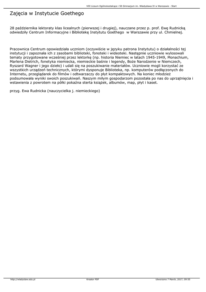 VIII Liceum Ogólnokształcące i 58 Gimnazjum im. Władysława IV w Warszawie - Start Zajęcia w Instytucie Goethego 28 października lektoraty klas licealnych (pierwszej i drugiej), nauczane przez p. prof. Ewę Rudnicką odwiedziły Centrum Informacyjne i Bibliotekę Instytutu Goethego w Warszawie przy ul. Chmielnej. Pracownica Centrum opowiedziała uczniom (oczywiście w języku patrona Instytutu) o działalności tej instytucji i zapoznała ich z zasobami biblioteki, fonoteki i wideoteki. Następnie uczniowie wylosowali tematy przygotowane wcześniej przez lektorkę (np. historia Niemiec w latach 1945-1949, Monachium, Marlena Dietrich, fonetyka niemiecka, niemieckie baśnie i legendy, Boże Narodzenie w Niemczech, Ryszard Wagner i jego dzieło) i udali się na poszukiwanie materiałów. Uczniowie mogli korzystać ze wszystkich urządzeń technicznych, którymi dysponuje Biblioteka, np. komputerów podłączonych do Internetu, przeglądarek do filmów i odtwarzaczy do płyt kompaktowych. Na koniec młodzież podsumowała wyniki swoich poszukiwań. Naszym miłym gospodarzom pozostała po nas do uprzątnięcia i wstawienia z powrotem na półki pokaźna sterta książek, albumów, map, płyt i kaset. przyg. Ewa Rudnicka (nauczycielka j. niemieckiego) http://wladyslaw.edu.pl Kreator PDF Utworzono 7 March, 2017, 09:55