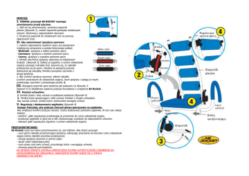 MONTAŻ: I. UWAGA: przyrząd AB ROCKET wymaga zmontowania przed użyciem. 1. Jeśli nie są zamontowane, zamontuj wspornik pleców (Rysunek 1). umieść wsporniki pomiędzy metalowymi ramami. Wyrównaj z odpowiednimi otworami. 2. Przymocuj wspornik do metalowych ram za pomocą załączonych śrub. II. Aby zamontować sprężyny oporowe: 1. wybierz odpowiednie nasilenie oporu (na sprężynach znajdują się oznaczenia w postaci kolorowego paska): - Niebieski- sprężyna o niskim poziomie oporu - Czerwony- sprężyna o średnim poziomie oporu - Czarny- sprężyna o wysokim poziomie oporu 1. Umieść oba końce sprężyny oporowej na metalowych śrubach (Rysunek 2). Dokręć je (zgodnie z ruchem wskazówek zegara) używając nakrętek śrub. Upewnij się, że nakrętki przykręcone są do oporu. Naciśnij na sprężynę podczas dokręcania jej nakrętką. Powtórz powyższe czynności z drugą sprężyną. 2. Aby zmienić sprężyny oporowe, odkręć nakrętki (ruchem przeciwnym do wskazówek zegara). Usuń sprężyny i zastąp je innymi powtarzając czynności z powyższego punktu 2. III. Wyciągnij wspornik spod siedzenia jak pokazano na Rysunku 3. Zapewni Ci to dodatkowe wsparcie podczas korzystania z urządzenia Ab Rocket. IV. Montaż uchwytów: 1. Umieść prawy i lewy uchwyt w podstawie siedzenia (Rysunek 4) 2. Wciśnij bolce sprężynujące i włóż uchwyt. Powtórz z drugim uchwytem. Aby usunąć uchwyt, wciśnij bolce i jednocześni pociągnij uchwyt. V. Regulacja i dostosowanie zagłówka (Rysunek 4) Uwaga: Pamiętaj, aby podczas ćwiczeń głowa spoczywała na zagłówku. Aby zwiększyć komfort podczas ćwiczeń, można dostosować położenie zagłówka. W tym celu należy kolejno: - poluźnić gałki regulacyjne przekręcając je przeciwnie do ruchu wskazówek zegara, - przesunąć zagłówek w górę lub w dół, dostosowując wysokość do odpowiednich otworów. - dokręcić gałki regulacyjne (zgodnie z ruchem wskazówek zegara) PRZECHOWYWYANIE: Ab Rocket może być łatwo przechowywany np. pod łóżkiem. Aby złożyć przyrząd: - usuń górne nakrętki przytrzymujące sprężyny, odkręcając przeciwnie do kierunku ruchu wskazówek zegara (dolne nakrętki pozostaw przykręcone) - odczep sprężyny oporowe w górnej części. - opuść część wspierającą plecy - usuń prawy oraz lewy uchwyt, przyciskając bolce i wyciągając uchwyty. - schowaj wspornik pod siedzenie. NA SPODZIE SPRZĘTU ZOSTAŁA UMIESZCZONA PLOMBA AUTENTYCZNOŚCI NIEZBĘDNA DO UWZGLĘDNIENIA EW. REKLAMACJI. NARUSZENIE PLOMBY WIĄŻE SIĘ Z UTRATĄ GWARANCJI NA SPRZĘT. Wyprodukowano dla: Mirosław Gockowiak Ciele, ul. Przylesie 3 86-005 Białe Błota, Polska www.gockowiak.pl INSTRUKCJA OBSŁUGI