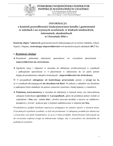 POMORSKI WOJEWÓDZKI INSPEKTOR INSPEKCJI HANDLOWEJ W GDAŃSKU ul. M. Konopnickiej 4, 80-240 Gdańsk tel/fax (58) 341-08-77, (58) 341-53-37 http://www.ihgd.pl , e-mail: [email protected] INFORMACJA z kontroli prawidłowości funkcjonowania handlu i gastronomii w szkołach i na wyższych uczelniach, w klubach studenckich, internatach, akademikach w I kwartale 2016 r. Kontrolą objęto 7 placówek gastronomicznych funkcjonujących na terenie Gdańska, Gdyni, Sopotu i Słupska, stwierdzając nieprawidłowości w 6 skontrolowanych zakładach (85,7 %). 1. Rzetelność obsługi Rzetelność pobierania należności sprawdzono we wszystkich placówkach nieprawidłowości nie stwierdzono. Zgodność masy i objętości w stosunku do deklaracji uwidocznionych w cennikach i jadłospisach sprawdzono w 4 placówkach w odniesieniu do 22 partii potraw będących przedmiotem zakupów kontrolnych - nieprawidłowości nie stwierdzono. W 3 przypadkach odstąpiono od kontrolnego przeważenia potraw z uwagi na to, że w cennikach dla kupujących nie określono ich ilości. W jednym z zakładów nie określono w jadłospisie ilości dodatków do potraw-zestawów (surówka z białej kapusty i z marchwi). Podmianę asortymentową w stosunku do deklaracji w kartach menu, nie udowodnioną zakupem kontrolnym ujawniono w 2 przypadkach, gdzie do produkcji potraw (schab ze szpinakiem i fetą oraz sałatka feta i oliwki) używano produkt o nazwie ser sałatkowokanapkowy „Favita”, podczas gdy w kartach zadeklarowano w składzie ser feta. Przedsiębiorcy podjęli działania naprawcze polegające na zmianie opisów w kartach menu. Z uzyskanych wyjaśnień wynikało, że byli oni przekonani, iż zakupiony produkt jest identyczny z serem feta i nie mieli świadomości, że są to 2 różne produkty. Kontrolowani zobowiązali się do zwracania większej uwagi na dokonywane zakupy, aby w przyszłości nie dochodziło do podobnych uchybień. 1 2. Prawidłowość uwidaczniania cen W 4 placówkach (57,1%) naruszono przepisy dotyczące uwidaczniania cen, w odniesieniu do towarów będących przedmiotem zakupu kontrolnego, polegające na nieuwidocznieniu ilości nominalnych potraw. Przedsiębiorcom postawiono żądania uzupełnienia gramatur potraw. 3. Jakość surowców, półproduktów i potraw a) Badaniom organoleptycznym w zakresie świeżości potraw, surowców i półproduktów poddano 61 partii o wartości 3791,93 zł (w tym: 28 partii surowców o wartości 1323,43,- zł, 13 partii półproduktów o wartości 1075,- zł oraz 20 partii wyrobów gotowych o wartości 1393,50 zł), których nie kwestionowano. b) Sprawdzono jakość w ocenie wizualnej 3 partii tłuszczu smażalniczego - nie kwestionowano. c) Badaniom laboratoryjnym pod względem cech organoleptycznych i fizykochemicznych poddano 3 partie/próbki o wartości 47,20 zł, które spełniały wymagania w zakresie przeprowadzonych badań. Były to: 2 partie wyrobów gotowych (ryby), 1 partia tłuszczu smażalniczego. 4. Identyfikowalność towarów W powyższym zakresie kontrolą objęto 71 rodzajów surowców do produkcji, zarówno w opakowaniach jednostkowych jak i luzem, bez opakowania. 5. Prawidłowość oznakowania towarów a) Sprawdzonych 29 partii towarów handlowych i surowców w opakowaniach o wartości 736,15 zł pod względem oznakowania odpowiadało obowiązującym przepisom. b) W oznakowaniu napojów, surowców i półproduktów w opakowaniach jednostkowych, – 21 partii o wartości 522,40 zł - w wykazie składników podano substancje dodatkowe dozwolone, które były dopuszczone do stosowania. c) W 3 placówkach w kartach menu lub w innej formie bezpośrednio dostępnej dla kupującego (cenniki awizo), nie podano przy 101 rodzajach wyrobów kulinarnych, dodatków do potraw oraz napojów zimnych i gorących, obowiązkowych informacji, i tak: - wykazu składników przy 91 rodzajach oferowanych do sprzedaży potraw i napojów; 2 - składników alergennych wchodzących w skład 73 rodzajów oferowanych potraw i napojów. Ponadto: - nazwy substancji lub produktu powodującego alergię lub reakcję nietolerancji nie podkreślono za pomocą pisma wyraźnie odróżniającego ją od reszty wykazu składników przy 19 rodzajach oferowanych potraw, - przy 12 rodzajach potraw nie podano nazw w sposób określony w art. 17 rozporządzenia 1169/2011. Dodatkowo w 1 zakładzie wykaz składników i alergenów znajdował się w miejscu niedostępnym dla konsumentów. Brak było również informacji gdzie konsument może otrzymać przedmiotowy wykaz (na żądanie kontrolujących przedsiębiorca uwidocznił wykaz w miejscu swobodnie dostępnym dla klientów baru). Wszyscy przedsiębiorcy podjęli działania zmierzające do uzupełnienia brakujących informacji, jednocześnie tłumacząc, że alergeny występujące w potrawach są alergenami powszechnie znanymi np. gluten występujący w mąkach (w pieczywie, pizzach), laktoza w mleku (w kawach, koktajlach, jogurtach). Ponadto uznali, że oferowane przez nich potrawy są proste, a z ich opisu wynika jakie alergeny zawierają np. Dorsz panierowany (mąka, jaja, bułka tarta występujące w panierce). 6. Przestrzeganie warunków magazynowania żywności oraz okresów jej trwałości. a) W zakresie warunków magazynowania nieprawidłowości stwierdzono w 2 placówkach i dotyczyły one: - przechowywania środków spożywczych niezgodnie z warunkami określonymi przez producenta - 1 zakład (szynka gotowana w stanie zamrożonym - producent określił temperaturę przechowywania od +2 do +6º C), - niezachowania warunków sanitarnych przy produkcji i przechowywaniu środków spożywczych (brak segregacji w urządzeniach chłodniczych, brudne lodówki wewnątrz i na zewnątrz, wycieki brudnej wody z resztkami żywności na spodzie i półkach lodówek, wyprodukowane i zamrożone w zakładzie wyroby kulinarne nie posiadały żadnych oznaczeń, regały i podłogi pomieszczeń magazynowych brudne, z resztkami żywności - 1 placó