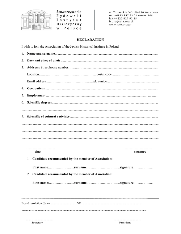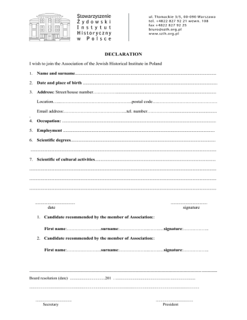 DECLARATION I wish to join the Association of the Jewish Historical Institute in Poland 1. Name and surname............................................................................................................................ 2. Date and place of birth ...................................................................................................................... 3. Address: Street/house number……………........................................................................................ Location…...………………………………………..postal code….………………………………… Email address:…………………………………...tel. number……………......................................... . 4. Occupation: ....................................................................................................................................... 5. Employment ..................................................................................................................................... 6. Scientific degrees............................................................................................................................... ................................................................................................................................................................... 7. Scientific of cultural activities.......................................................................................................... .................................................................................................................................................................... .................................................................................................................................................................... .................................................................................................................................................................... ................................... date ................................ signature 1. Candidate recommended by the member of Association:: First name:…………………..surname:………………..…….…signature:…………….. 2. Candidate recommended by the member of Association:: First name:…………………..surname:………………..…….…signature:…………….. ----------------------------------------------------------------------------------------------------------------------------- ----------Board resolution (date) ..................................201 . ..................................................... ........................ .................................................................................................................................................................... ................................... Secretary .................................... President