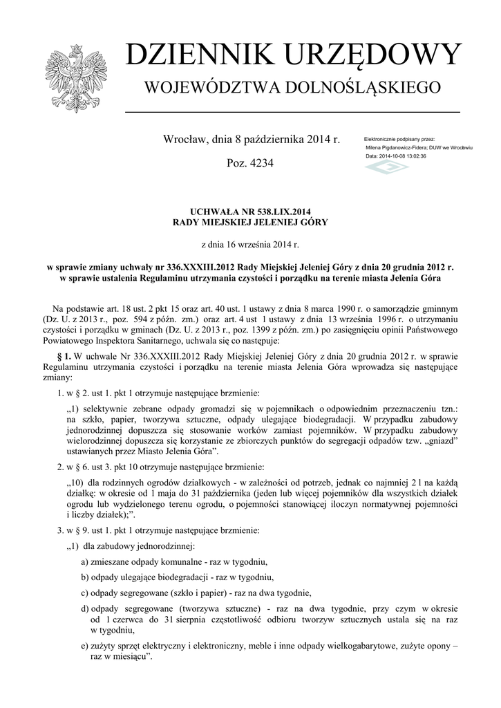 DZIENNIK URZĘDOWY WOJEWÓDZTWA DOLNOŚLĄSKIEGO Wrocław, dnia 8 października 2014 r. Elektronicznie podpisany przez: Milena Pigdanowicz-Fidera; DUW we Wrocławiu Poz. 4234 Data: 2014-10-08 13:02:36 UCHWAŁA NR 538.LIX.2014 RADY MIEJSKIEJ JELENIEJ GÓRY z dnia 16 września 2014 r. w sprawie zmiany uchwały nr 336.XXXIII.2012 Rady Miejskiej Jeleniej Góry z dnia 20 grudnia 2012 r. w sprawie ustalenia Regulaminu utrzymania czystości i porządku na terenie miasta Jelenia Góra Na podstawie art. 18 ust. 2 pkt 15 oraz art. 40 ust. 1 ustawy z dnia 8 marca 1990 r. o samorządzie gminnym (Dz. U. z 2013 r., poz. 594 z późn. zm.) oraz art. 4 ust 1 ustawy z dnia 13 września 1996 r. o utrzymaniu czystości i porządku w gminach (Dz. U. z 2013 r., poz. 1399 z późn. zm.) po zasięgnięciu opinii Państwowego Powiatowego Inspektora Sanitarnego, uchwala się co następuje: § 1. W uchwale Nr 336.XXXIII.2012 Rady Miejskiej Jeleniej Góry z dnia 20 grudnia 2012 r. w sprawie Regulaminu utrzymania czystości i porządku na terenie miasta Jelenia Góra wprowadza się następujące zmiany: 1. w § 2. ust 1. pkt 1 otrzymuje następujące brzmienie: „1) selektywnie zebrane odpady gromadzi się w pojemnikach o odpowiednim przeznaczeniu tzn.: na szkło, papier, tworzywa sztuczne, odpady ulegające biodegradacji. W przypadku zabudowy jednorodzinnej dopuszcza się stosowanie worków zamiast pojemników. W przypadku zabudowy wielorodzinnej dopuszcza się korzystanie ze zbiorczych punktów do segregacji odpadów tzw. „gniazd” ustawianych przez Miasto Jelenia Góra”. 2. w § 6. ust 3. pkt 10 otrzymuje następujące brzmienie: „10) dla rodzinnych ogrodów działkowych - w zależności od potrzeb, jednak co najmniej 2 l na każdą działkę: w okresie od 1 maja do 31 października (jeden lub więcej pojemników dla wszystkich działek ogrodu lub wydzielonego terenu ogrodu, o pojemności stanowiącej iloczyn normatywnej pojemności i liczby działek);”. 3. w § 9. ust 1. pkt 1 otrzymuje następujące brzmienie: „1) dla zabudowy jednorodzinnej: a) zmieszane odpady komunalne - raz w tygodniu, b) odpady ulegające biodegradacji - raz w tygodniu, c) odpady segregowane (szkło i papier) - raz na dwa tygodnie, d) odpady segregowane (tworzywa sztuczne) - raz na dwa tygodnie, przy czym w okresie od 1 czerwca do 31 sierpnia częstotliwość odbioru tworzyw sztucznych ustala się na raz w tygodniu, e) zużyty sprzęt elektryczny i elektroniczny, meble i inne odpady wielkogabarytowe, zużyte opony – raz w miesiącu”. Dziennik Urzędowy Województwa Dolnośląskiego –2– Poz. 4234 4. w § 9. ust 1. pkt 2 otrzymuje następujące brzmienie: „2) dla zabudowy wielorodzinnej: a) zmieszane odpady komunalne - raz w tygodniu, b) odpady ulegające biodegradacji - raz w tygodniu, przy czym w okresie od 1 czerwca do 31 sierpnia częstotliwość odbioru odpadów biodegradowalnych ustala się na dwa razy w tygodniu, c) odpady segregowane (szkło i papier) - raz na dwa tygodnie, d) odpady segregowane (tworzywa sztuczne) - raz na dwa tygodnie, przy czym w okresie od 1 czerwca do 31 sierpnia częstotliwość odbioru tworzyw sztucznych ustala się na raz w tygodniu, e) zużyty sprzęt elektryczny i elektroniczny, meble i inne odpady wielkogabarytowe, zużyte opony – raz w miesiącu”. 5. w § 9. ust 1. pkt 3 otrzymuje następujące brzmienie: „3) dla nieruchomości, na których nie zamieszkują mieszkańcy, a powstają odpady komunalne: a) zmieszane odpady komunalne - raz w tygodniu, b) odpady ulegające biodegradacji - raz w tygodniu, c) odpady segregowane (szkło, papier, tworzywa sztuczne) - raz na dwa tygodnie”. § 2. Wykonanie Uchwały powierza się Prezydentowi Miasta Jelenia Góra. § 3. Uchwała wchodzi w życie po upływie 14 dni od ogłoszenia w Dzienniku Urzędowym Województwa Dolnośląskiego z mocą obowiązującą od 1 marca 2015 r. Przewodniczący Rady Miejskiej: L. Wrotniewski