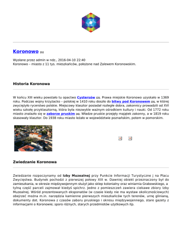 Koronowo [1] Wysłane przez admin w ndz., 2016-04-10 22:40 Koronowo – miasto z 11 tys. mieszkańców, położone nad Zalewem Koronowskim. Historia Koronowa W końcu XIII wieku powstało tu opactwo Cystersów [2]. Prawa miejskie Koronowo uzyskało w 1369 roku. Podczas wojny krzyżacko – polskiej w 1410 roku doszło do bitwy pod Koronowem [3], w której zwyciężyło rycerstwo polskie. Miejscowy klasztor posiadał rozległe dobra, zakonnicy prowadzili od XVI wieku szkołę przyklasztorną, która była niezwykle ważnym ośrodkiem kultury i nauki. Od 1772 roku miasto znalazło się w zaborze pruskim [4]. Władze pruskie przejęły majątek zakonny, a w 1819 roku skasowały klasztor. Do 1938 roku miasto leżało w województwie poznańskim, potem w pomorskim. Zwiedzanie Koronowa Zwiedzanie rozpoczynamy od Izby Muzealnej przy Punkcie Informacji Turystyczne j na Placu Zwycięstwa. Budynek pochodzi z pierwszej połowy XIX w. Dawniej obiekt przeznaczony był do zamieszkania, w okresie międzywojennym służył jako sklep kolonialny oraz winiarnia Grabowskiego, a tylną część parceli zajmował kiedyś spichrz. Jedno z pomieszczeń zawiera ciekawe zbiory Izby Muzealnej. Wśród prezentowanych eksponatów (w czasie kiedy nie ma wystaw okolicznościowych) obejrzeć można m.in. narzędzia kamienne pierwszych mieszkańców tych terenów, urnę glinianą, dokumenty dot. Koronowa z czasów zaboru pruskiego i okresu międzywojennego, stare gazety z informacjami o Koronowie; sporo różnych, starych przedmiotów użytkowych itp. Kolejnym punktem zwiedzania jest koronowski Rynek, stanowiący centralną część miasta. Cechuje się zabudową szachownicową, charakterystyczną dla lokacji na prawie magdeburskim. Kształt rynku stanowi prostokąt 90 na 70 m, z którego narożników odchodzą prostopadle po dwie ulice. Większość budynków pochodzi z XIX w. chociaż część z nich pobudowana została na fundamentach znacznie starszych – jeszcze gotyckich jak np. koronowski ratusz [5]. Powstał w pierwszej połowie XIX w. W roku 1913 był przebudowany i rozbudowany. Nowa architektura zawiera późnoklasycystyczny portal i neogotycki szczyt z zegarem i herbem miasta. Z Rynku kierujemy się na wschód wchodząc w ul. Garncarską. Po minięciu ratusza skręcamy w prawo w ul. Farną i d ochodzimy do kościoła św. Andrzeja [6]. Pierwotnie był tu kościół drewniany, zbudowany na przełomie lat 1382-1396. W obecnej postaci powstał w 1599r. za sprawą starań opata Wawrzyńca Żalińskiego. Zachowuje tradycje gotyckie połączone z późnobarokowym i rokokowym wystrojem wnętrza. Wędrujemy dalej ul. Farną i tuż za kościołem przechodzimy na drugą stronę ulicy aby za moment skręcić w prawo w ul. Szkolną, którą docieramy do skrzyżowania z ul. Sienkiewicza. Tutaj możemy obejrzeć budynek dawnej synagogi [7]. Synagoga powstała w 1856r. W 1938 r. wykupiona od gminy żydowskiej w Bydgoszczy została siedzibą Towarzystwa Gimnastycznego „Sokół”. W czasie wojny przejęta przez Niemców służyła jako magazyn. Po wojnie przekształcona w kino „Brda”. Aktualnie użytkowana jest przez reaktywowane Towarzystwo Gimnastyczne „Sokół”. Ulicą Sienkiewicza kierujemy się na południe skręcając następnie w prawo w ul. Wodną. Idąc prosto przechodzimy przez skwer króla Kazimierza Wielkiego obok pomnika poświęconego mieszkańcom Koronowa, którzy nie wrócili do swojego miasteczka z II wojny światowej. Dalej w lewo ul. Bydgoską dochodzimy do pomnika upamiętniającego zwycięską bitwę z Krzyżakami pod Koronowem. Z tego miejsca -10 października 1410r. wojska polskie wyruszyły w pogoń za wojskami krzyżackimi. Walka została stoczona pod Wilczem. Po długim i wyczerpującym boju zwycięstwo nad wrogiem odniosły wojska króla Jagiełły [8]. Szalę zwycięstwa przeważyło zdobycie przez Jana Naszana, herbu Topór, chorągwi krzyżackiej. Bitwa ta zasłynęła w literaturze za sprawą Długosza [9], który w swoich kronikach pisał: „Mało w naszym wieku pamiętają tak sławnych bitew pomiędzy chrześcijanami a barbarzyńcami; rzadkie bywają przykłady takiego męstwa, takiej wytrwałości i wzajemnego ubiegania się o zwycięstwo. A lubo wygrana pod Koronowem była rzeczywiście mniejsza niż pod Grunwaldem, wszelako ze względu na niebezpieczeństwo, wytrwałość i zapał walczących, można ją wyżej kłaść nad grunwaldzką”. Stąd już blisko do najcenniejszego zabytku Koronowa, jakim jest kościół poklasztorny cysterski. Cystersi przybyli do Koronowa w 1288r. z pobliskiego Byszewa. Już w roku następnym rozpoczęli budowę kościoła. Za twórcę projektu uważa się mnicha Theodricusa. Powstające zabudowania były murowane z cegły w stylu gotyckim. Jest to trójnawowa bazylika z transeptem i dwoma rzędami kaplic. Zespół klasztorny [10] przez około sto lat po rozpoczęciu budowy bardzo dobrze się rozwijał. Wskutek zatargu konwentu z okolicznym rycerstwem klasztor został spalony. Na przełomie XVII/XVIII w. opat Ignacy Bernard Gniński doprowadził do przebudowy wnętrza kościoła ze stylu gotyckiego na barokowy. W tym czasie również wyposażono kościół w nowe - barokowe, bardzo cenne elementy wystroju. W 1819r. za sprawą władz pruskich nastąpiła kasacja zakonu. Zabudowania klasztorne zostały przekształcone w więzienie. Kościół początkowo używany był jako symultaniczny, później stał się wyłącznie katolickim. Wnętrze kościoła zawiera wiele szczególnych dzieł: ołtarz główny z obrazami Bartłomieja Strobla z 1647, piękne stalle, dziesięć obrazów przedstawiających zdarzenia z życia klasztoru, chór muzyczny rokokowy, ambonę z XVII w. oraz wiele innych elementów, których urok możemy dostrzec zwiedzając kościół. Dodatkowo ciekawość wzbudza szereg tajemnic otaczających klasztor, nierozwikłanych do dzisiejszego dnia jak np. obraz przedstawiający króla Jana III Sobieskiego [11] witanego przed klasztorem p