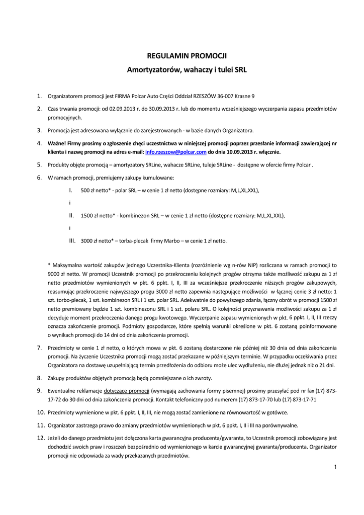 REGULAMIN PROMOCJI Amortyzatorów, wahaczy i tulei SRL 1. Organizatorem promocji jest FIRMA Polcar Auto Części Oddział RZESZÓW 36‐007 Krasne 9 2. Czas trwania promocji: od 02.09.2013 r. do 30.09.2013 r. lub do momentu wcześniejszego wyczerpania zapasu przedmiotów promocyjnych. 3. Promocja jest adresowana wyłącznie do zarejestrowanych ‐ w bazie danych Organizatora. 4. Ważne! Firmy prosimy o zgłoszenie chęci uczestnictwa w niniejszej promocji poprzez przesłanie informacji zawierającej nr klienta i nazwę promocji na adres e‐mail: [email protected] do dnia 10.09.2013 r. włącznie. 5. Produkty objęte promocją – amortyzatory SRLine, wahacze SRLine, tuleje SRLine ‐ dostępne w ofercie firmy Polcar . 6. W ramach promocji, premiujemy zakupy kumulowane: I. 500 zł netto* ‐ polar SRL – w cenie 1 zł netto (dostępne rozmiary: M,L,XL,XXL), i II. 1500 zł netto* ‐ kombinezon SRL – w cenie 1 zł netto (dostępne rozmiary: M,L,XL,XXL), i III. 3000 zł netto* – torba‐plecak firmy Marbo – w cenie 1 zł netto. * Maksymalna wartość zakupów jednego Uczestnika‐Klienta (rozróżnienie wg n‐rów NIP) rozliczana w ramach promocji to 9000 zł netto. W promocji Uczestnik promocji po przekroczeniu kolejnych progów otrzyma także możliwość zakupu za 1 zł netto przedmiotów wymienionych w pkt. 6 ppkt. I, II, III za wcześniejsze przekroczenie niższych progów zakupowych, reasumując przekroczenie najwyższego progu 3000 zł netto zapewnia następujące możliwości w łącznej cenie 3 zł netto: 1 szt. torbo‐plecak, 1 szt. kombinezon SRL i 1 szt. polar SRL. Adekwatnie do powyższego zdania, łączny obrót w promocji 1500 zł netto premiowany będzie 1 szt. kombinezonu SRL i 1 szt. polaru SRL. O kolejności przyznawania możliwości zakupu za 1 zł decyduje moment przekroczenia danego progu kwotowego. Wyczerpanie zapasu wymienionych w pkt. 6 ppkt. I, II, III rzeczy oznacza zakończenie promocji. Podmioty gospodarcze, które spełnią warunki określone w pkt. 6 zostaną poinformowane o wynikach promocji do 14 dni od dnia zakończenia promocji. 7. Przedmioty w cenie 1 zł netto, o których mowa w pkt. 6 zostaną dostarczone nie później niż 30 dnia od dnia zakończenia promocji. Na życzenie Uczestnika promocji mogą zostać przekazane w późniejszym terminie. W przypadku oczekiwania przez Organizatora na dostawę uzupełniającą termin przedłożenia do odbioru może ulec wydłużeniu, nie dłużej jednak niż o 21 dni. 8. Zakupy produktów objętych promocją będą pomniejszane o ich zwroty. 9. Ewentualne reklamacje dotyczące promocji (wymagają zachowania formy pisemnej) prosimy przesyłać pod nr fax (17) 873‐ 17‐72 do 30 dni od dnia zakończenia promocji. Kontakt telefoniczny pod numerem (17) 873‐17‐70 lub (17) 873‐17‐71 10. Przedmioty wymienione w pkt. 6 ppkt. I, II, III, nie mogą zostać zamienione na równowartość w gotówce. 11. Organizator zastrzega prawo do zmiany przedmiotów wymienionych w pkt. 6 ppkt. I, II i III na porównywalne. 12. Jeżeli do danego przedmiotu jest dołączona karta gwarancyjna producenta/gwaranta, to Uczestnik promocji zobowiązany jest dochodzić swoich praw i roszczeń bezpośrednio od wymienionego w karcie gwarancyjnej gwaranta/producenta. Organizator promocji nie odpowiada za wady przekazanych przedmiotów. 1 13. Uczestnikami promocji nie mogą być osoby fizyczne nie prowadzące działalności gospodarczej. 14. Wymienione w pkt. 6 przedmioty nie mogą być zamieniona przez Uczestników promocji na inne niż te, które są wymienione w punkcie 6 i prezentowana na zdjęciach w ulotce towarzyszącej promocji. Polcar Auto Części 2