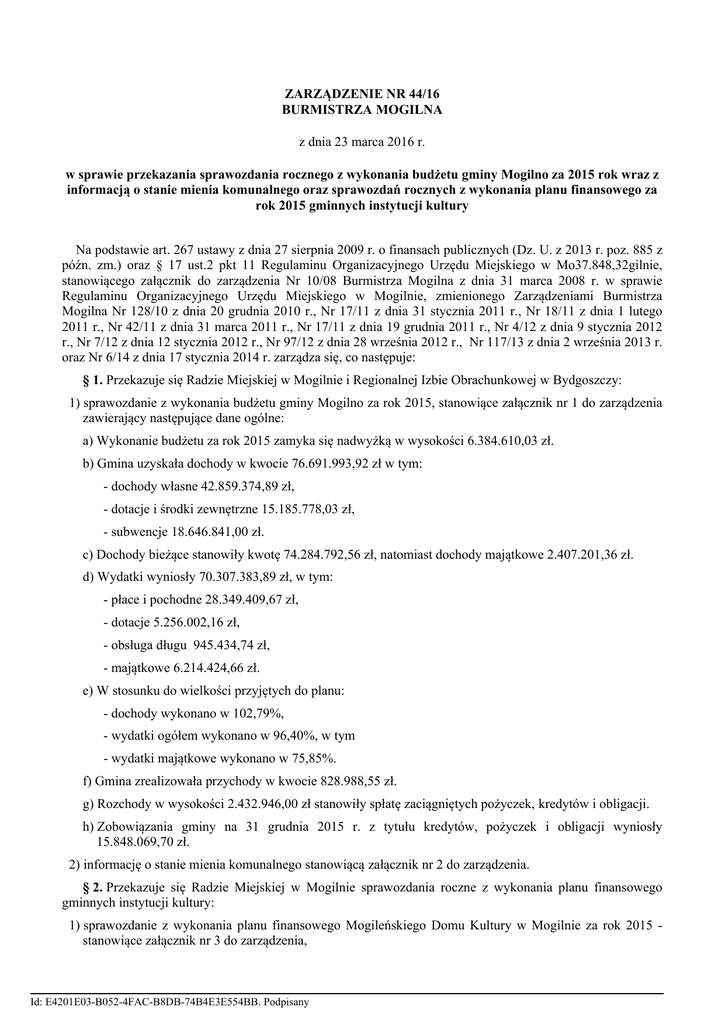 ZARZĄDZENIE NR 44/16 BURMISTRZA MOGILNA z dnia 23 marca 2016 r. w sprawie przekazania sprawozdania rocznego z wykonania budżetu gminy Mogilno za 2015 rok wraz z informacją o stanie mienia komunalnego oraz sprawozdań rocznych z wykonania planu finansowego za rok 2015 gminnych instytucji kultury Na podstawie art. 267 ustawy z dnia 27 sierpnia 2009 r. o finansach publicznych (Dz. U. z 2013 r. poz. 885 z późn. zm.) oraz § 17 ust.2 pkt 11 Regulaminu Organizacyjnego Urzędu Miejskiego w Mo37.848,32gilnie, stanowiącego załącznik do zarządzenia Nr 10/08 Burmistrza Mogilna z dnia 31 marca 2008 r. w sprawie Regulaminu Organizacyjnego Urzędu Miejskiego w Mogilnie, zmienionego Zarządzeniami Burmistrza Mogilna Nr 128/10 z dnia 20 grudnia 2010 r., Nr 17/11 z dnia 31 stycznia 2011 r., Nr 18/11 z dnia 1 lutego 2011 r., Nr 42/11 z dnia 31 marca 2011 r., Nr 17/11 z dnia 19 grudnia 2011 r., Nr 4/12 z dnia 9 stycznia 2012 r., Nr 7/12 z dnia 12 stycznia 2012 r., Nr 97/12 z dnia 28 września 2012 r., Nr 117/13 z dnia 2 września 2013 r. oraz Nr 6/14 z dnia 17 stycznia 2014 r. zarządza się, co następuje: § 1. Przekazuje się Radzie Miejskiej w Mogilnie i Regionalnej Izbie Obrachunkowej w Bydgoszczy: 1) sprawozdanie z wykonania budżetu gminy Mogilno za rok 2015, stanowiące załącznik nr 1 do zarządzenia zawierający następujące dane ogólne: a) Wykonanie budżetu za rok 2015 zamyka się nadwyżką w wysokości 6.384.610,03 zł. b) Gmina uzyskała dochody w kwocie 76.691.993,92 zł w tym: - dochody własne 42.859.374,89 zł, - dotacje i środki zewnętrzne 15.185.778,03 zł, - subwencje 18.646.841,00 zł. c) Dochody bieżące stanowiły kwotę 74.284.792,56 zł, natomiast dochody majątkowe 2.407.201,36 zł. d) Wydatki wyniosły 70.307.383,89 zł, w tym: - płace i pochodne 28.349.409,67 zł, - dotacje 5.256.002,16 zł, - obsługa długu 945.434,74 zł, - majątkowe 6.214.424,66 zł. e) W stosunku do wielkości przyjętych do planu: - dochody wykonano w 102,79%, - wydatki ogółem wykonano w 96,40%, w tym - wydatki majątkowe wykonano w 75,85%. f) Gmina zrealizowała przychody w kwocie 828.988,55 zł. g) Rozchody w wysokości 2.432.946,00 zł stanowiły spłatę zaciągniętych pożyczek, kredytów i obligacji. h) Zobowiązania gminy na 31 grudnia 2015 r. z tytułu kredytów, pożyczek i obligacji wyniosły 15.848.069,70 zł. 2) informację o stanie mienia komunalnego stanowiącą załącznik nr 2 do zarządzenia. § 2. Przekazuje się Radzie Miejskiej w Mogilnie sprawozdania roczne z wykonania planu finansowego gminnych instytucji kultury: 1) sprawozdanie z wykonania planu finansowego Mogileńskiego Domu Kultury w Mogilnie za rok 2015 stanowiące załącznik nr 3 do zarządzenia, Id: E4201E03-B052-4FAC-B8DB-74B4E3E554BB. Podpisany 2) sprawozdanie z wykonania planu finansowego Miejskiej Biblioteki Publicznej w Mogilnie za rok 2015 stanowiące załącznik nr 4 do zarządzenia, 3) sprawozdanie z wykonania planu finansowego Muzeum Ziemi Mogileńskiej w Mogilnie z siedzibą w Chabsku za rok 2015 - stanowiące załącznik nr 5 do zarządzenia, § 3. Zarządzenie wchodzi w życie z dniem podpisania i podlega ogłoszeniu w Dzienniku Urzędowym Województwa Kujawsko-Pomorskiego. Burmistrz Mogilna Leszek Duszyński Id: E4201E03-B052-4FAC-B8DB-74B4E3E554BB. Podpisany Załącznik Nr 1 do Zarządzenia Nr 44/16 Burmistrza Mogilna z dnia 23 marca 2016 r. Dane ogólne Sprawozdanie Burmistrza Mogilna z wykonania budżetu Gminy Mogilno za rok 2015 zostało sporządzone na podstawie art. 267 ust. 1 pkt 1 ustawy o finansach publicznych. Przy wykonaniu budżetu Burmistrz Mogilna kierował się zasadą równowagi budżetowej, dyscypliną wydatków, w tym pełnego wykorzystania dotacji celowych, dbałości o zapewnienie ciągłości realizacji zadań, a także czynił starania o pozyskanie dodatkowych środków do budżetu. Budżet Gminy Mogilno na rok 2015 został uchwalony przez Radę Miejską w Mogilnie 19 grudnia 2014 r. Uchwałą Nr III/20/14. Został przyjęty budżet nadwyżkowy. Dochody zostały zaplanowane w wysokości 67.916.906,65 zł. Wydatki budżetowe zostały zaplanowane w wysokości 65.683.200,65 zł. Nadwyżkę budżetową roku 2015 w kwocie 2.233.706,00 zł przeznaczono na rozchody tj. na spłatę rat kredytów, pożyczek i obligacji. Uchwałą nr V/39/15 z 13.02.2015 r. nadwyżka budżetowa roku 2015 została zmieniona do kwoty 2.110.134,00 zł, natomiast Uchwałą Nr XII/95/15 z 09.09.2015 r. nadwyżka została zmieniona do kwoty 1.671.976.00 zł i przeznaczona na spłatę rat kredytów, pożyczek i obligacji. W trakcie roku 2015 budżet był zmieniany uchwałami Rady Miejskiej w Mogilnie i zarządzeniami Burmistrza Mogilna. Na dzień 31.12.2015 r. planowane dochody uległy zwiększeniu do wysokości 74.607.342,36 zł tj. o 6.690.435,71 zł. Zmiana wynika z następujących źródeł: Wyszczególnienie 1 dochody własne dotacje celowe z budżetu państwa (§ 201-204) subwencje środki z budżetu UE na zadania bieżące środki z budżetu UE na zadania inwestycyjne dotacje krajowe na inwestycje pozostałe dotacje Podsumowanie: Plan według uchwały budżetowej 2 Plan po zmianach Różnica 3 38.996.110,72 9.804.484,00 40.686.243,58 14.014.167,86 4 (3-2) 1.690.132,86 4.209.683,86 18.381.323,00 225.912,94 18.646.841,00 220.107,22 265.518,00 -5.805,72 368.209,00 485.297,00 117.088,00 80.000,00 60.866,99 67.916.906,65 433.520,66 121.165,04 74.607.342,36 353.520,66 60.298,05 6.690.435,71 Upoważnienia dla Burmistrza zawarte w uchwale budżetowej. - w trakcie roku 2015 Burmistrz Mogilna nie skorzystał z upoważnienia Rady Miejskiej do zaciągnięcia krótkoterminowego kredytu w rachunku bankowym (w § 15 pkt 1 uchwały budżetowej zostało zawarte upoważnienie do zaciągnięcia kredytów i pożyczek do kwoty 1.500.000,00 zł), gdyż nie było takiej potrzeby, - w 2015 r. Burmistrz Mogilna dokonał przeniesienia planu wydatków z rezerwy budżetowej ogólnej w kwocie 248.913,00 zł tj. 100% zaplanow