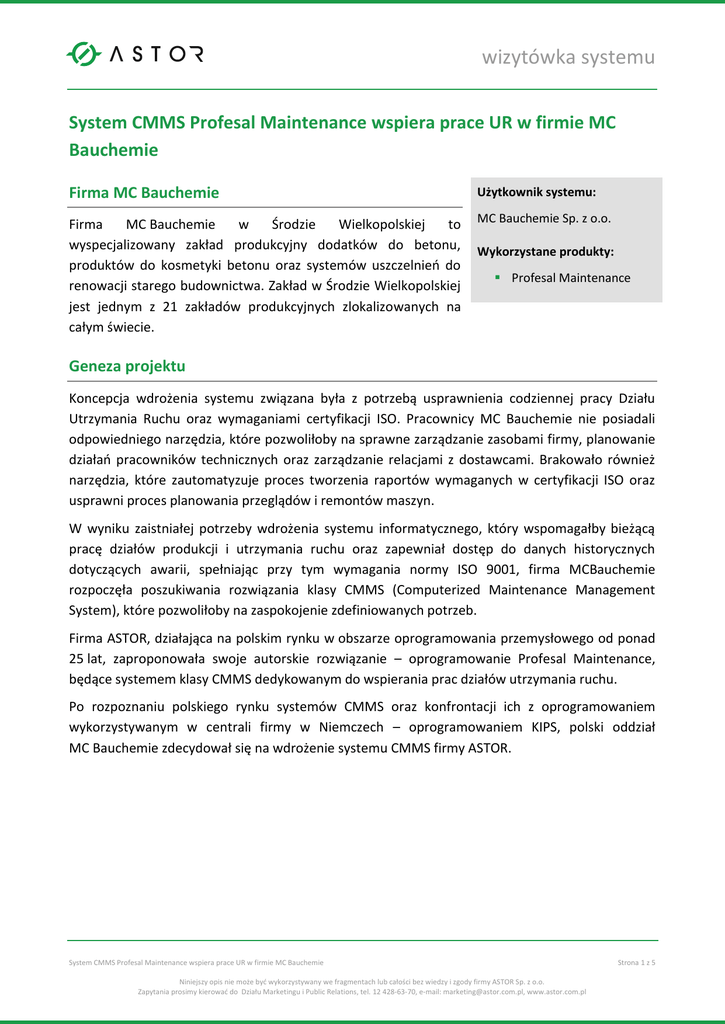 wizytówka systemu System CMMS Profesal Maintenance wspiera prace UR w firmie MC Bauchemie Firma MC Bauchemie Użytkownik systemu: Firma MC Bauchemie w Środzie Wielkopolskiej to wyspecjalizowany zakład produkcyjny dodatków do betonu, produktów do kosmetyki betonu oraz systemów uszczelnień do renowacji starego budownictwa. Zakład w Środzie Wielkopolskiej jest jednym z 21 zakładów produkcyjnych zlokalizowanych na całym świecie. MC Bauchemie Sp. z o.o. Wykorzystane produkty: Profesal Maintenance Geneza projektu Koncepcja wdrożenia systemu związana była z potrzebą usprawnienia codziennej pracy Działu Utrzymania Ruchu oraz wymaganiami certyfikacji ISO. Pracownicy MC Bauchemie nie posiadali odpowiedniego narzędzia, które pozwoliłoby na sprawne zarządzanie zasobami firmy, planowanie działań pracowników technicznych oraz zarządzanie relacjami z dostawcami. Brakowało również narzędzia, które zautomatyzuje proces tworzenia raportów wymaganych w certyfikacji ISO oraz usprawni proces planowania przeglądów i remontów maszyn. W wyniku zaistniałej potrzeby wdrożenia systemu informatycznego, który wspomagałby bieżącą pracę działów produkcji i utrzymania ruchu oraz zapewniał dostęp do danych historycznych dotyczących awarii, spełniając przy tym wymagania normy ISO 9001, firma MCBauchemie rozpoczęła poszukiwania rozwiązania klasy CMMS (Computerized Maintenance Management System), które pozwoliłoby na zaspokojenie zdefiniowanych potrzeb. Firma ASTOR, działająca na polskim rynku w obszarze oprogramowania przemysłowego od ponad 25 lat, zaproponowała swoje autorskie rozwiązanie – oprogramowanie Profesal Maintenance, będące systemem klasy CMMS dedykowanym do wspierania prac działów utrzymania ruchu. Po rozpoznaniu polskiego rynku systemów CMMS oraz konfrontacji ich z oprogramowaniem wykorzystywanym w centrali firmy w Niemczech – oprogramowaniem KIPS, polski oddział MC Bauchemie zdecydował się na wdrożenie systemu CMMS firmy ASTOR. System CMMS Profesal Maintenance wspiera prace UR w firmie MC Bauchemie Niniejszy opis nie może być wykorzystywany we fragmentach lub całości bez wiedzy i zgody firmy ASTOR Sp. z o.o. Zapytania prosimy kierować do Działu Marketingu i Public Relations, tel. 12 428-63-70, e-mail: [email protected], www.astor.com.pl Strona 1 z 5 wizytówka systemu Rysunek 1. Struktura instalacji w systemie Profesal Maintenance O wyborze rozwiązania Profesal Maintenance zdecydowały jego funkcjonalności, które można było dokładnie dopasować do wymagań firmy, elastyczna architektura systemu oraz lokalne wsparcie wdrożeniowe oraz pomoc techniczna. Przebieg wdrożenia Nadzoru nad realizacją projektu podjął się dział Koordynacji Inwestycji firmy ASTOR. System został wdrożony wspólnymi silami firmy ASTOR oraz MC Bauchemie. Już na wstępnym etapie projektu realizacyjnego przygotowana została specyfikacja funkcjonalna systemu. Podczas trwania projektu wdrożeniowego administratorzy systemu Profesal Maintenance z firmy MC Bauchemie zostali przeszkoleni przez specjalistów ASTOR. Wdrożony został system Profesal Maintenance Standard, który oprócz standardowych funkcjonalności systemu CMMS, zawiera moduł Development, umożliwiający dalszy samodzielny rozwój systemu przez administratorów z firmy MC Bauchemie. Ponadto stworzony został dedykowany moduł zarządzania częściami zamiennymi. System CMMS Profesal Maintenance wspiera prace UR w firmie MC Bauchemie Niniejszy opis nie może być wykorzystywany we fragmentach lub całości bez wiedzy i zgody firmy ASTOR Sp. z o.o. Zapytania prosimy kierować do Działu Marketingu i Public Relations, tel. 12 428-63-70, e-mail: [email protected], www.astor.com.pl Strona 2 z 5 wizytówka systemu Rysunek 2. Zarządzanie magazynem części zamiennych w systemie Profesal Maintenance Aplikacja serwerowa systemu Profesal Maintenance została uruchomiona na środowisku wirtualnym, natomiast aplikacje klienckie zostały zainstalowane na komputerach wszystkich użytkowników korzystających z systemu w ramach sieci biurowej. Dostęp do raportów czerpiących dane z bazy danych systemu jest możliwy zarówno z poziomu aplikacji klienckiej systemu Profesal Maintenance, jak również przy użyciu przeglądarki internetowej. Opcja ta pozwala na dostęp do kluczowych raportów dla osób, które nie wprowadzają danych do systemu, ale chcą mieć m.in. możliwość podglądu raportów. System CMMS Profesal Maintenance wspiera prace UR w firmie MC Bauchemie Niniejszy opis nie może być wykorzystywany we fragmentach lub całości bez wiedzy i zgody firmy ASTOR Sp. z o.o. Zapytania prosimy kierować do Działu Marketingu i Public Relations, tel. 12 428-63-70, e-mail: [email protected], www.astor.com.pl Strona 3 z 5 wizytówka systemu Rysunek 3. Architektura systemu Profesal Maintenance w firmie MC Bauchemie Podczas realizacji wdrożenia, do systemu Profesal Maintenance zaimportowane zostały dane dotyczące struktury parku maszynowego przedsiębiorstwa, informacje o kontrahentach i dostawcach, a także dane personalne pracowników i zewnętrznych współpracowników oraz klientów firmy. Wszystkie dane zostały zaimportowane przy użyciu gotowych konektorów dostarczanych wraz z oprogramowaniem Profesal Maintenance z wykorzystywanego w firmie MC Bauchemie systemu ERP Oxion. Dane dotyczące wykorzystywanych maszyn i urządzeń pozwoliły na zamodelowanie struktur instalacji wiernie odwzorowujących rzeczywisty park maszynowy. Użytkownicy systemu, przeglądając zasoby systemu mają dostęp do rzeczywistych zdjęć obiektów, dla których tworzą i rozwiązują zarejestrowane zgłoszenia serwisowe oraz planują zadania przeglądów i remontów maszyn. Wdrożenie systemu klasy CMMS zapoczątkowało również proces przejścia z dokumentacji drukowanej na dokumentację elektroniczną. Docelowo wszelkiego typu dokumentacja związana z każdym zasobem ma być dostępna z poziomu systemu Profes