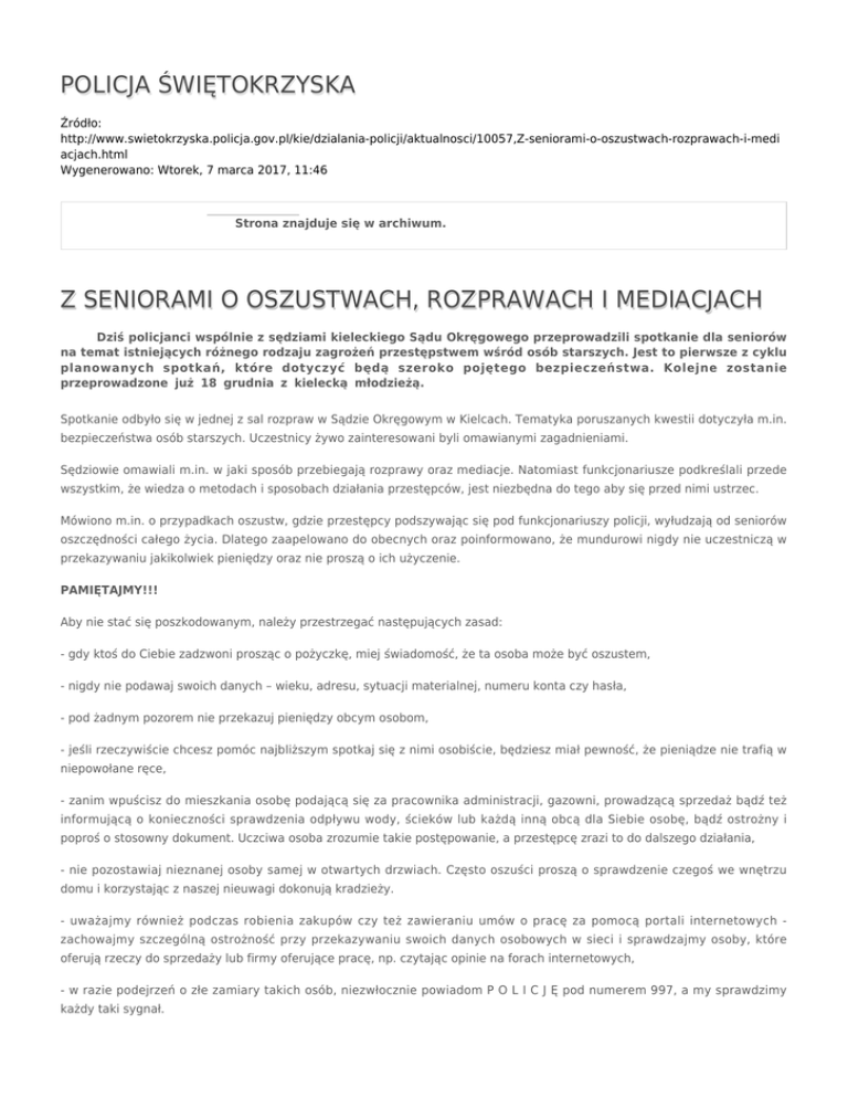 POLICJA ŚWIĘTOKRZYSKA Źródło: http://www.swietokrzyska.policja.gov.pl/kie/dzialania-policji/aktualnosci/10057,Z-seniorami-o-oszustwach-rozprawach-i-medi acjach.html Wygenerowano: Wtorek, 7 marca 2017, 11:46 Strona znajduje się w archiwum. Z SENIORAMI O OSZUSTWACH, ROZPRAWACH I MEDIACJACH Dziś policjanci wspólnie z sędziami kieleckiego Sądu Okręgowego przeprowadzili spotkanie dla seniorów na temat istniejących różnego rodzaju zagrożeń przestępstwem wśród osób starszych. Jest to pierwsze z cyklu planowanych spotkań, które dotyczyć będą szeroko pojętego bezpieczeństwa. Kolejne zostanie przeprowadzone już 18 grudnia z kielecką młodzieżą. Spotkanie odbyło się w jednej z sal rozpraw w Sądzie Okręgowym w Kielcach. Tematyka poruszanych kwestii dotyczyła m.in. bezpieczeństwa osób starszych. Uczestnicy żywo zainteresowani byli omawianymi zagadnieniami. Sędziowie omawiali m.in. w jaki sposób przebiegają rozprawy oraz mediacje. Natomiast funkcjonariusze podkreślali przede wszystkim, że wiedza o metodach i sposobach działania przestępców, jest niezbędna do tego aby się przed nimi ustrzec. Mówiono m.in. o przypadkach oszustw, gdzie przestępcy podszywając się pod funkcjonariuszy policji, wyłudzają od seniorów oszczędności całego życia. Dlatego zaapelowano do obecnych oraz poinformowano, że mundurowi nigdy nie uczestniczą w przekazywaniu jakikolwiek pieniędzy oraz nie proszą o ich użyczenie. PAMIĘTAJMY!!! Aby nie stać się poszkodowanym, należy przestrzegać następujących zasad: - gdy ktoś do Ciebie zadzwoni prosząc o pożyczkę, miej świadomość, że ta osoba może być oszustem, - nigdy nie podawaj swoich danych – wieku, adresu, sytuacji materialnej, numeru konta czy hasła, - pod żadnym pozorem nie przekazuj pieniędzy obcym osobom, - jeśli rzeczywiście chcesz pomóc najbliższym spotkaj się z nimi osobiście, będziesz miał pewność, że pieniądze nie trafią w niepowołane ręce, - zanim wpuścisz do mieszkania osobę podającą się za pracownika administracji, gazowni, prowadzącą sprzedaż bądź też informującą o konieczności sprawdzenia odpływu wody, ścieków lub każdą inną obcą dla Siebie osobę, bądź ostrożny i poproś o stosowny dokument. Uczciwa osoba zrozumie takie postępowanie, a przestępcę zrazi to do dalszego działania, - nie pozostawiaj nieznanej osoby samej w otwartych drzwiach. Często oszuści proszą o sprawdzenie czegoś we wnętrzu domu i korzystając z naszej nieuwagi dokonują kradzieży. - uważajmy również podczas robienia zakupów czy też zawieraniu umów o pracę za pomocą portali internetowych zachowajmy szczególną ostrożność przy przekazywaniu swoich danych osobowych w sieci i sprawdzajmy osoby, które oferują rzeczy do sprzedaży lub firmy oferujące pracę, np. czytając opinie na forach internetowych, - w razie podejrzeń o złe zamiary takich osób, niezwłocznie powiadom P O L I C J Ę pod numerem 997, a my sprawdzimy każdy taki sygnał. Pamiętaj, że mogą to być potencjalni Z Ł O D Z I E J E lub oszuści Opr. MT Źródło: KWP w Kielcach Ocena: 0/5 (0) Tweetnij