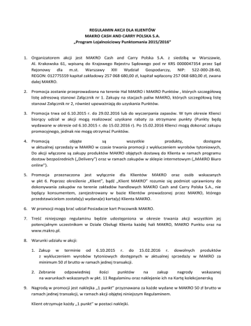 REGULAMIN AKCJI DLA KLIENTÓW MAKRO CASH AND CARRY POLSKA S.A. „Program Lojalnościowy Punktomania 2015/2016” 1. Organizatorem akcji jest MAKRO Cash and Carry Polska S.A. z siedzibą w Warszawie, Al. Krakowska 61, wpisaną do Krajowego Rejestru Sądowego pod nr KRS 0000047354 przez Sąd Rejonowy dla m.st. Warszawy XIII Wydział Gospodarczy, NIP: 522-000-28-60, REGON: 012775559 kapitał zakładowy 257 068 680,00 zł, kapitał wpłacony 257 068 680,00 zł, zwana dalej MAKRO. 2. Promocja zostanie przeprowadzona na terenie Hal MAKRO i MAKRO Punktów , których szczegółową listę adresową stanowi Załącznik nr 1. Zakupy na stacjach paliw MAKRO, których szczegółową listę stanowi Załącznik nr 2, również upoważniają do uzyskania Punktów. 3. Promocja trwa od 6.10.2015 r. do 29.02.2016 lub do wyczerpania zapasów. W tym okresie Klienci biorący udział w akcji mogą realizować uzyskane rabaty za otrzymane punkty (Punkty będą wydawane w okresie od 6.10.2015 r. do 15.02.2016 r). Po 15.02.2016 Klienci mogą dokonać zakupu promocyjnego, jednak nie mogą otrzymać Punktów. 4. Promocją objęte są wszystkie produkty, dostępne w aktualnej sprzedaży w MAKRO w czasie trwania promocji z wykluczeniem wyrobów tytoniowych, Do akcji włączone są zakupy produktów MAKRO objętych dostawą do Klienta w ramach programu dostaw bezpośrednich („Delivery”) oraz w ramach zakupów w sklepie internetowym („MAKRO Biuro online”). 5. Promocja przeznaczona jest wyłącznie dla Klientów MAKRO oraz osób wskazanych w pkt 6. Poprzez określenie „Klient”, bądź „Klient MAKRO” rozumie się podmiot uprawniony do dokonywania zakupów na terenie zakładów handlowych MAKRO Cash and Carry Polska S.A., nie będący konsumentem, zarejestrowany w bazie Klientów prowadzonej przez MAKRO, którego przedstawicielom została(y) wydana(e) karta(y) Klienta MAKRO. 6. W promocji mogą brać udział Posiadacze kart Pracownik MAKRO. 7. Treść niniejszego regulaminu będzie udostępniona w okresie trwania akcji wszystkim jej potencjalnym uczestnikom w Dziale Obsługi Klienta każdej hali MAKRO, MAKRO Punktu oraz na www.makro.pl. 8. Warunki udziału w akcji: 1. Zakup w terminie od 6.10.2015 r. do 15.02.2016 r. dowolnych produktów z wykluczeniem wyrobów tytoniowych dostępnych w aktualnej sprzedaży w MAKRO za minimum 50 zł brutto w ramach jednej transakcji. 2. Zebranie odpowiedniej ilości punktów na zakup nagrody wskazanej na warunkach wskazanych w pkt. 11 Regulaminu oraz naklejenie ich na Kartę kolekcjonerską 9. Nagrodą w promocji jest naklejka „1 punkt” przyznawana za każde wydane w MAKRO 50 zł brutto w ramach jednej transakcji, w ramach akcji objętej niniejszym Regulaminem. Klient otrzymuje każdy „1 punkt” w postaci naklejki. 10. Wydawanie naklejek „1 punkt” będzie odbywało się przez Kasjerów bezpośrednio przy kasie a w przypadku zakupów z dostawą (w ramach programu dostaw bezpośrednich „Delivery” oraz w ramach zakupów w sklepie internetowym „MAKRO Biuro online”) - poprzez dołączenie do przesyłki z zamówieniem. Po odejściu od kasy nie są uwzględniane reklamacje dotyczącej ilości wydanych naklejek. 11. Za zebraną ilość „punktów” i przyklejenie ich do karty kolekcjonerskiej Klient otrzymuje możliwość zakupu jednej z 12 nagród z rabatem 50%, 65% lub 70%. Szczegółową listę nagród, wraz z informacją o wielkości rabatu oraz wymaganą ilością naklejek z punktami stanowi Załącznik nr 3. 12. Produkty/Nagrody z rabatem, marki Richardson Sheffield, których szczegółową listę stanowi Załącznik nr 3, będzie można zakupić od dnia 6.10.2015 r. do dnia 29.02.2016 r. w MAKRO, których szczegółową listę adresową stanowi Załącznik nr 1 pkt. 1 i 2. 13. Produkty/Nagrody z rabatem, marek AMW, Louis Feraud oraz Leifheit, których szczegółową listę stanowi Załącznik nr 3, będzie można zakupić od dnia 6.10.2015 r. do dnia 29.02.2016 r. w MAKRO, których szczegółową listę adresową stanowi Załącznik nr 1 pkt. 1. 14. Ilość Produktów/Nagród jest ograniczona. 15. W momencie zapłaty za jeden z artykułów stanowiących nagrodę z rabatem 50%, 65% lub 70%, Klient oddaje Kasjerowi Kartę kolekcjonerską z przyklejonymi punktami. 16. W przypadku zniszczenia lub zagubienia „punktów”, duplikaty nie będą wydawane. Karty kolekcjonerskie ze zniszczonymi, zafałszowanymi, bądź podrobionymi naklejkami nie będą upoważniały do nabycia produktu / nagrody z rabatem. 17. Każdy Klient może wziąć udział w akcji wielokrotnie, za każdym razem spełniając warunki zawarte w niniejszym regulaminie. 18. Nadzór nad przebiegiem promocji pełni Komisja, w skład której wchodzą: - Manager Trade Marketingu – Centrum Wsparcia Biznesu MAKRO - Kierownik DKiOK odpowiedniej hali MAKRO 19. Reklamacje dotyczące przebiegu promocji mogą być zgłaszane w ciągu 7 dni od daty zakończenia promocji pod adres MAKRO Cash and Carry Polska S. A., Al. Krakowska 61, 02-183 Warszawa, z dopiskiem „Program Lojalnościowy – Punktomania 2015/2016”. 20. Decyzja Komisji promocyjnej zostanie przesłana do uczestnika promocji zgłaszającego reklamację w ciągu 14 dni od daty otrzymania reklamacji. Decyzja Komisji jest ostateczna. 21. MAKRO ponosi pełną odpowiedzialność za treść regulaminu, czas i przebieg promocji, wydanie nagród oraz ewentualne reklamacje. 22. MAKRO zastrzega sobie prawo do wprowadzania zmian cen produktów objętych akcją oraz do limitowania wielkości sprzedaży poszczególnych towarów. 23. MAKRO zastrzega sobie prawo do wprowadzania zmian w regulaminie w formie pisemnej, stosownym aneksem i ogłoszenia ich na stronie www.makro.pl oraz w Działach Obsługi Klienta. Załącznik nr 1. Lista zakładów handlowych MAKRO Cash and Carry Polska S.A. 1. Hale MAKRO - Hala nr 1, al. Jerozolimskie 184, 02-486 Warszawa Hala nr 2, ul. Długosza 80, 41-219 Sosnowiec Hala nr 3, ul. Kasprzaka 8, 91-083 Łódź Hala nr 4, u