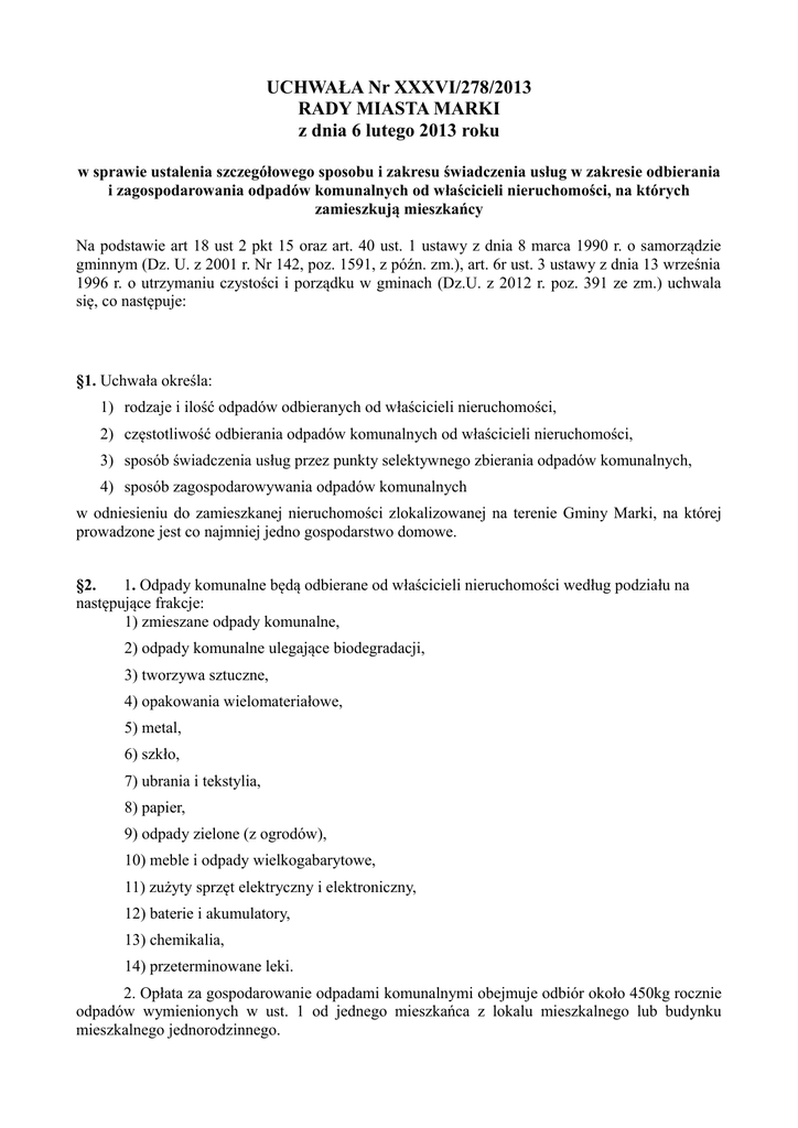 UCHWAŁA Nr XXXVI/278/2013 RADY MIASTA MARKI z dnia 6 lutego 2013 roku w sprawie ustalenia szczegółowego sposobu i zakresu świadczenia usług w zakresie odbierania i zagospodarowania odpadów komunalnych od właścicieli nieruchomości, na których zamieszkują mieszkańcy Na podstawie art 18 ust 2 pkt 15 oraz art. 40 ust. 1 ustawy z dnia 8 marca 1990 r. o samorządzie gminnym (Dz. U. z 2001 r. Nr 142, poz. 1591, z późn. zm.), art. 6r ust. 3 ustawy z dnia 13 września 1996 r. o utrzymaniu czystości i porządku w gminach (Dz.U. z 2012 r. poz. 391 ze zm.) uchwala się, co następuje: §1. Uchwała określa: 1) rodzaje i ilość odpadów odbieranych od właścicieli nieruchomości, 2) częstotliwość odbierania odpadów komunalnych od właścicieli nieruchomości, 3) sposób świadczenia usług przez punkty selektywnego zbierania odpadów komunalnych, 4) sposób zagospodarowywania odpadów komunalnych w odniesieniu do zamieszkanej nieruchomości zlokalizowanej na terenie Gminy Marki, na której prowadzone jest co najmniej jedno gospodarstwo domowe. §2. 1. Odpady komunalne będą odbierane od właścicieli nieruchomości według podziału na następujące frakcje: 1) zmieszane odpady komunalne, 2) odpady komunalne ulegające biodegradacji, 3) tworzywa sztuczne, 4) opakowania wielomateriałowe, 5) metal, 6) szkło, 7) ubrania i tekstylia, 8) papier, 9) odpady zielone (z ogrodów), 10) meble i odpady wielkogabarytowe, 11) zużyty sprzęt elektryczny i elektroniczny, 12) baterie i akumulatory, 13) chemikalia, 14) przeterminowane leki. 2. Opłata za gospodarowanie odpadami komunalnymi obejmuje odbiór około 450kg rocznie odpadów wymienionych w ust. 1 od jednego mieszkańca z lokalu mieszkalnego lub budynku mieszkalnego jednorodzinnego. §3. 1. Częstotliwość odbioru odpadów komunalnych określa załącznik nr 1 do uchwały. 2. Frakcje odpadów komunalnych dzieli się na dwie grupy, ze względu na sposób i częstotliwość odbioru: 1) grupa podstawowa obejmująca odpady odbierane od właścicieli nieruchomości regularnie, bez względu na ilość zgromadzonych odpadów, do której zalicza się: odpady mokre (zmieszane), odpady ulegające biodegradacji, tworzywa sztuczne, odpady wielomateriałowe, metal, szkło, ubrania i tekstylia oraz papier; 2) grupa dodatkowa obejmująca odpady zielone (z ogrodów), meble i odpady wielkogabarytowe, zużyte opony, zużyty sprzęt elektryczny i elektroniczny, baterie i akumulatory, chemikalia oraz przeterminowane leki. 3. Właściciel nieruchomości zamiar skorzystania z odbioru odpadów grupy dodatkowej zgłasza w miejscu i terminie podanym do publicznej wiadomości przez Burmistrza Miasta Marki na stronie internetowej Miasta Marki oraz w lokalnej prasie. 4. Burmistrz Miasta Marki podaje do publicznej wiadomości na stronie internetowej Miasta Marki oraz w lokalnej prasie terminy odbioru poszczególnych frakcji odpadów komunalnych. §4. 1. W punktach selektywnej zbiórki odpadów, znajdujących się na terenie Miasta Marki ustawia się oznakowane pojemniki na poszczególne frakcje odpadów komunalnych. 2. Właściciele nieruchomości samodzielnie dostarczają do punktów selektywnej zbiórki odpadów odpady komunalne zebrane w sposób selektywny. 3. Burmistrz Miasta Marki podaje do publicznej wiadomości na stronie internetowej Miasta Marki oraz w lokalnej prasie lokalizację punktów selektywnej zbiórki odpadów oraz wykaz odbieranych w nich frakcji. §5. Sposób zagospodarowania poszczególnych frakcji odpadów komunalnych odebranych od właścicieli nieruchomości określa załącznik nr 2 do niniejszej uchwały. §6. Wykonanie uchwały powierza się Burmistrzowi Miasta Marki. §7. Uchwała wchodzi w życie z dniem 1 lipca 2013 roku po uprzednim ogłoszeniu w Dzienniku Urzędowym Województwa Mazowieckiego.