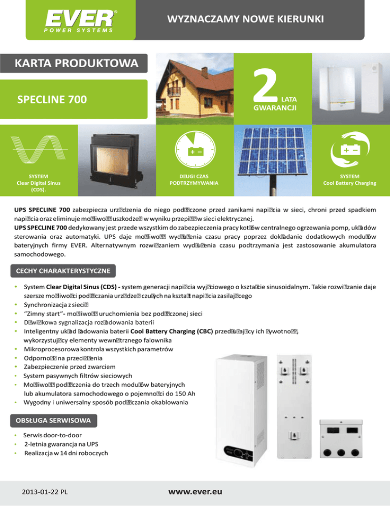 2 LATA LATA GWARANCJI GWARANCJI SYSTEM Clear Digital Sinus (CDS). DŁUGI CZAS PODTRZYMYWANIA SYSTEM SYSTEM Cool Battery Charging UPS SPECLINE 700 zabezpiecza urządzenia do niego podłączone przed zanikami napięcia w sieci, chroni przed spadkiem napięcia oraz eliminuje możliwość uszkodzeń w wyniku przepięć w sieci elektrycznej. UPS SPECLINE 700 dedykowany jest przede wszystkim do zabezpieczenia pracy kotłów centralnego ogrzewania pomp, układów sterowania oraz automatyki. UPS daje możliwość wydłużenia czasu pracy poprzez dokładanie dodatkowych modułów bateryjnych firmy EVER. Alternatywnym rozwiązaniem wydłużenia czasu podtrzymania jest zastosowanie akumulatora samochodowego. ź System Clear Digital Sinus (CDS) - system generacji napięcia wyjściowego o kształcie sinusoidalnym. Takie rozwiązanie daje szersze możliwości podłączania urządzeń czułych na kształt napięcia zasilającego ź Synchronizacja z siecią ź “Zimny start”- możliwość uruchomienia bez podłączonej sieci ź Dźwiękowa sygnalizacja rozładowania baterii ź Inteligentny układ ładowania baterii Cool Battery Charging (CBC) przedłużający ich żywotność, wykorzystujący elementy wewnętrznego falownika ź Mikroprocesorowa kontrola wszystkich parametrów ź Odporność na przeciążenia ź Zabezpieczenie przed zwarciem ź System pasywnych filtrów sieciowych ź Możliwość podłączenia do trzech modułów bateryjnych lub akumulatora samochodowego o pojemności do 150 Ah ź Wygodny i uniwersalny sposób podłączania okablowania ź Serwis door-to-door ź 2-letnia gwarancja na UPS ź Realizacja w 14 dni roboczych 2013-01-22 PL SPECLINE 700 PARAMETRY TECHNICZNE TYP / PARAMETRY Moc wyjściowa maksymalna (30 sek.) Znamionowa moc wyjściowa MODUŁ BATERYJNY ZASILACZ UPS 700 VA / 400 W 200 W 0 ÷ +35 0C Temperatura pracy Temperatura przechowywania Wilgotność względna w czasie pracy Wilgotność względna w czasie przechowywania Wysokość n.p.m. Sygnalizacja Bezpieczniki PRACA SIECIOWA Napięcie wejściowe Częstotliwość napięcia wejściowego Zakres napięcia wyjściowego Progi przełączenia: sieć - UPS Kształt napięcia wyjściowego Uwaga! Producent zastrzega sobie prawo do zmiany w/w parametrów bez uprzedniego powiadamiania. Filtracja napięcia wyjściowego Czas przełączenia na pracę z baterii PRACA BATERYJNA Napięcie wyjściowe (wartość skuteczna) Kształt napięcia wyjściowego Progi przełączania: UPS - sieć Częstotliwość napięcia wyjściowego Filtracja napięcia wyjściowego Zabezpieczenie przeciwzwarciowe Zabezpieczenie przeciążeniowe Czas powrotu na pracę sieciową Czas podtrzymania 1 moduł (100%/50%PZN) Czas podtrzymania 2 moduły (100%/50%PZN) Czas podtrzymania 3 moduły (100%/50%PZN) Akumulatory modułu bateryjnego 0 ÷ +45 0C 20 % do 80 % (bez kondensacji) 20 % do 95 % (bez kondensacji) do 1000 m Akustyczno - optyczna Szklany 5 x 20 mm 5 A Unival 19 mm 40 A ~184 V ÷ ~264 V ± 2 % 45 Hz ÷ 55 Hz ± 1 Hz ~184 V ÷ ~264 V ± 2 % ~184 V ÷ ~264 V ± 2 % Sinusoidalny Filtr przeciwzakłóceniowy RFI / EMI, tłumik warystorowy < 3 ms ~230 V ± 5 % Sinusoidalny ~189 V / ~259 V ± 2 % 50 Hz ± 1 Hz LC Elektroniczne + bezpiecznik topikowy Elektroniczne + bezpiecznik topikowy 0 ms 1 h 50 min / 3 h 50 min 3 h 50 min / 8 h 6 h / 13 h 6 x VRLA 12 V / 7 Ah Czas ładowania modułu 42 Ah (do 90% pojemności) 10 h 3 szt. 150 Ah Maksymalna liczba modułów bateryjnych 42 Ah Maksymalna pojemność zewnętrznej baterii PARAMETRY MECHANICZNE Wymiary (wys. x szer. x gł.) Waga zasilacza Pozycja pracy Produkt zgodny z CE / Wyprodukowany w Polsce 2013-01-22 PL Unival 19 mm 40 A 367 x 118 x 125 mm 5,5 kg 367 x 209 x 119 mm 17 kg Wisząca lub leżąca SPECLINE 700 PARAMETRY TECHNICZNE ZABEZPIECZENIA PRZECIĄŻENIOWE Zasilacz sygnalizuje przeciążenie dla obciążenia powyżej 110% mocy znamionowej zasilacza. Sygnalizacja występuje tylko przy pracy z baterii. Zasilacz: - w zakresie 200-400 W wyłącza się po 30 sekundach, - powyżej 400 W wyłącza się w ciągu 5 sekund. Dioda LED znajdująca się na panelu czołowym zaczyna szybko pulsować, a sygnał dźwiękowy jest przerywany. PRZECIWZWARCIOWE Zasilacz wyposażony jest w bezpiecznik topikowy na wejściu sieci oraz bezpiecznik elektroniczny na wyjściu. Bezpiecznik elektroniczny działa tylko przy pracy bateryjnej. Zadziałanie bezpiecznika elektronicznego sygnalizowane jest przez szybko migającą diodę LED. Stan zwarcia sygnalizowany jest również przez bardzo szybki przerywany sygnał dźwiękowy. NADNAPIĘCIOWE AKUMULATORA Zasilacz zabezpieczony jest na wypadek podłączenia akumulatora o napięciu wyższym niż znamionowe. W takim przypadku przepaleniu ulegnie samochodowy bezpiecznik topikowy. ODWROTNE PODŁĄCZENIE AKUMULATORA Zasilacz zabezpieczony jest na wypadek odwrotnego podłączenia akumulatora. W przypadku zadziałania zabezpieczenia nadnapięciowego lub odwrotnej polaryzacji akumulatora, poza przepaleniem się bezpiecznika UNIVAL, uszkodzeniu również ulega dioda zabezpieczająca. W takiej sytuacji należy się zwrócić do serwisu producenta w celu wymiany uszkodzonych elementów. NADPRĄDOWE AKUMULATORA Zasilacz zabezpieczony jest na wypadek przekroczenia maksymalnego prądu akumulatora dwoma zabezpieczeniami: - elektronicznie, - bezpiecznikiem samochodowym typu UNIVAL 19 mm 40 A. SPECLINE - mocowanie / panel dolny 2013-01-22 PL SPECLINE MODUŁ BATERYJNY mocowanie / panel dolny SPECLINE 700 PARAMETRY TECHNICZNE PANEL CZOŁOWY 2 1 1) Czerwona dioda sygnalizacyjna obrazuje różne tryby pracy zasilacza symbolicznie oznaczone znakami graficznymi: a) ciągłe świecenie czerwonej diody LED oznacza pracę sieciową, b) pulsowanie czerwonej diody LED, co 2,5 sek. oznacza ładowanie baterii, c) pulsowanie czerwonej diody LED i przerywany sygnał dźwiękowy oznacza pracę z baterii; gdy sygnał przejdzie w ciągły do wyłączenia UPS-a pozostaje max. 30 s, d) szybkie pulsowanie czerwonej diody LED i sy