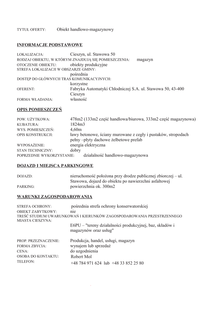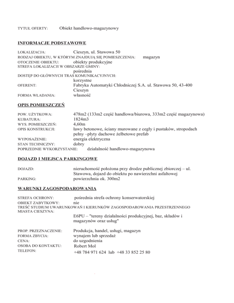 Obiekt handlowo-magazynowy INFORMACJE PODSTAWOWE
