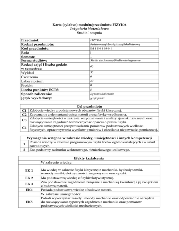 Karta (sylabus) modułu/przedmiotu FIZYKA Inżynieria Materiałowa Studia I stopnia Przedmiot: Rodzaj przedmiotu: Kod przedmiotu: Rok: Semestr: Forma studiów: Rodzaj zajęć i liczba godzin w semestrze: Wykład Ćwiczenia Laboratorium Projekt Liczba punktów ECTS: Sposób zaliczenia: Język wykładowy: FIZYKA Podstawowy/obowiązkowy/fakultatywny IM 1 S 0 1 03-0_1 I 1 Studia stacjonarne/Studia niestacjonarne 60 30 0 30 0 5 Egzamin/zaliczenie Język polski Cel przedmiotu C1 Zdobycie wiedzy z podstawowych obszarów fizyki klasycznej. C2 Zapoznanie z elementami opisu materii przez fizykę współczesną. Zdobycie umiejętności w zakresie: rozpoznawania i analizy zjawisk fizycznych oraz rozwiązywania zagadnień technicznych w oparciu o prawa fizyki. Zdobycie umiejętności przeprowadzania pomiarów podstawowych wielkości C4 fizycznych, opracowywania wyników pomiarów i określania niepewności pomiarowej. C3 Wymagania wstępne w zakresie wiedzy, umiejętności i innych kompetencji 1 2 Posiada wiedzę w zakresie programowym fizyki liceów ogólnokształcących i w szkół zawodowych. Zna podstawy rachunku wektorowego, różniczkowego i całkowego. Efekty kształcenia W zakresie wiedzy: EK 1 Ma wiedzę w zakresie fizyki klasycznej z mechaniki, hydrodynamiki, termodynamiki, elektryczności i magnetyzmu oraz optyki. EK 2 Ma podstawową wiedzę z fizyki relatywistycznej. Zna podstawowe zagadnienia związane z mechaniką kwantową i jej związkiem z budową materii. Posiada podstawową wiedzę o budowie materii. EK 3 EK4 W zakresie umiejętności: EK5 Potrafi wykorzystać zasady i metody mechaniki oraz odpowiednie narzędzia do rozwiązywania typowych zagadnień z mechaniki oraz pomiarów podstawowych wielkości mechanicznych. EK6 EK7 EK8 Potrafi zastosować prawa i metody elektrodynamiki do pomiarów wielkości elektrycznych i magnetycznych. Potrafi wykorzystać poznane zasady i metody fizyki fal do rozwiązywania typowych zadań z optyki i akustyki. Potrafi zinterpretować uzyskane rezultaty pomiarów podstawowych wielkości fizycznych. W zakresie kompetencji społecznych: EK9 Umie pracować w zespole i ponosić odpowiedzialność za wspólnie realizowane zadania. Treści programowe przedmiotu Forma zajęć – wykłady Treści programowe W1 W2 W3 W4 W5 W6 W7 W8 W9 Wprowadzenie. Zjawiska fizyczne. Wielkości fizyczne podstawowe i pochodne. Działania na wektorach. Pomiary w fizyce. Kinematyka. Opis ruchu prostoliniowego oraz w dwu i trzech wymiarach. Względność ruchu. Transformacja Galileusza. Układy odniesienia. Transformacja prędkości i przyspieszenia. Ruch jednostajny i zmienny po okręgu. Dynamika punktu materialnego. Wielkości dynamiczne, siła i pęd. Zasady dynamiki Newtona. Podstawowe siły w przyrodzie. Inercjalne i nieinercjalne układy odniesienia. Siły bezwładności w ruchu prostoliniowym i obrotowym. Zasady zachowania pędu i energii. Moment siły. Moment pędu. Pole grawitacyjne. Natężenie i potencjał pola. Związek między siłą grawitacji i potencjałem grawitacyjnym. Energia potencjalna. Energia kinetyczna. Praca. Zasada zachowania energii mechanicznej. Związek pracy i sił zachowawczych. Elementy mechaniki bryły sztywnej. Środek mas układu wielu cząstek. Ruch środka mas. Zderzenia ciał. Ruch obrotowy bryły sztywnej. Moment siły. Moment pędu. Moment bezwładności. Twierdzenie Steinera. Prawa ruchu obrotowego bryły sztywnej. Zasada zachowania momentu pędu. Energia kinetyczna w ruchu obrotowym. Ruch postępowo-obrotowy bryły sztywnej. Elementy mechaniki relatywistycznej. Kinematyka relatywistyczna. Stałość prędkości światła. Dylatacja czasu. Transformacje Galileusza i Lorentza. Paradoks bliźniąt. Dynamika relatywistyczna. Relatywistyczne dodawanie prędkości. Zależność masy od prędkości. Masa i energia. Związek energii z pędem. Ruch drgający i falowy. Drgania swobodne, tłumione i wymuszone. Superpozycja drgań harmonicznych, dudnienia, modulacja. Przemiany energii w ruchu drgającym. Zjawisko rezonansu. Rodzaje i opis fal. Wielkości charakteryzujące ruch falowy. Równanie fali płaskiej. Równanie fali sferycznej i kolistej. Interferencja i dyfrakcja fal. Źródła spójne. Fale stojące. Prędkość fazowa i grupowa. Paczki falowe. Analiza Fouriera. Elektryczność i magnetyzm. Elementy elektrostatyki. Ładunek i prąd elektryczny. Natężenie i gęstość prądu elektrycznego. Opór elektryczny i opór elektryczny właściwy. Prawo Ohma – obraz klasyczny i mikroskopowy. Praca i moc prądu. Ciepło Joule’a. Pole magnetyczne. Wektor indukcji magnetycznej. Siła Lorentza. Prawo Biota-Savarta. Prawo Ampere’a. Solenoidy i toroidy. Optyka falowa. Zasada Huygensa-Fresnela. Ugięcie fal. Odbicie fali. Prawo odbicia. Załamanie fali. Prawo załamania. Rozszczepienie światła. Natężenie fali. Fale elektromagnetyczne. Promieniowanie widzialne. Interferencja światła. Doświadczenie Younga. Dyfrakcja. Polaryzacja światła. Prawo Malusa. Optyka geometryczna. Zasada Fermata. Odbicie i załamanie światła. Całkowite W10 W11 W12 W13 W14 W15 wewnętrzne odbicie. Zwierciadła. Soczewki, układy soczewek. Równanie soczewki cienkiej. Zdolność zbierająca układu soczewek. Soczewki grube. Przyrządy optyczne. Aberracja sferyczna i chromatyczna. Dyspersja światła normalna i anomalna. Elementy hydrodynamiki. Statyka płynów. Zmiany ciśnienia z głębokością. Ciśnienie hydrostatyczne. Opis ruchu cieczy wg. Lagrange’a, wg. Eulera. Rodzaje przepływu cieczy. Równanie ciągłości. Równanie Bernoulliego. Wzór Newtona (siła lepkości). Wydajność strumienia cieczy. Termodynamika. Kinetyczno-molekularny model gazu doskonałego. Fenomenologiczne prawa gazowe. Energia wewnętrzna. I zasada termodynamiki. Zasada ekwipartycji energii. Ciepło właściwe gazu. Gazy rzeczywiste. Rozkład prędkości cząsteczek. Rozkład Maxwella. Podstawy fizyki kwantowej. Promieniowanie temperaturowe. Model ciała doskonale czarnego. Prawo Kirchho
