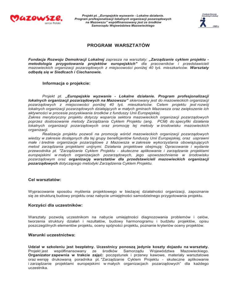 Projekt pt. „Europejskie wyzwanie - Lokalne działanie. Program profesjonalizacji lokalnych organizacji pozarządowych na Mazowszu” współfinansowany jest ze Ğrodków Samorządu Województwa Mazowieckiego PROGRAM WARSZTATÓW Fundacja Rozwoju Demokracji Lokalnej zaprasza na warsztaty: „Zarządzanie cyklem projektu metodologia przygotowania projektów europejskich" dla pracowników i przedstawicieli mazowieckich organizacji pozarządowych z miejscowoĞci poniĪej 40 tyĞ. mieszkaĔców. Warsztaty odbĊdą siĊ w Siedlcach i Ciechanowie. Informacja o projekcie: Projekt pt. „Europejskie wyzwanie - Lokalne działanie. Program profesjonalizacji lokalnych organizacji pozarządowych na Mazowszu” skierowany jest do mazowieckich organizacji pozarządowych z miejscowoĞci poniĪej 40 tyĞ. mieszkaĔców. Celem projektu jest rozwój lokalnych organizacji pozarządowych działających w małych gminach Mazowsza oraz zwiĊkszenie ich aktywnoĞci w procesie pozyskiwania Ğrodków z funduszy Unii Europejskiej. Zakres merytoryczny projektu dotyczy wsparcia sektora mazowieckich organizacji pozarządowych poprzez dostosowanie metody Zarządzania Cyklem Projektu (ang. PCM) do specyfiki działania lokalnych organizacji pozarządowych oraz promocjĊ tej metody w Ğrodowisku mazowieckich organizacji. Realizacja projektu pozwoli na promocjĊ wĞród mazowieckich organizacji pozarządowych wiedzy w zakresie dostĊpnych dla tej grupy beneficjentów funduszy Unii Europejskiej, oraz usprawni małe i Ğrednie organizacje pozarządowe z Mazowsza w zakresie wykorzystania obowiązujących metod zarządzania projektami unijnymi. Działania projektowe obejmują: Opracowanie i wydanie przewodnika pt. "Zarządzanie Cyklem Projektu - skuteczne aplikowanie i zarządzanie projektami europejskimi w małych organizacjach pozarządowych, jego upowszechnienie w Ğrodowisku pozarządowym oraz organizacjĊ warsztatów dla przedstawicieli mazowieckich organizacji pozarządowych dotyczącego metodyki Zarządzenia Cyklem Projektu. Cel warsztatów: Wypracowanie sposobu myĞlenia projektowego w bieĪącej działalnoĞci organizacji, zapoznanie siĊ ze strukturą budowy projektu oraz nabycie umiejĊtnoĞci samodzielnego przygotowania projektu. KorzyĞci dla uczestników: Warsztaty pozwolą uczestnikom na nabycie umiejĊtnoĞci diagnozowania problemów i celów, tworzenia struktury działaĔ i rezultatów, budowy harmonogramu i budĪetu projektów, opisu poszczególnych elementów projektu, oceny spójnoĞci projektu, poznanie kryteriów oceny projektów. Warunki uczestnictwa: Udział w szkoleniu jest bezpłatny. Uczestnicy ponoszą jedynie koszty dojazdu na warsztaty. Projekt jest współfinansowany ze Ğrodków Samorządu Województwa Mazowieckiego. Organizator zapewnia w trakcie zajĊü: poczĊstunek i przerwy kawowe, materiały warsztatowe oraz wersjĊ drukowaną poradnika pt. "Zarządzanie Cyklem Projektu - skuteczne aplikowanie i zarządzanie projektami europejskimi w małych organizacjach pozarządowych” dla kaĪdego uczestnika. Program zajĊü: Projekt pt. „Europejskie wyzwanie - Lokalne działanie. Program profesjonalizacji lokalnych organizacji pozarządowych na Mazowszu” współfinansowany jest ze Ğrodków Samorządu Województwa Mazowieckiego 10:00 – 11:30 CzĊĞü I Prezentacja podrĊcznika dla uczestników oraz wprowadzenie do metodyki Zarządzania Cyklem Projektu, charakterystyka i cykl projektu. ûwiczenie: analiza problemów i interesariuszy (metody diagnozowania problemów i definiowania grup docelowych). 11:30 – 11:45 przerwa 11:45 – 13:15 CzĊĞü II Analiza celów i wybór strategii projektu. Wybór i praca w grupach roboczych - omówienie wyników pracy w grupach. 13:15 – 13:45 przerwa obiadowa 13:45 – 15:15 CzĊĞü III Wprowadzenie do matrycy logicznej projektu. ûwiczenie: przygotowanie matrycy logicznej dla przykładowego projektu. 15:15 – 15:30 przerwa 15:30 – 17:00 CzĊĞü IV Opracowanie harmonogramu projektu, konstrukcja budĪetu oraz üwiczenie: praca w grupach roboczych na temat zastosowania metody Zarządzania Cyklem Projektu w przygotowaniu wniosku o dofinansowanie. Podsumowanie warsztatów. Trenerzy: Witold Monkiewicz – jeden z liderów ruchu organizacji pozarządowych w Polsce. Kierownik wielu projektów realizowanych z funduszy UE. Wykładowca i trener. Specjalizuje siĊ w dziedzinie tworzenia i zarządzania projektami unijnymi. Grzegorz RzeĨnik – Odpowiada za realizacjĊ Programu Eksperckiego FRDL, przygotowuje i realizuje projekty finansowane z funduszy Unii Europejskiej w sektorze badawczo-rozwojowym. Doktorant INP UW, zajmuje siĊ m.in. europejską polityką rozwoju regionalnego. Marzena Wojda – ekonomistka, absolwentka studiów podyplomowych w SGH w Warszawie w zakresie zarządzania projektami. Przedstawicielka organizacji pozarządowych z ramienia FRDL w Komitecie Monitorującym RPO Województwa Mazowieckiego. Autorka licznych projektów. Miejsce i termin: 9 listopad 2009 w Siedlcach 16 listopada 2009 w Ciechanowie. Kontakt i rekrutacja: Zainteresowane organizacje zapraszamy na stronĊ www.frdl.org.pl oraz do kontaktu z naszymi oĞrodkami: w Siedlcach z Panią Eweliną Bolestą (e-mail: [email protected] oraz w Ciechanowie z Panią Marta Piecychną (e-mail: [email protected].