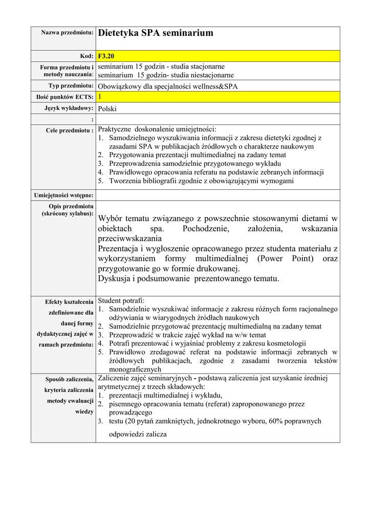Nazwa przedmiotu: Dietetyka SPA seminarium