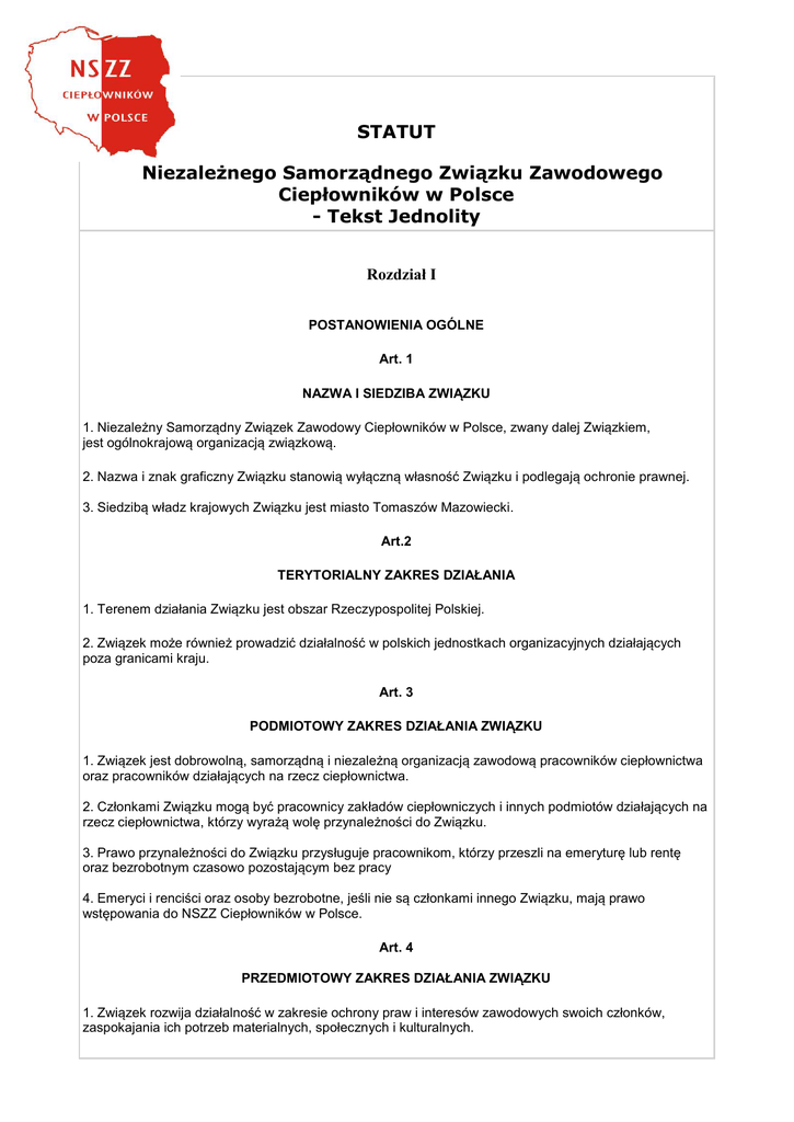 STATUT Niezależnego Samorządnego Związku Zawodowego Ciepłowników w Polsce - Tekst Jednolity Rozdział I POSTANOWIENIA OGÓLNE Art. 1 NAZWA I SIEDZIBA ZWIĄZKU 1. Niezależny Samorządny Związek Zawodowy Ciepłowników w Polsce, zwany dalej Związkiem, jest ogólnokrajową organizacją związkową. 2. Nazwa i znak graficzny Związku stanowią wyłączną własność Związku i podlegają ochronie prawnej. 3. Siedzibą władz krajowych Związku jest miasto Tomaszów Mazowiecki. Art.2 TERYTORIALNY ZAKRES DZIAŁANIA 1. Terenem działania Związku jest obszar Rzeczypospolitej Polskiej. 2. Związek może również prowadzić działalność w polskich jednostkach organizacyjnych działających poza granicami kraju. Art. 3 PODMIOTOWY ZAKRES DZIAŁANIA ZWIĄZKU 1. Związek jest dobrowolną, samorządną i niezależną organizacją zawodową pracowników ciepłownictwa oraz pracowników działających na rzecz ciepłownictwa. 2. Członkami Związku mogą być pracownicy zakładów ciepłowniczych i innych podmiotów działających na rzecz ciepłownictwa, którzy wyrażą wolę przynależności do Związku. 3. Prawo przynależności do Związku przysługuje pracownikom, którzy przeszli na emeryturę lub rentę oraz bezrobotnym czasowo pozostającym bez pracy 4. Emeryci i renciści oraz osoby bezrobotne, jeśli nie są członkami innego Związku, mają prawo wstępowania do NSZZ Ciepłowników w Polsce. Art. 4 PRZEDMIOTOWY ZAKRES DZIAŁANIA ZWIĄZKU 1. Związek rozwija działalność w zakresie ochrony praw i interesów zawodowych swoich członków, zaspokajania ich potrzeb materialnych, społecznych i kulturalnych. 2. Związek reprezentuje swoich członków i działa w ich interesie oraz współuczestniczy w kształtowaniu i realizacji zadań społeczno-gospodarczych. 3. Związek realizując swe statutowe zadania i cele przestrzega zasad zawartych w Konstytucji Rzeczypospolitej Polskiej oraz w innych przepisach prawa, a także w ratyfikowanych przez Rzeczpospolitą Polską Konwencjach Międzynarodowej Organizacji Pracy. Rozdział II CELE I ZADANIA ZWIĄZKU Art.5 CELE ZWIĄZKU Celem Związku jest obrona praw, godności zawodowej i interesów członków Związku, a w szczególności: 1) obrona interesów zawodowych, materialnych, socjalnych i kulturalnych członków oraz ich rodzin, 2) zabezpieczenie praw pracowniczych w zakresie wykonywanej pracy zawodowej, wynagrodzenia, warunków socjalno-bytowych oraz bezpieczeństwa i higieny pracy, 3) harmonizowanie działania pracodawców z interesami pracowników, 4) stwarzanie pracownikom warunków do podnoszenia kwalifikacji zawodowych i adaptacji społecznozawodowej młodych pracowników, 5) udział w kształtowaniu i realizacji zadań społeczno-gospodarczych zakładu, 6) oddziaływanie na kształtowanie etyki zawodowej, 7) poszerzanie wiedzy członków Związku. Art. 6 ZADANIA ZWIĄZKU Zadaniami Związku są w szczególności: 1) reprezentowanie interesów zawodowych członków Związku oraz nie zrzeszonej kadry technicznej wobec pracodawców, organów administracji państwowej i gospodarczej oraz organizacji społecznych i samorządowych, 2) sprawowanie kontroli nad przestrzeganiem prawa pracy, 3) udzielanie pomocy prawnej członkom Związku oraz podejmowanie interwencji i mediacji w przypadkach indywidualnych konfliktów z pracodawca. Na wniosek pracownika nie zrzeszonego Związek może podjąć się obrony jego praw i interesów wobec pracodawcy, 4) uczestniczenie w tworzeniu lub konsultowaniu aktów prawnych, w szczególności dotyczących: prawa pracy, ubezpieczeń społecznych i praw socjalnych, 5) uczestniczenie w kształtowaniu polityki zatrudnienia i płac, 6) sprawowanie kontroli nad przestrzeganiem przez pracodawców obowiązku zapewnienia pracownikom bezpiecznych i higienicznych warunków pracy, a także udział w opracowywaniu planów poprawy warunków pracy, 7) podejmowanie starań o zapewnienie członkom Związku i ich rodzinom możliwości korzystania z zakładowego funduszu świadczeń socjalnych, 8) negocjowanie i zawieranie z pracodawcami porozumień w sprawach dotyczących zbiorowych praw i interesów pracowniczych, a w szczególności: a) układów zbiorowych pracy, b) regulaminów pracy, c) regulaminów nagradzania i premiowania, d) rozkładu czasu pracy, e) planu urlopów i szkoleń, f) świadczeń socjalno bytowych i kulturalnych. 9) prowadzenie działalności kulturalnooświatowej oraz tworzenie warunków do wypoczynku, 10) współudział w działaniach na rzecz poprawy ochrony zdrowia i opieki lekarskiej, 11) przeciwdziałanie bezrobociu i pomoc bezrobotnym członkom Związku, 12) udzielanie pomocy materialnej członkom Związku w miarę istniejących możliwości i koniecznej potrzeby, 13) otaczanie opieka nowych członków Związku, w tym szczególnie młodzieży i dbanie o podnoszenie jej kwalifikacji zawodowych, 14) organizowanie szkoleń związkowych w celu poszerzania wiedzy członków Związku. Art. 7 SPOSOBY I FORMY REALIZACJI Do osiągnięcia powyższych celów i zadań Związek będzie dążył poprzez: 1) partnerskie współdziałanie z pracodawcami, organizacjami zawodowymi i samorządowymi oraz administracją państwową, 2) kierowanie działalnością Społecznej Inspekcji Pracy i współpracę z Państwową Inspekcją Pracy, 3) współpracę z organizacjami społeczno-zawodowymi w kraju i za granicą oraz z organizacjami naukowymi i naukowo-technicznymi, a w szczególności z ich ogniwami zakładowymi, 4) opiniowanie założeń i projektów ustaw oraz aktów wykonawczych do tych ustaw w zakresie objętym zadaniami związków zawodowych, 5) opiniowanie decyzji dotyczących praw i interesów członków Związku, osób nie zrzeszonych oraz organizacji reprezentowanych przez Związek, 6) organizowanie i kierowanie akcjami protestacyjnymi aż do ogłoszenia strajku włącznie w przypadku naruszenia praw i interesów pracowniczych, jeżeli spór nie zostanie rozstrzygnięty w drodze rokowań i mediacji. Akcje pr