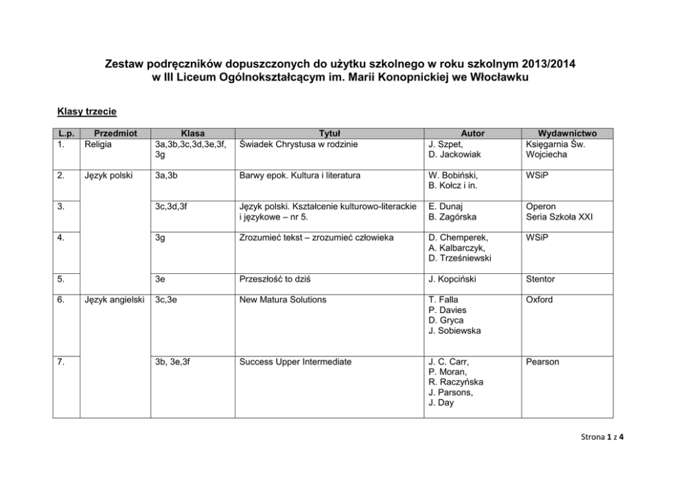 Zestaw podręczników dopuszczonych do użytku szkolnego w roku szkolnym 2013/2014 w III Liceum Ogólnokształcącym im. Marii Konopnickiej we Włocławku Klasy trzecie L.p. 1. Przedmiot Religia Klasa 3a,3b,3c,3d,3e,3f, 3g Tytuł Świadek Chrystusa w rodzinie Autor J. Szpet, D. Jackowiak Wydawnictwo Księgarnia Św. Wojciecha 2. Język polski 3a,3b Barwy epok. Kultura i literatura W. Bobiński, B. Kołcz i in. WSiP 3. 3c,3d,3f Język polski. Kształcenie kulturowo-literackie i językowe – nr 5. E. Dunaj B. Zagórska Operon Seria Szkoła XXI 4. 3g Zrozumieć tekst – zrozumieć człowieka D. Chemperek, A. Kalbarczyk, D. Trześniewski WSiP 5. 3e Przeszłość to dziś J. Kopciński Stentor 3c,3e New Matura Solutions T. Falla P. Davies D. Gryca J. Sobiewska Oxford 3b, 3e,3f Success Upper Intermediate J. C. Carr, P. Moran, R. Raczyńska J. Parsons, J. Day Pearson 6. 7. Język angielski Strona 1 z 4 8. 3a,3g,3c,3f Oxford Excellence for Matura J. Quintana, J. Sosnowska. D. Gryca Oxford University Press 9. 3d Succes Intrmediate S. McKinley A. Raczyńska B. Hastings Pearson 10. 3d Longman Matura Rozszerzona M. Umińska i in. Pearson 3a,3b,3c.3d,3e,3f Alles klar 2a, 2b K. Łuniewska, U. Tworek, Z. Wąsik, M. Zagórna WSiP 3g Alles klar 3 zakres rozszerzony K. Łuniewska, U. Tworek, Z. Wąsik, M. Zagórna WSiP 3b, 3d, 3e, 3f Echo A1 J. Girardet, J. Pêcheur CLÉ international 3g Echo A2 J. Girardet, J. Pêcheur CLÉ International Język angielski 11. Język niemiecki 12. 13. Język francuski 14. 15. Język włoski 3a,3b,3c,3d,3f Nuovo Progetto Italiano 1 (A1-A2) T. Martin I in. Nowela/ Edilingua 16. Język hiszpański 3e Español en marcha (nivelbasico) SGEL 17. Język rosyjski 3a,3b,3c,3d,3e,3f Boт u мы 3 F. Castro Viudez P. DiazBallesteros I. RoderoDiaz M. Wiatr-Kmieciak S. Wujec Wydawnictwo Szkolne PWN Strona 2 z 4 3a,3b,3c,3d,3e,3f, 3g 3a, 3b, 3c, 3d, 3g Burzliwy wiek XX R. Śniegocki Nowa Era Wiedza o społeczeństwie liceum ogólnokształcące, liceum profilowane i technikum – zakres podstawowy L. Moryksiewicz M. Pacholska Nowa Era 20. 3f Wiedza o społeczeństwie – zakres rozszerzony L. Moryksiewicz M. Pacholska Nowa Era 21. 3e Wiedza o społeczeństwie Z. Smutek, J. Materska, B. Surmacz Operon 18. Historia 19. Wiedza o społeczeństwie 22. Podstawy przedsiębiorczości 3a,3b,3c,3d,3e,3f, 3g Podstawy ekonomii. Podręcznik do podstaw przedsiębiorczości J. Neneman i in. Fundacja Młodzieżowej Przedsiębiorczości 23. Geografia 3a,3b,3c,3d,3e,3f, 3g Geografia na czasie 3. Geografia Polski. B. Lenartowicz E. Wilczyńska M. Wójcik Wydawnictwo Szkolne PWN 24. Biologia 3d Biologia 3. Zakres rozszerzony. W. Lewiński, J. Prokop i in. Operon 25. Chemia 3c,3e,3f, 3g Chemia organiczna. Zakres podstawowy. Nowa Era 3d Chemia ogólna i nieorganiczna M. Litwin S. Styka-Wlazło J. Szymańska M. Litwin S. Styka-Wlazło J. Szymańska 26. Nowa Era Strona 3 z 4 27. Fizyka 3a,3b Fizyka dla szkół ponadgimnazjalnych. Treści rozszerzone. J. Salach M. Fiałkowska K. Fiałkowski B. Sagnowska Wydawnictwo ZamKor 28. Matematyka 3a,3b,3c,3d,3e,3f, 3g Matematyka dla klasy III liceum i technikum. Zakres podstawowy i rozszerzony. R. Kalina, T. Szymański, F. Linke, M. Woźniak Wydawnictwo SENS 29. Informatyka 3b Informatyka dla liceum ogólnokształcącego. Zakres podstawowy. G. Koba Migra 3a Informatyka dla liceum ogólnokształcącego. Zakres rozszerzony. G. Koba Migra 30. Strona 4 z 4