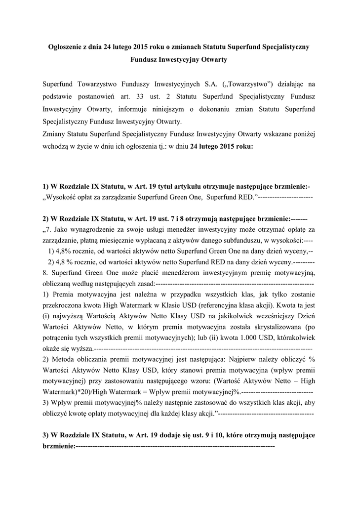 Ogłoszenie z dnia 24 lutego 2015 roku o zmianach Statutu Superfund Specjalistyczny Fundusz Inwestycyjny Otwarty Superfund Towarzystwo Funduszy Inwestycyjnych S.A. („Towarzystwo”) działając na podstawie postanowień art. 33 ust. 2 Statutu Superfund Specjalistyczny Fundusz Inwestycyjny Otwarty, informuje niniejszym o dokonaniu zmian Statutu Superfund Specjalistyczny Fundusz Inwestycyjny Otwarty. Zmiany Statutu Superfund Specjalistyczny Fundusz Inwestycyjny Otwarty wskazane poniżej wchodzą w życie w dniu ich ogłoszenia tj.: w dniu 24 lutego 2015 roku: 1) W Rozdziale IX Statutu, w Art. 19 tytuł artykułu otrzymuje następujące brzmienie:„Wysokość opłat za zarządzanie Superfund Green One, Superfund RED.”----------------------2) W Rozdziale IX Statutu, w Art. 19 ust. 7 i 8 otrzymują następujące brzmienie:------„7. Jako wynagrodzenie za swoje usługi menedżer inwestycyjny może otrzymać opłatę za zarządzanie, płatną miesięcznie wypłacaną z aktywów danego subfunduszu, w wysokości:---1) 4,8% rocznie, od wartości aktywów netto Superfund Green One na dany dzień wyceny,-2) 4,8 % rocznie, od wartości aktywów netto Superfund RED na dany dzień wyceny.--------8. Superfund Green One może płacić menedżerom inwestycyjnym premię motywacyjną, obliczaną według następujących zasad:-----------------------------------------------------------------1) Premia motywacyjna jest należna w przypadku wszystkich klas, jak tylko zostanie przekroczona kwota High Watermark w Klasie USD (referencyjna klasa akcji). Kwota ta jest (i) najwyższą Wartością Aktywów Netto Klasy USD na jakikolwiek wcześniejszy Dzień Wartości Aktywów Netto, w którym premia motywacyjna została skrystalizowana (po potrąceniu tych wszystkich premii motywacyjnych); lub (ii) kwota 1.000 USD, którakolwiek okaże się wyższa.------------------------------------------------------------------------------------------2) Metoda obliczania premii motywacyjnej jest następująca: Najpierw należy obliczyć % Wartości Aktywów Netto Klasy USD, który stanowi premia motywacyjna (wpływ premii motywacyjnej) przy zastosowaniu następującego wzoru: (Wartość Aktywów Netto – High Watermark)*20)/High Watermark = Wpływ premii motywacyjnej%.-----------------------------3) Wpływ premii motywacyjnej% należy następnie zastosować do wszystkich klas akcji, aby obliczyć kwotę opłaty motywacyjnej dla każdej klasy akcji.”---------------------------------------3) W Rozdziale IX Statutu, w Art. 19 dodaje się ust. 9 i 10, które otrzymują następujące brzmienie:----------------------------------------------------------------------------------- „9. Superfund RED może płacić menedżerom inwestycyjnym premię motywacyjną, obliczaną według następujących zasad:-----------------------------------------------------------------------------1) Premia motywacyjna jest należna w przypadku wszystkich klas, jak tylko zostanie przekroczona kwota High Watermark w Klasie USD (referencyjna klasa akcji). Kwota ta jest (i) najwyższą Wartością Aktywów Netto Klasy USD na jakikolwiek wcześniejszy Dzień Wartości Aktywów Netto, w którym premia motywacyjna została skrystalizowana (po potrąceniu tych wszystkich premii motywacyjnych); lub (ii) kwota 1.000 USD, którakolwiek okaże się wyższa.-------------------------------------------------------------------------------------------2) Metoda obliczania premii motywacyjnej jest następująca: Najpierw należy obliczyć % Wartości Aktywów Netto Klasy USD, który stanowi premia motywacyjna (wpływ premii motywacyjnej) przy zastosowaniu następującego wzoru: (Wartość Aktywów Netto – High Watermark)*25)/High Watermark = Wpływ premii motywacyjnej%.-----------------------------3) Wpływ premii motywacyjnej% należy następnie zastosować do wszystkich klas akcji, aby obliczyć kwotę opłaty motywacyjnej dla każdej klasy akcji.----------------------------------------10. Subfundusze wchodzące w skład Superfund Sicav ponoszą opłatę za zarządzanie alternatywnym funduszem inwestycyjnym w wysokości:--------------------------------------------1) 0,075% rocznie od średniej wartości aktywów netto Superfund Green One w danym okresie, płatna co miesiąc, minimum 20.000 EUR rocznie,-----------------------------------------2) 0,075% rocznie od średniej wartości aktywów netto Superfund RED w danym okresie, płatna co miesiąc, minimum 20.000 EUR rocznie.”--------------------------------------------------- W pozostałym zakresie Statut Funduszu pozostaje bez zmian.