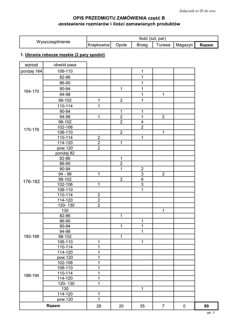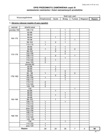 Załącznik nr 05 do siwz OPIS PRZEDMIOTU ZAMÓWIENIA część B -zestawienie rozmiarów i ilości zamawianych produktów Wyszczególnienie Ilość (szt, par) Krapkowice Opole Brzeg Turawa Magazyn Razem 0 90 1. Ubrania robocze męskie (2 pary spodni) wzrost poniżej 164 164-170 170-176 176-182 182-188 188-194 obwód pasa 106-110 82-86 86-90 90-94 94-98 98-102 110-114 90-94 94-98 98-102 102-106 106-110 110-114 114-120 pow.120 poniżej 82 82-86 86-90 90-94 94 - 98 98-102 102-106 106-110 110-114 114-120 120- 130 130 82-86 86-90 90-94 94-98 98-102 106-110 110-114 114-120 pow.120 102-106 106-110 110-114 114-120 120- 130 130 114-120 pow.120 Razem 1 1 1 1 2 1 2 2 1 1 1 1 1 1 1 1 4 2 2 2 2 2 1 2 1 1 1 1 2 1 1 2 1 2 3 6 3 1 2 2 2 2 1 1 1 1 1 1 1 1 1 1 1 1 1 1 1 1 1 1 1 1 28 20 35 7 str. 1 Krapkowice Opole Brzeg Turawa Magazyn Razem 2. Ubrania robocze męskie (1 para spodni) wzrost 170-176 176-182 182-188 188-194 obwód pasa 86-90 90-94 94-98 86-90 94-98 110-114 106-110 114-120 Razem 3. Ubrania robocze damskie rozmiar 38 40 42 46 50 52 obw.biust/pas/biodra 87-90 /69-72/95-98 1 0 0 1 9 0 9 1 1 1 2 1 118-123/103-108/125-129 5. Buty (trzewiki ) robocze rozmiar 37 38 39 40 41 42 43 44 45 46 Razem 4 1 112-117/97-102/120-124 4. Czapka robocza letnia 0 1 95-98/77-80/103-106 Razem 1 1 1 5 (2 pary spodni) 91-94/73-76/99-102 103-106/86-90/111-114 1 1 1 1 1 2 3 4 0 40 38 25 7 110 1 1 1 3 9 5 4 2 20 2 12 2 3 1 25 1 1 4 12 6 5 5 2 36 4 1 1 1 1 1 1 7 4 92 0 10 6. Obuwie bezpieczne z ochroną przeciwprzecięciową (dla pilarzy) rozmiar 40 42 43 45 46 1 2 Razem 0 0 3 2 1 1 6 4 str 2 Krapkowice Opole Brzeg 3 8 2 5 2 1 4 10 13 8 2 3 20 41 Turawa Magazyn 1 1 1 1 80 0 0 6 Razem 7. Obuwie gumowe męskie rozmiar 40 41 42 43 44 45 46 47 2 4 5 2 1 2 1 17 Razem 8. Obuwie gumowe (PCV) damskie rozmiar 38 39 40 3 1 2 Razem 0 9. Kurtki przeciw deszczowe 2 4 Rozmiarówka europejska według europejskiej normy EN 13402, normy ISO 3635 oraz Polskiej Normy PN-EN 13402 rozmiar wzrost/obw.klatki pierś. /obw.pasa S (46) 164 -170/90-94/78-82 2 M(48) M(50) 170-176 /94-98/82-86 170-176 /98-102/86-90 1 L(52) L(54) 176-182 /102-106/90-94 176-182/ 106-110/94-98 3 XL(56) XL(58) 182-186/ 110-114/98-102 182-186 / 114-118/102-106 3 5 4 XXL(60) XXL(62) 186-190/ 118-123/106-111 5 5 5 186-190/ 123-129/111-117 5 2 2 2 1 2 2 6 9 9 3XL(64) > 190 / 129-135/117-123 3XL(66) > 190 / 135-141/123-129 5 Razem 20 2 20 40 0 2 3 17 3 2 4 10 20 6 3 2 45 1 4 2 0 80 0 110 10. Koszule flanelowe wzrost 164 -170 170-182 176-188 182-194 188-200 188-200 Obwód szyi M: 38 -39 L: 40-41 XL: 42-43 XXL: 44-45 XXXL: 46-47 XXXL: 50 Razem 3 12 12 2 1 30 27 1 8 str 3 Krapkowice Opole Brzeg Turawa 11. Rękawice robocze wzmacn. 50 100 150 12. Rękawice robocze drelich. 100 200 300 50 13. Rękawice powlekane 60 50 70 14. Kask ochronny (biały, żółty) 10 27 0 Magazyn Razem 10 240 0 37 0 7 15. Spodnie ochroone dla pilarzy (z wkładką przeciwprzecięciową) rozmiar/ obwod pasa 54 wzrost 92-96 180-184 1 56 96 -101 182-186 1 58 102-107 184-188 1 60 108-112 185-189 2 62 112-116 187-191 1 Razem 0 0 6 1 1 16. Ubrania robocze ocieplane męskie wzrost poniżej 164 164-170 170-176 176-182 182-188 obwód pasa 106-110 82-86 86-90 102-106 114-120 pow.120 94-98 102-106 110-114 114-120 pow.120 86-90 90-94 94-98 98-102 102-106 106-110 110-114 114-120 pow.120 86-90 90-94 106-110 110-114 114-120 1 2 1 1 1 1 1 1 1 1 1 1 1 1 1 2 3 4 2 1 1 1 1 1 1 1 1 1 2 str. 4 c.d. ubrania ocieplane męskie 188-194 194-200 98-102 102-106 114-120 pow.120 114-120 pow.120 Razem Krapkowice Opole Brzeg Turawa Magazyn Razem 0 0 45 0 0 7 2 0 46 1 1 1 1 1 1 18 1 7 20 17. Ubrania robocze ocieplane damskie rozmiar 36 38 44 46 52 obw.biust/pas/biodra 2 83-86 /66-68/92-94 87-90 /69-72/95-98 1 1 99-102/81-85/107-110 103-106/86-90/111-114 1 1 1 118-123/103-108/125-129 Razem 2 3 2 18. Buty filcowo-gumowe męskie rozmiar 6 7 8 9 10 11 12 1 2 3 3 2 1 Razem 12 2 5 5 3 1 16 2 4 5 4 1 16 2 29. Buty ocieplane (filcowo-gumowe) damskie rozmiar 3 5 6 1 Razem 20. Czapka robocza ocieplana 3 1 1 0 4 2 0 0 6 20 15 20 0 0 55 WYKONAWCA ZAMAWIAJĄCY ……………………….. ………………………. str. 5