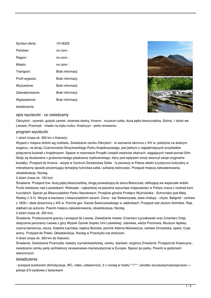 Symbol oferty: 10/18325 Państwo: no conv : Region: no conv : Miasto: no conv : Transport: Brak informacji Profil wyjazdu: Brak informacji Wyżywienie: Brak informacji Zakwaterowanie: Brak informacji Wyposażenie: Brak informacji świadczenia: opis wycieczki - co zwiedzamy Odrzykoń - rycerski, gotycki zamek, rezerwat skalny, Krosno - muzeum szkła, duża pętla bieszczadzka, Solina, 1 dzień we Lwowie, Przemyśl - miasto na styku kultur, Krasiczyn - perła renesansu program wycieczki 1 dzień (trasa ok. 300 km z Katowic) Wyjazd z miejsca zbiórki wg rozkładu. Zwiedzanie zamku Odrzykoń - to warownia obronna z XIV w. położona na skalnym wzgórzu, na skraju Czarnorzecko-Strzyżowskiego Parku Krajobrazowego, jest jednym z najpiękniejszych przykładów połączenia budowli z krajobrazem. Spacer w rezerwacie Prządki (zespół ostańców skalnych, sięgających nawet ponad 20m. Skały są zbudowane z gruboziarnistego piaskowca ciężkowickiego, który pod wpływem erozji stworzył swoje oryginalne kształty). Przejazd do Krosna - wizyta w Centrum Dziedzictwa Szkła - to pierwszy w Polsce obiekt turystyczno-kulturalny w interaktywny sposób prezentujący tematykę hutnictwa szkła i szklanej twórczości. Przejazd miejsca zakwaterowania, obiadokolacja. Nocleg. 2 dzień (trasa ok. 100 km) Śniadanie. Przejazd tzw. dużą pętlą bieszczadzką, drogą prowadzącą do serca Bieszczad, obfitującą we wspaniałe widoki. Punkt widokowy nad Lutowiskami. Wołosate - najbardziej na południe wysunięta miejscowości w Polsce znana z hodowli koni huculskich. Spacer po Bieszczadzkim Parku Narodowym. Przejście górskie Przełęcz Wyżniańska - Schronisko pod Małą Rawką (1,5 h). Wizyta w bacówce z bieszczadzkimi serami. Cisna - bar Siekierezada, stare chałupy - chyże. Baligród - cerkiew z 1829 r. obok dzwonnica z XIX w. Pomnik gen. Karola Świerczewskiego w Jabłonkach. Przejazd nad Jezioro Solińskie. Rejs statkiem po jeziorze. Powrót miejsca zakwaterowania, obiadokolacja. Nocleg. 3 dzień (trasa ok. 250 km) Śniadanie. Przekroczenie granicy i przejazd do Lwowa. Zwiedzanie miasta: Cmentarz Łyczakowski oraz Cmentarz Orląt; obejrzenie panoramy Lwowa z góry Wysoki Zamek (kopiec Unii Lubelskiej), starówka, wieża Prochowa, Muzeum Apteka, czarna kamienica, ratusz, Katedra Łacińska, kaplica Boimów, pomnik Adama Mickiewicza, cerkiew Ormiańska, opera. Czas wolny. Przejazd do Polski. Obiadokolacja. Nocleg w Przemyślu lub okolicach. 4 dzień (trasa ok. 350 km do Katowic) Śniadanie. Zwiedzanie Przemyśla: katedry rzymskokatolickiej, zamku, starówki, wzgórza Zniesienie. Przejazd do Krasiczyna zwiedzanie zamku perły architektury renesansowo-manierystycznej w Europie. Spacer po parku. Powrót w godzinach wieczornych. świadczenia - przejazd autokarem (klimatyzacja, WC, video, cafeservice), 3 x nocleg w hotelu **/***, ośrodku wczasowym/pensjonacie — pokoje 2/3-osobowe z łazienkami 1/2 - 3 x śniadanie, 3 x obiadokolacja - opieka pilota - ubezpieczenie: NNW (2 000€), KL (10 000€) i bagażu (200€) TUiR AXA S.A. cena nie zawiera - biletów wstępu do zwiedzanych obiektów oraz usług lokalnych przewodników (około 90 zł + 10 euro) - płatne obligatoryjnie w autokarze u pilota wycieczki - dopłata do pokoju jednoosobowego 120 zł TERMINY: CENNIK: Długość pobytu: dni Grupa cenowa: Waluta: PLN Aktualne ceny z systemu S.A.R.T. (-) - cena usługi, podatku kalkulowana przy osobie lub gratis (*) - kwota wliczona w cenę standardową 2/2