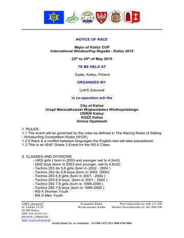 NOTICE OF RACE Major of Kalisz CUP International Windsurfing Regatta - Kalisz 2015 22th to 24th of May 2015 TE BE HELD AT Szale, Kalisz, Poland ORGANIZED BY: UJKS Szturwał in co-operation wih the City of Kalisz Urząd Marszałkowski Województwa Wielkopolskiego OSRiR Kalisz KOZŻ Kalisz Gmina Opatówek 1. RULES: 1.1 The event will be governed by the rules as defined in The Racing Rules of Sailing - Windsurfing Competition Rules (WCR). 1.2 If there is a conflict between languages the English text will take precedence. 1.3 This is an ISAF Grade 3 Event for the RS:X Class 2. CLASSES AND DIVISIONS - UKS girls ( born in 2003 and younger sail to 4,5m2) - UKS boys (born in 2003 and younger, sail to 4,5m2) - Techno 293 do 5,8 girls (born in 2002 - 2004 ) - Techno 293 do 5,8 boys (born in 2002 -2004) - Techno 293 6,8 girls (born in 2001 - 2004 ) - Techno 293 6,8 boys (born in 2001 - 2004 ) - Techno 293 7,8 girls (born in 1999-2000 ) - Techno 293 7,8 boys (born in 1999-2000 ) - RS-X Women Youth - RS-X Men Youth UJKS „Szturwał” ul. Łódzka 19-29 62-800 Kalisz NIP: 618-18-52-335 REGON: 250668320 http://www.szturwal.pl Komandor Klubu: Wicekomandor Klubu: Piotr Gulczyński tel. 668-111-200 Monika Niewiadomska tel. 662-088-500 Kredyt Bank SA, nr rachunku: 24 1500 1432 1214 3000 8786 0000 - RS-X Women - RS-X Men - Raceboard Women - Raceboard Men - Raceboard Masters A minimum of 5 competitors is required to constitute a division. 3. ENTRIES 3.1 All the competitors must contact with the organizer at [email protected] before the 15th of May to confirm their participation. Applications received later will cause increased entry fee of 10 PLN The entry fees will be paid at the moment of the registration in the Race Office. 4. ENTRY FEES: The entry fees are: UKS – 40 PLN, Techno – 60 PLN , RS:X and Raceboard- 70PLN 5. ENTRY: The following shall be presented upon registration: - Original Regatta Entry Form. It will be available on the event website www.szturwal.pl from the 1st of April 2015 - Payment of the entry fees. - Federation License (for the Polish sailors) - Evidence of valid third party liability insurance 6. RACE FORMAT 6.1 A maximum of 11 races shall be sailed. No more than 4 races per day will be sailed. The event will be valid if 3 or more races are completed. 6.2 Different classes may race together depending on entry numbers. 6.3 On the 31st of May the last warning signal can’t be given later than at 14.30hrs 7. SCHEDULE Thursday 28th of May – Arrival Friday 29th of May : 08.00-09.30 Registration 11.00 – Opening Ceremony 12.00-17.00 Racing Saturday 30th of May : UJKS „Szturwał” ul. Łódzka 19-29 62-800 Kalisz NIP: 618-18-52-335 REGON: 250668320 http://www.szturwal.pl Komandor Klubu: Wicekomandor Klubu: Piotr Gulczyński tel. 668-111-200 Monika Niewiadomska tel. 662-088-500 Kredyt Bank SA, nr rachunku: 24 1500 1432 1214 3000 8786 0000 10.00-16.00 Racing 18.00 – Barbecue Sunday: 31st of May : 10.00 Racing 14.30 Last warning signal 16.30 Prize Giving Ceremony 8. SAILING INSTRUCTIONS The sailing instructions will be available upon registration. 9. IMAGE RIGHTS AND ADVERTISING Boards may be required to display advertising chosen and supplied by the organizing authority. The competitors, in registering for the event grant to the Organising Authority free from charge and in perpetuity the competitors image rights, defined as the right and license to us the name, likeness, photographic or other image of any crew member involved in the Major of Kalisz CUP International Windsurfing Regatta. 10. PRIZES TOTAL SUM OF AWARDS: 5.000,00 Euro 11. DISCLAIMER OF LIABILITY Competitors take part in all races at their own risk. The Organising Authority, or any of their officials or representatives or sponsors or their officials or representatives are not responsible, under any circumstances, for any damage, loss or injury either ashore or on the water either to persons or equipment, which may result. Participation in this event, supporting events and in each race in them is at the sole discretion of the sailor and at his/her own risk.. 12. ACCOMODATION The organizer will provide accommodation and meals for all foreign participants free of charge CONTACT: Uczniowski Jacht Klub Sportowy „ Szturwał” ul. Łódzka 19-29, 62-800 Kalisz,Poland e.mail- [email protected] tel: + 48 601433186 www.szturwal.pl www.facebook.com/szturwalkalisz UJKS „Szturwał” ul. Łódzka 19-29 62-800 Kalisz NIP: 618-18-52-335 REGON: 250668320 http://www.szturwal.pl Komandor Klubu: Wicekomandor Klubu: Piotr Gulczyński tel. 668-111-200 Monika Niewiadomska tel. 662-088-500 Kredyt Bank SA, nr rachunku: 24 1500 1432 1214 3000 8786 0000