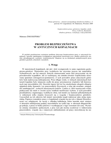 Dzieje górnictwa – element europejskiego dziedzictwa kultury, t. 2 pod red. P.P. Zagożdżona i M. Madziarza, Wrocław 2009 bezpieczeństwo pracy, górnictwo, kopalnie, antyk, Grecy, Celtowie, Rzymianie, obudowy górnicze, wentylacja, wody podziemne Mateusz ŻMUDZIŃSKI 1 PROBLEM BEZPIECZEŃSTWA W ANTYCZNYCH KOPALNIACH W artykule przedstawiono ważniejsze problemy dotyczące bezpieczeństwa pracy w antycznych kopalniach i sposoby zapobiegania występującym zagrożeniom (stosowanie m.in. obudów górniczych, machin odwadniających, systemów wentylacyjnych). Skupiono się na działaniach podejmowanych przez górników greckich, celtyckich i rzymskich. 1. Wstęp W starożytnych kopalniach, tak jak i dziś występowały te same zagrożenia geologiczno-górnicze. Wprawdzie przy wydobyciu nie używano jeszcze ani materiałów wybuchowych, ani też maszyn, których zastosowanie może dziś przyczyniać się do powodowania wypadków, ale co ważniejsze, nie istniała również współcześnie stosowana aparatura ostrzegawczo-pomiarowa. Z tych powodów praca antycznych górników była nadzwyczaj niebezpieczna. Przez długie wieki, w różnych starożytnych kulturach kopalnie były miejscem zsyłki do pracy przymusowej więźniów lub kierowanych tam niewolników [6]. Niewiele lepszy był też los niesłychanie ubogich chłopów egipskich doby faraonów, czy pracowników fizycznych, a więc jak uważano „niegodnie zarabiających”, wolnych starożytnych Greków. Ludzie ci, choć teoretycznie wolni, praktycznie nie mieli w swoim życiu wielkich możliwości wyboru. Z tych powodów przedsiębiorcy organizujący wydobycie złota, rud metali czy kamieni półszlachetnych w znikomym tylko stopniu troszczyli się o wygodę i bezpieczeństwo górników. Uszczerbek na ich zdrowiu lub śmierć niewolnika mogli traktować jako stratę materialną. Poprawa warunków pracy w kopalniach wiązała się nie tyle z ideami filozoficznymi czy religijnymi, ile raczej z chłodną kalkulacją, która musiała mieć miejsce w okresach zmniejszonej podaży niewolników na rynku (np. w okresach długotrwałego pokoju, a przez to braku jeńców) i wynikającym z tego wzrostem ich ceny. Wyraźne zmiany stosunków społecznych, a przy tym jak można oczekiwać w traktowaniu pracowników, wiązały się z masowym odchodzeniem od pracy niewolniczej ku na1 Instytut Historyczny Uniwersytetu Wrocławskiego. Problem bezpieczeństwa w antycznych kopalniach 381 jemnej, co następowało w dobie pryncypatu, a szczególnie w III wieku n.e., w cesarstwie rzymskim. Jednocześnie jednak, obok pracowników kontraktowych, w kopalniach pracowali więźniowie (por.[3]). Ponieważ w odróżnieniu od zakupionych niewolników byli oni darmową siłą roboczą, dlatego też nie przejmowano się warunkami ich egzystencji i pracy, a spotykające ich wypadki można było uważać za elementy kary. Z powyższych względów problem bezpieczeństwa górników, a zarazem kopalni spoczywał w znacznej mierze na barkach samych zainteresowanych, ewentualnie właściciela niewolników, czy nadzorcy więźniów. Inne zupełnie warunki dotyczyły osób zatrudnianych za opłatą, z którymi spisywano szczegółowe kontrakty dotyczące warunków pracy i płacy (por. [5, 9]). W kwestii bezpieczeństwa w takich kontraktach, podobnie jak i w umowach dotyczących dzierżaw złóż, można było wymagać od pracowników stosowania technik eksploatacji zapewniających utrzymanie kopalni w dobrym stanie, umożliwiających bezawaryjne prowadzenie wydobycia. Zobowiązując się do tego górnicy wymagali m.in. zapewnienia im względnie dobrych warunków pracy. Zachowane antyczne kopalnie, a także związane z wydobyciem zabytki ruchome unaoczniają nam warunki pracy dawnych górników, czyhające na nich niebezpieczeństwa oraz sposoby zapobiegania im. Pomijamy przy tym kwestie konfliktów etnicznych i społecznych, sprawy kryminalne oraz ewentualne problemy polityczne. Mamy jednak świadomość, iż mimo braku źródeł na ich temat, tego rodzaju zagrożenia z pewnością też musiały mieć miejsce, jednak na razie rozważania w tej dziedzinie pozostają w sferze luźnych, pozanaukowych spekulacji. 2. Wyrobiska górnicze i ich zabezpieczenie Zdaniem J. Wielowiejskiego przez całe wieki górnicy greccy unikali głębienia dłuższych chodników ze względu na trudności z ich zabezpieczeniem i wentylacją [10]. Z tego powodu, chcąc udostępnić złoże, drążyli szereg pionowych lub pochyłych szybów. Nachylenie takich szybów dochodziło do 60°, a czasami i 80°. W rejonie wydobycia srebra w Laurionie w Attyce (od V w. p.n.e.), jak się szacuje, drążono około 14 szybów na 1 km2. Były one jednak bardzo nieregularne, pracujący w nich górnicy zmuszeni byli do pokonywania przewężeń, uderzali o występy skalne, lub pracowali w obszernych, a przez to grożących zawaleniem komorach [10]. Wchodząc zaś do o kilka wieków od nich młodszych rzymskich kopalń, położonych na obszarach dawnej Dacji (II i III w. n.e.), zauważa się zestandaryzowanie kształtu i rozmiarów sztolni [4]. W przypadku, gdy wyrobisko drążono w twardej skale miało ono wyrównany spąg szerokości 65 cm, wysokość 170 cm, ociosy nachylone u góry ku środkowi i zaokrąglony strop szerokości 50 cm. W sytuacjach, gdy wyrobiska zakładano w mniej zwartych skałach, były one niemal dwukrotnie szersze (120 cm). Podobnie jak wymienione wcześniej miały one wysokość 170 cm, jednak różniły się kształtem stropu. W tych – był on płaski, zaś tuż poniżej stropu znajdowały się podłużne gniazda (rowki w ociosach), wykorzystywane do osadzenia obudowy stropnicami, składającej się z belek o grubości około 5 cm i desek. Korytarz był przez to nieznacznie niższy (ok. 165 cm 381 382 Mateusz ŻMUDZIŃSKI wysokości) i miał przekrój trapezowy. Jego szerokość przy stropie wynosiła 80 cm. Inny rodzaj wyrobisk drążono w skałach uznawanych za wyraźnie niebezpieczn